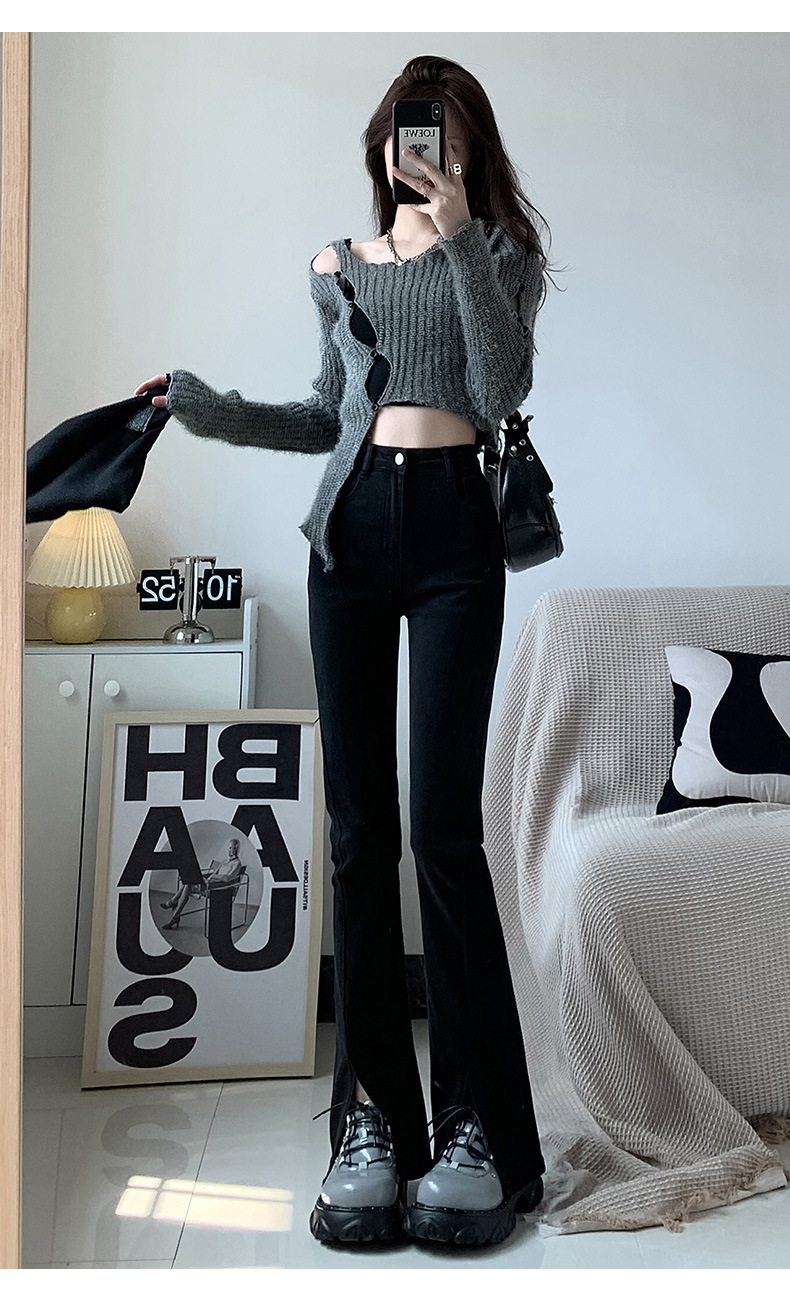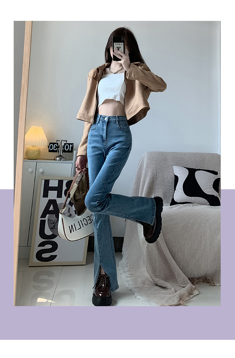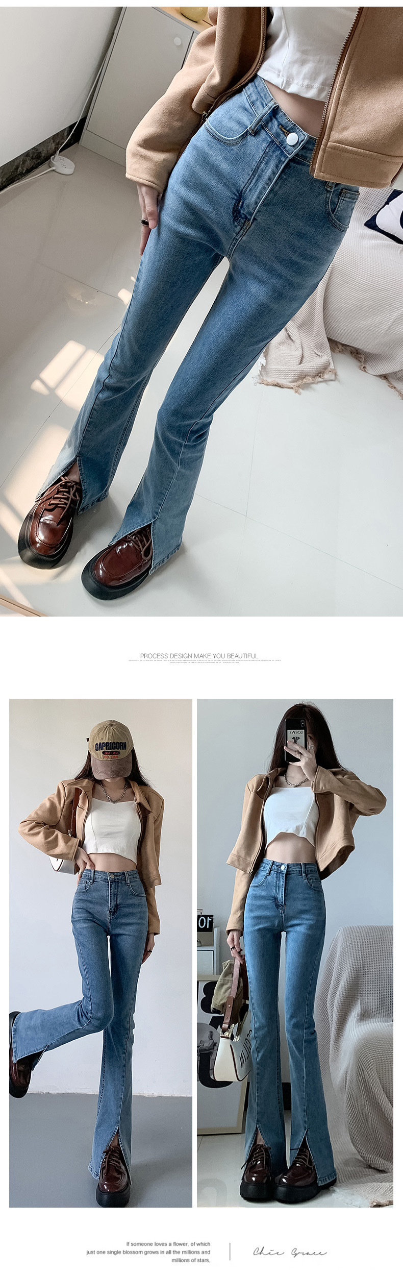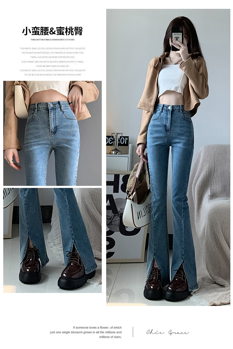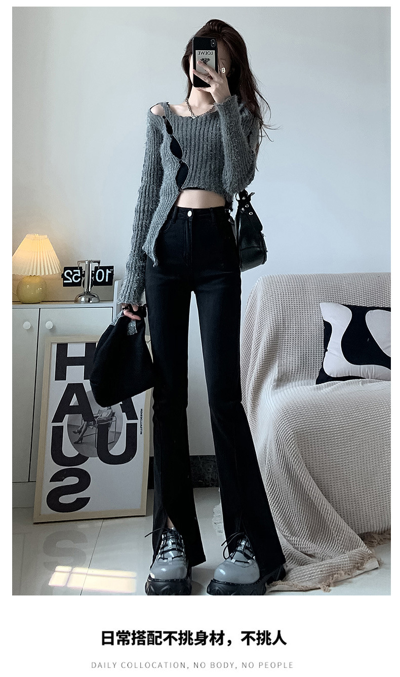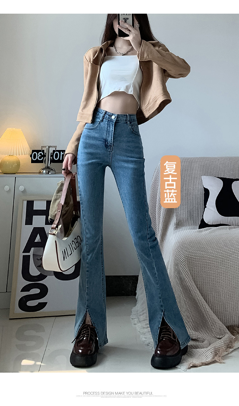 블랙 마이크로 플레어 스플릿 청바지 여성용 봄 한국식 하이 웨이스트 슬림 핏 슬리밍 탄성 루즈 와이드 레그 바지스토어 가기