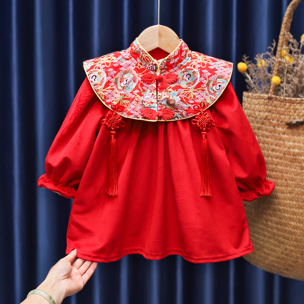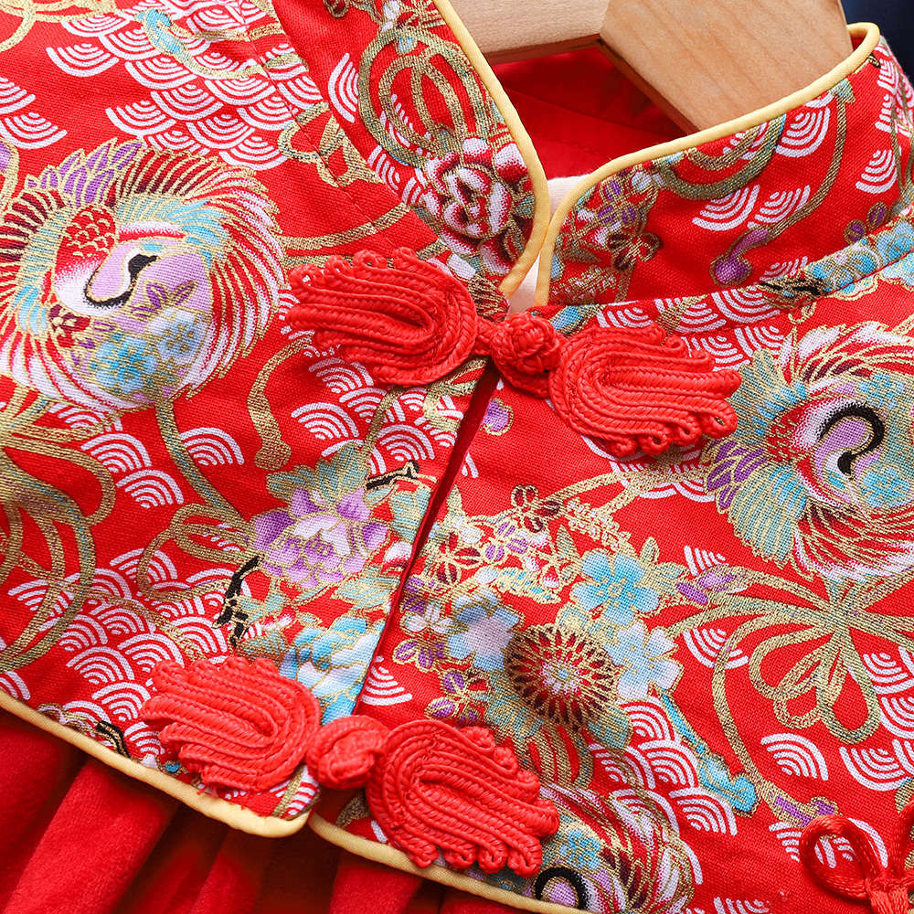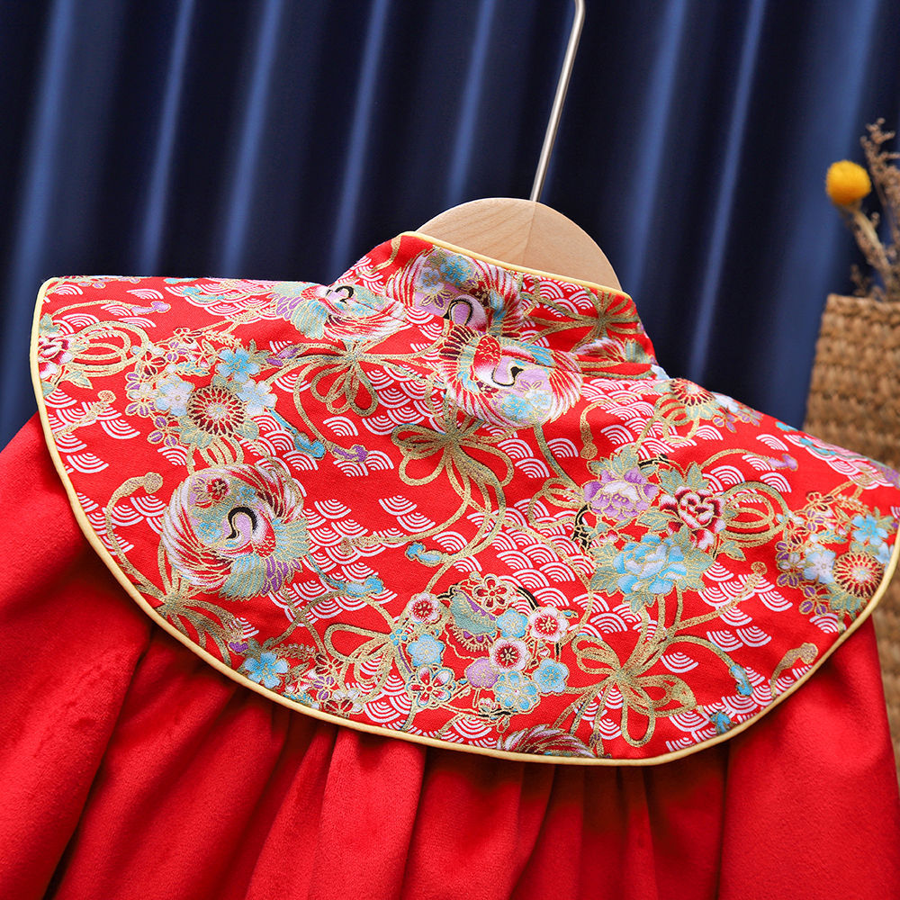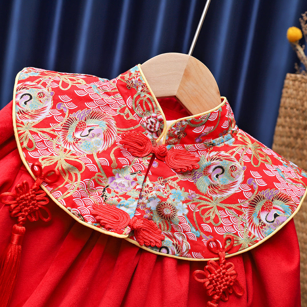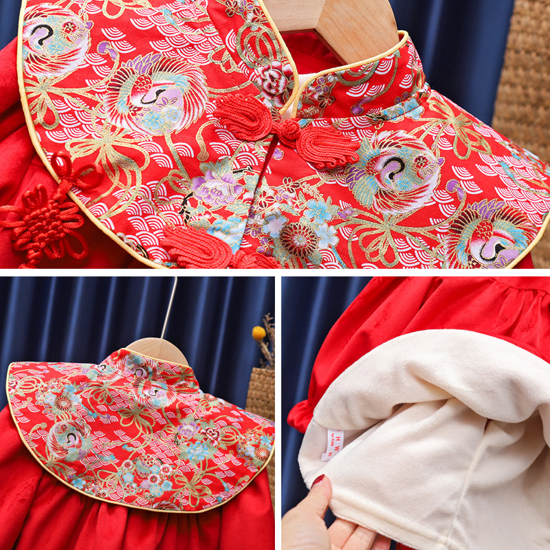 유행 귀여운 소녀의 기모 원피스 가을과 겨울 아기 1 세 원피스 외국 스타일 공주 중국 스타일 새해 복 많이 받으세요