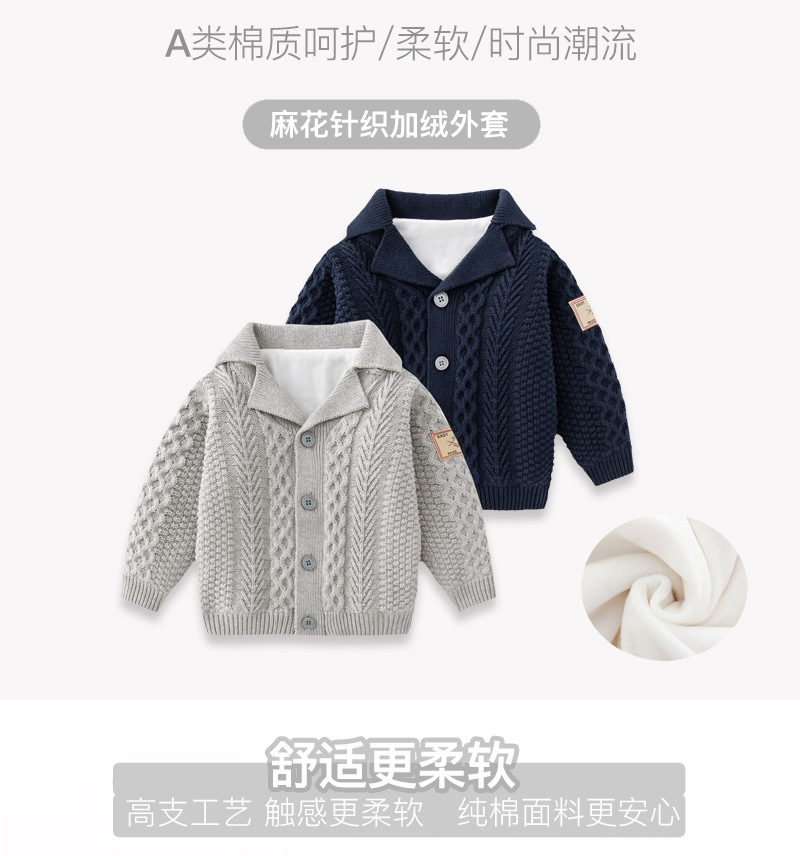 가을 겨울 아기 모직 스웨터 플러스 벨벳 재킷 유럽 및 미국 스타일 어린이 따뜻한 니트 가디건 세련된 100일 및 1세 겨울 의류스토어 가기