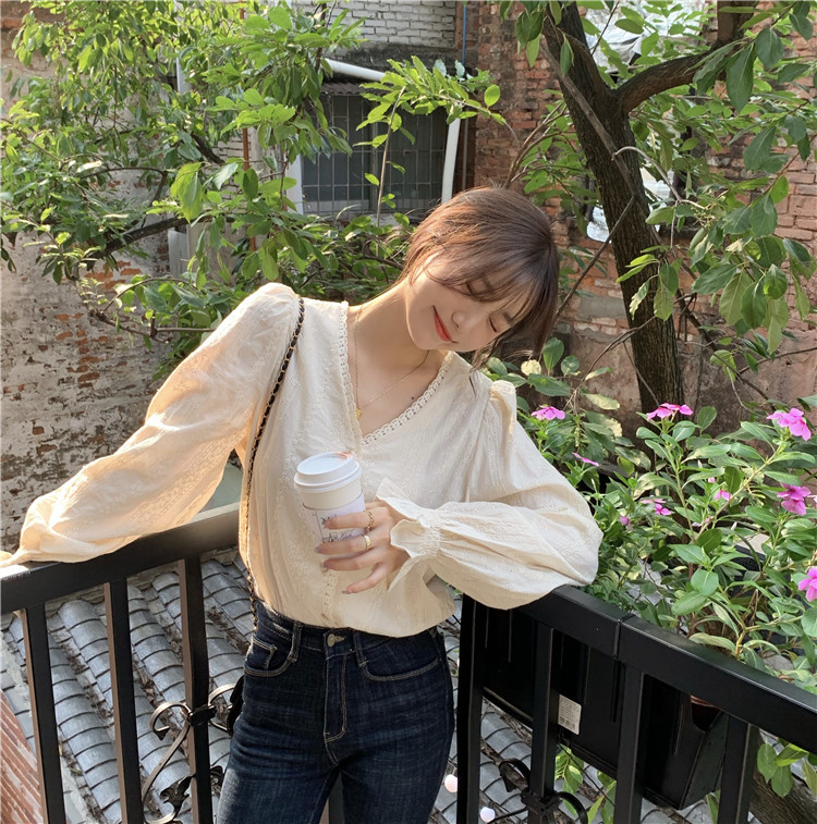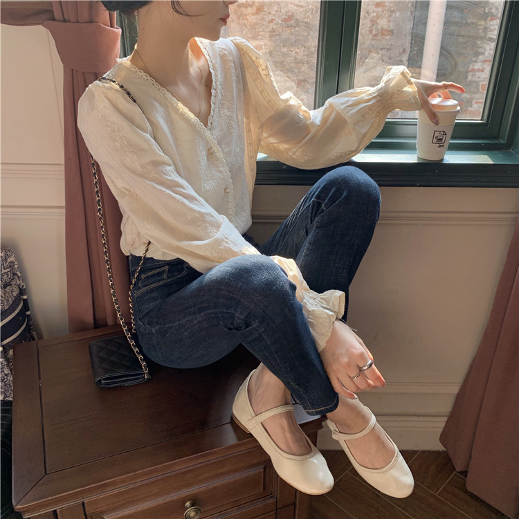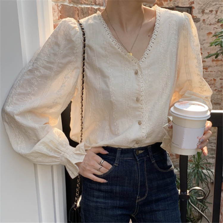 부드러운 V-넥 느슨한 랜턴 슬리브 셔츠 여성의 봄과 가을 2023 새로운 프랑스 스타일 디자인 감각 우아한 긴 소매 셔츠스토어 가기