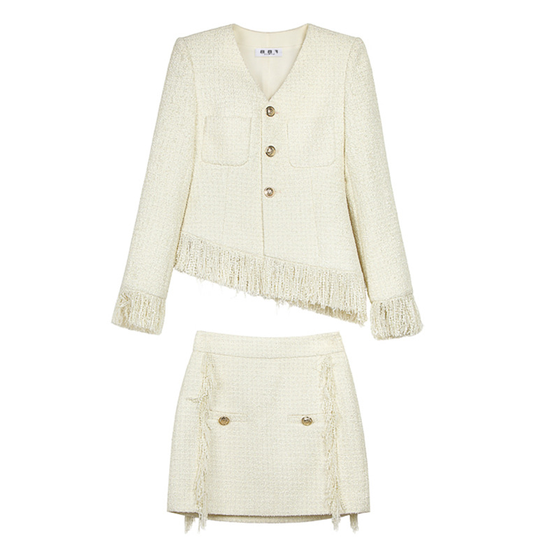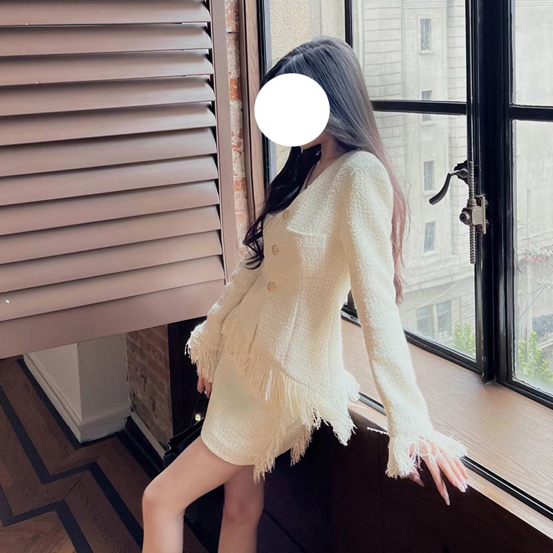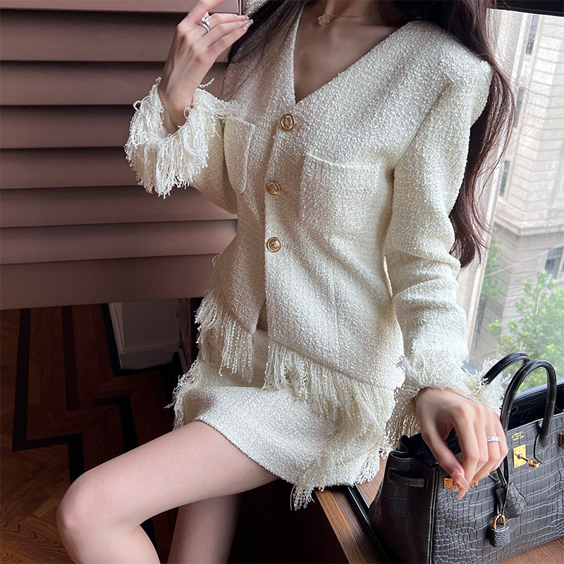 새로운 수제 솔질 술 작은 향기 스타일 세트 짠 숙녀 우아한 V-넥 코트 탑 + 스커트스토어 가기