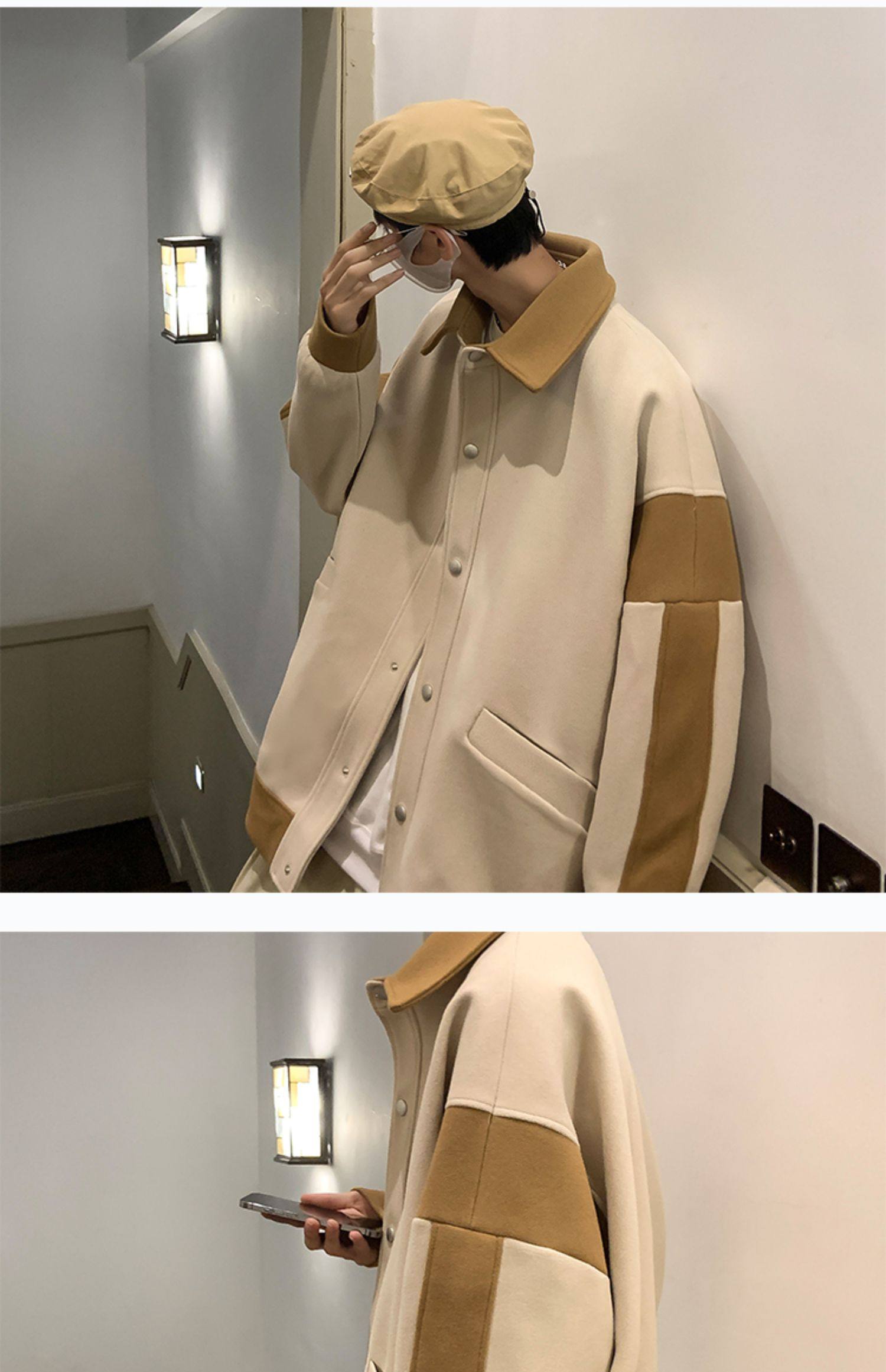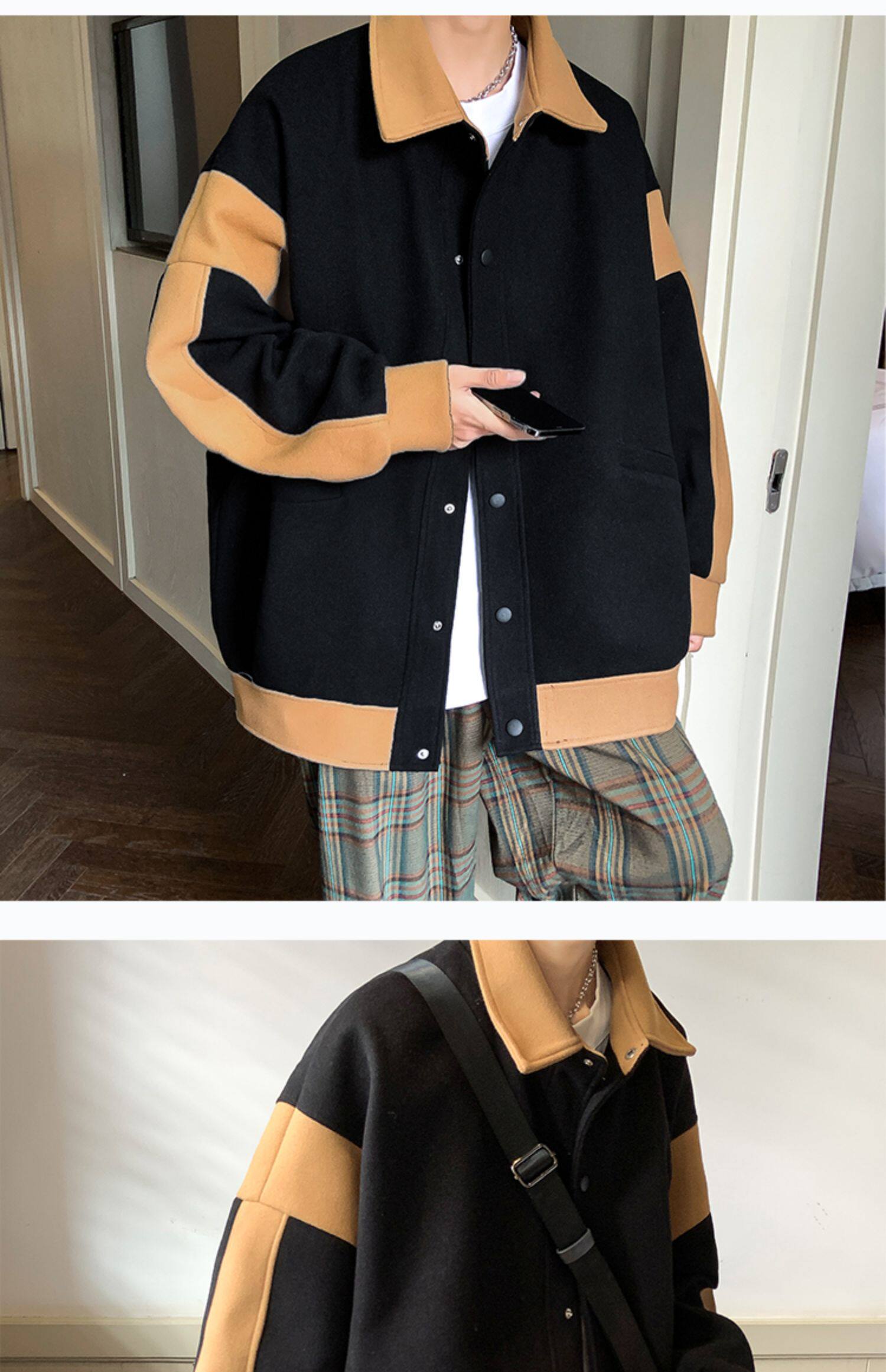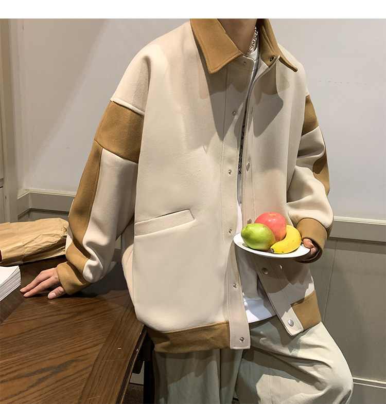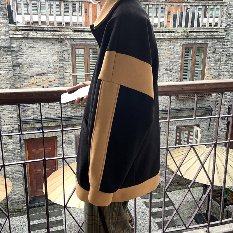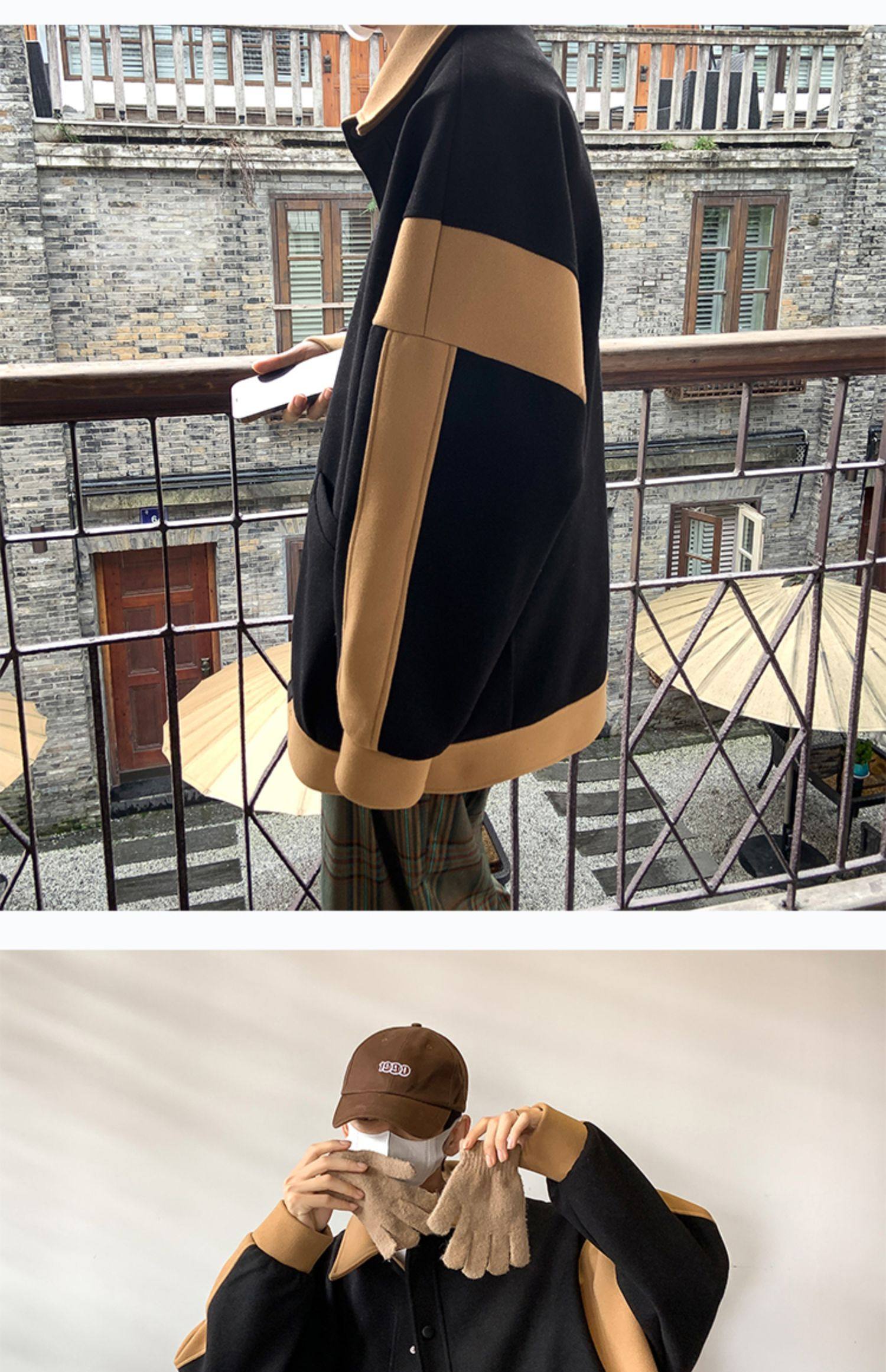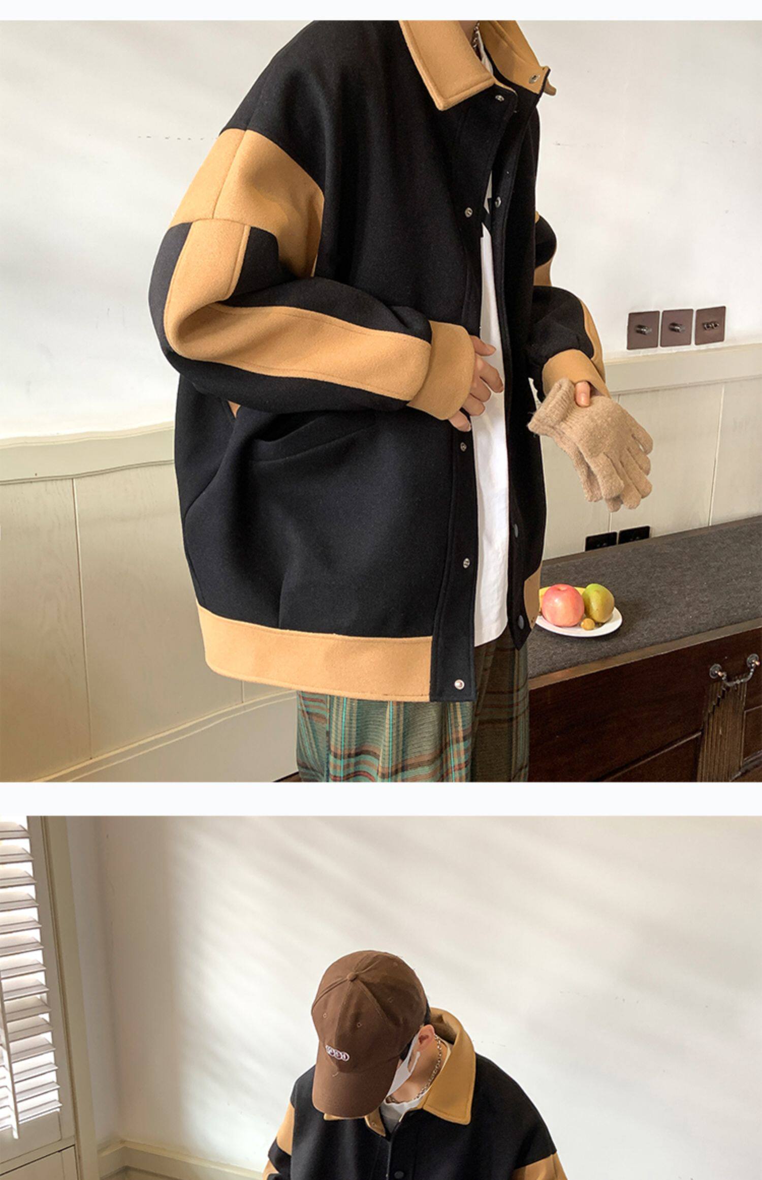 潮牌拼色毛呢外套男oversize美式高街个性上衣vibe流行帅气夹克男