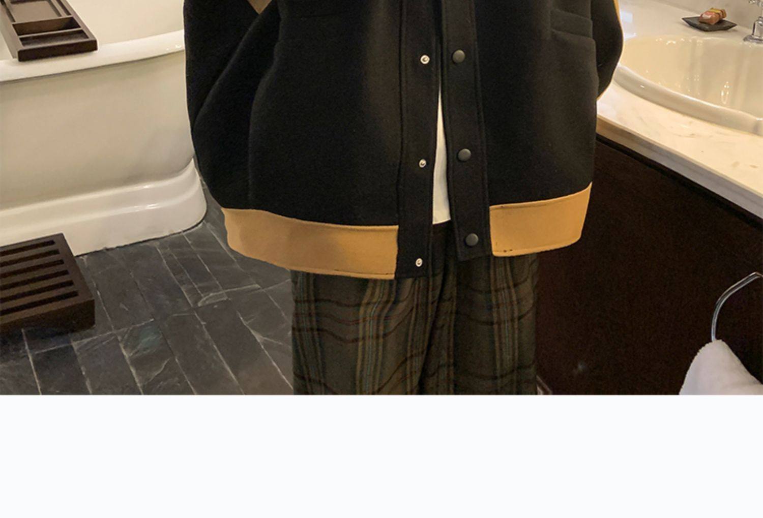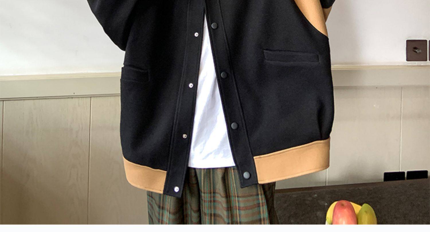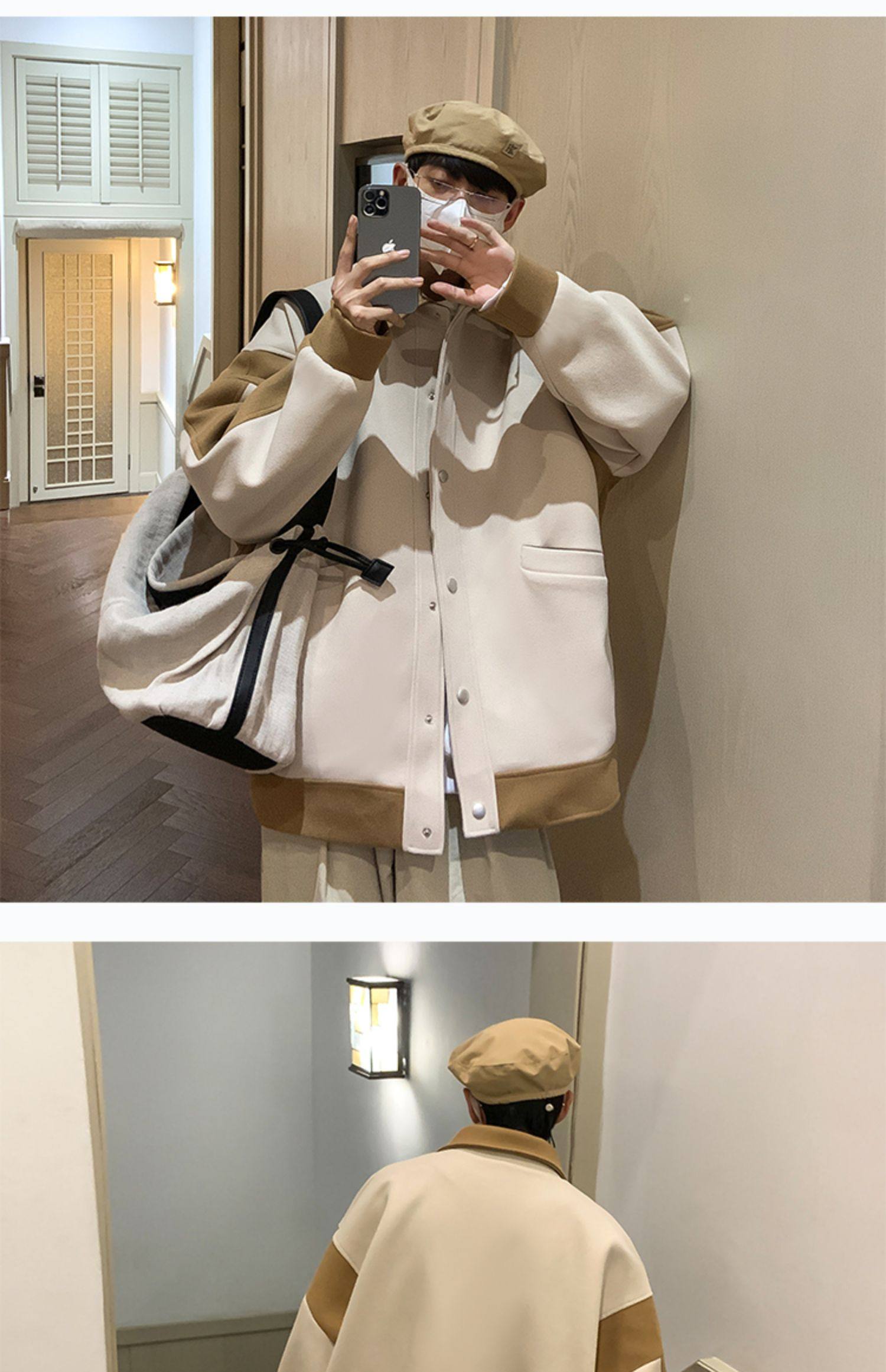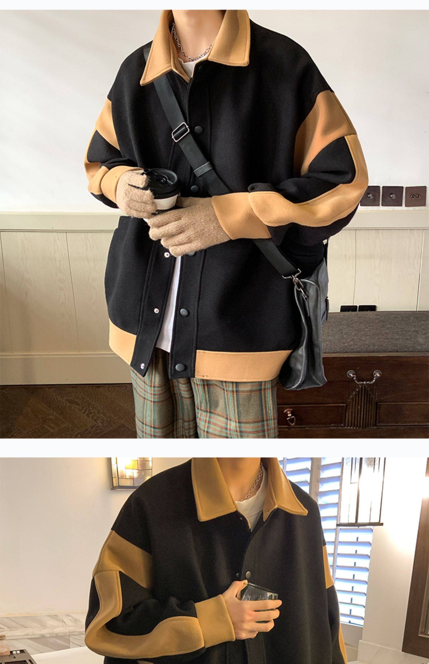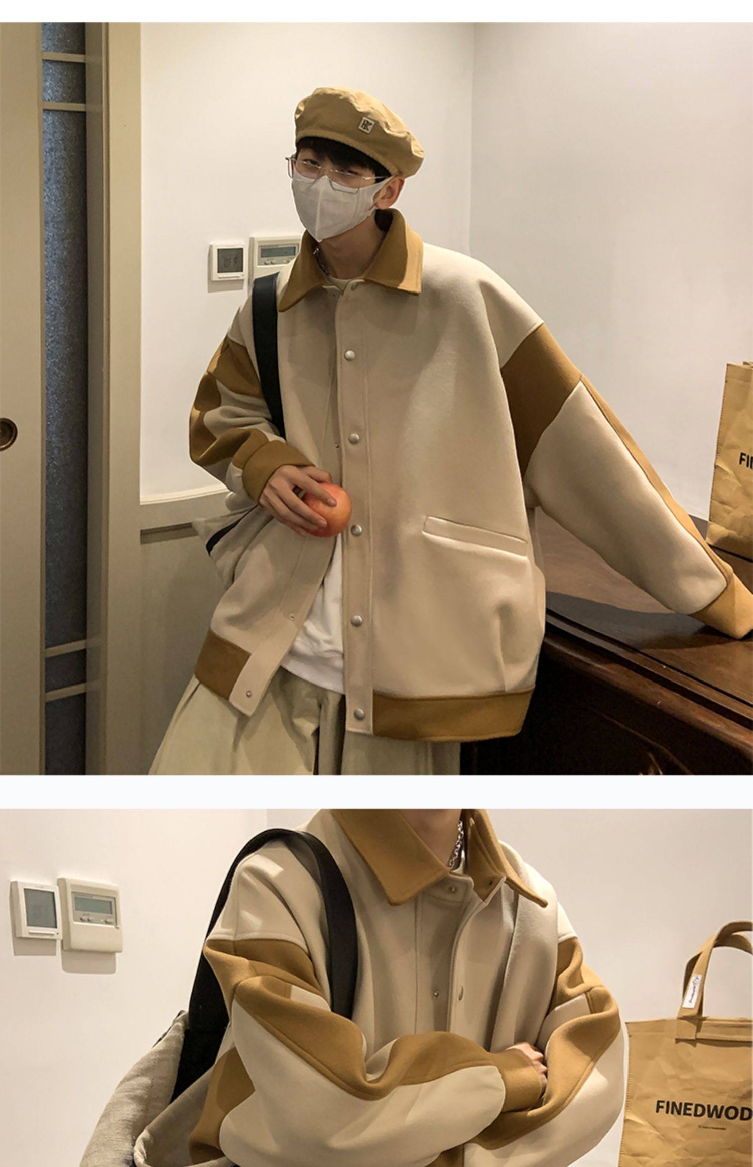 潮牌拼色毛呢外套男oversize美式高街个性上衣vibe流行帅气夹克男