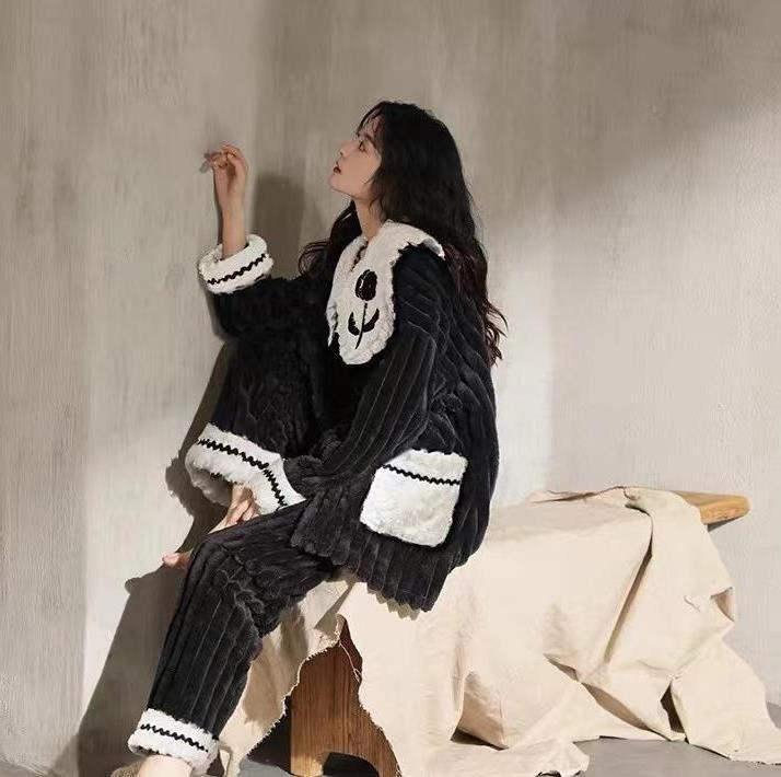 두꺼운 산호 양털 수 놓은 플란넬 세트 따뜻한 남자의 가정 의류 여자의 커플 잠옷 여자의 가을과 겨울 신상품