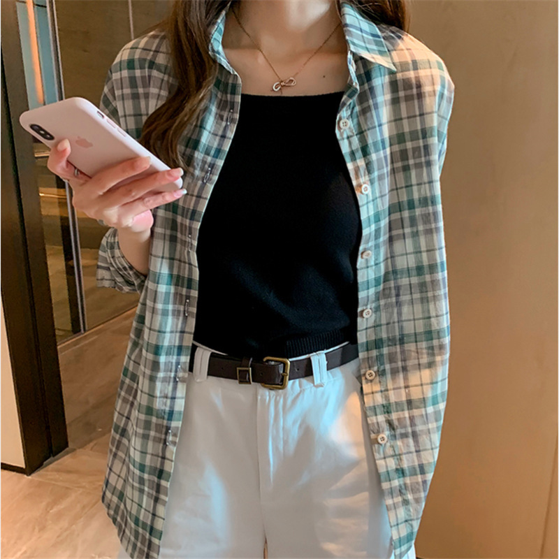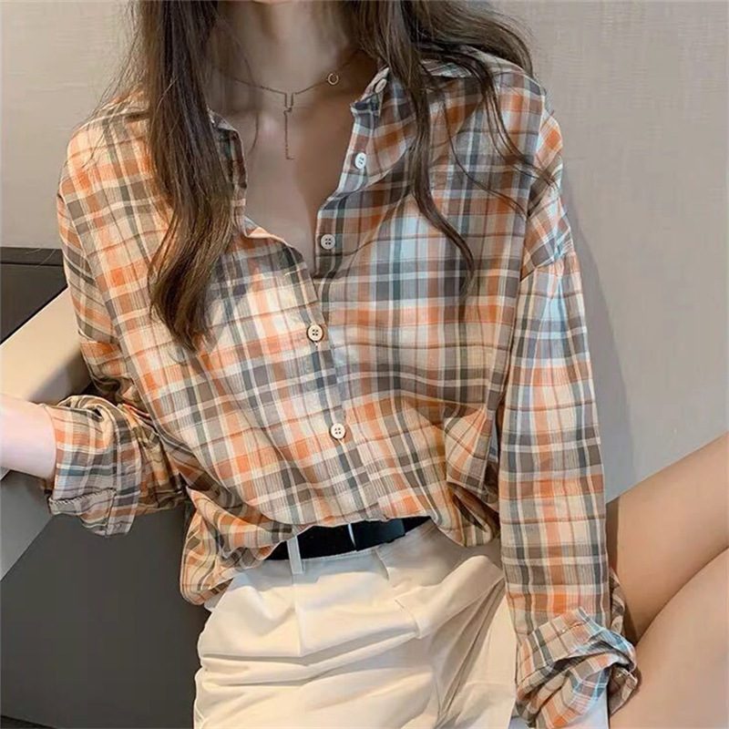 가을 새로운 빈티지 문학 스타일 격자 무늬 셔츠 여성의 부드러운 스타일 얇은 느슨한 패션 모든 매치 긴팔 셔츠스토어 가기