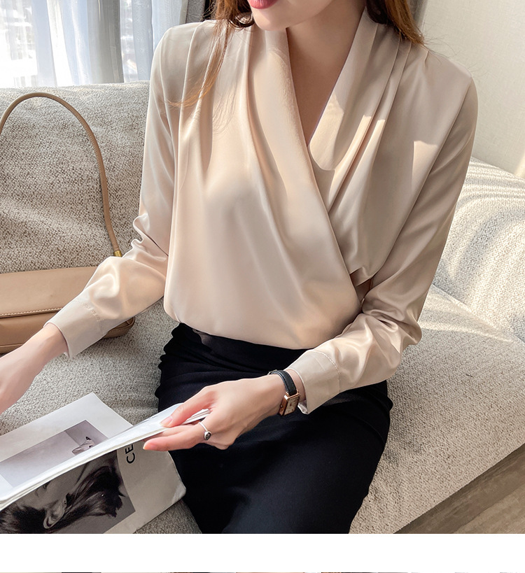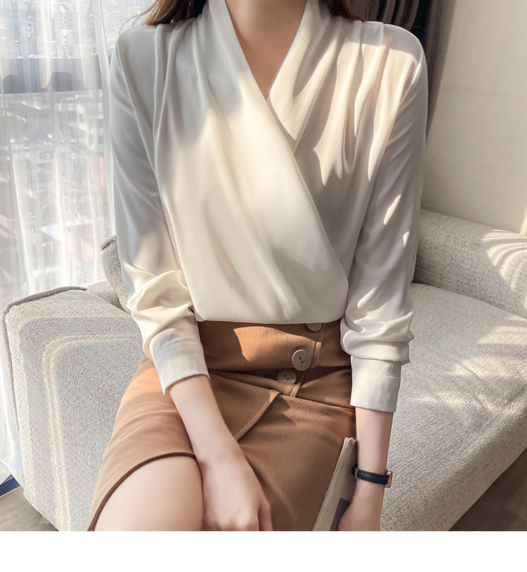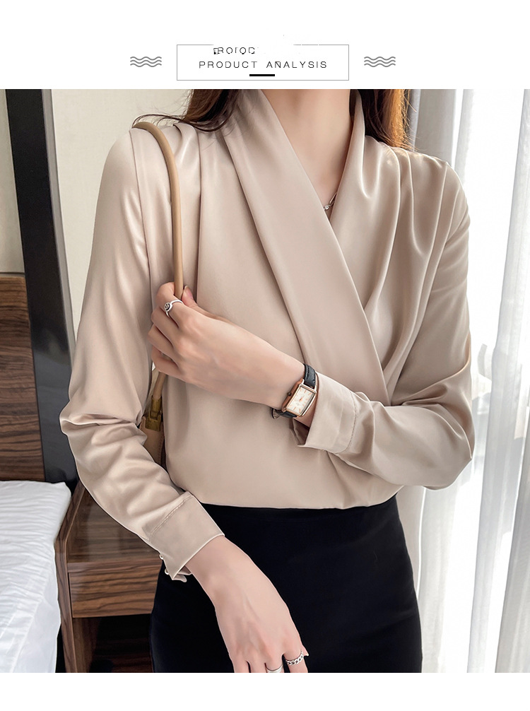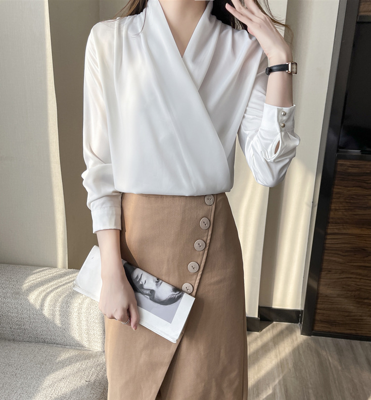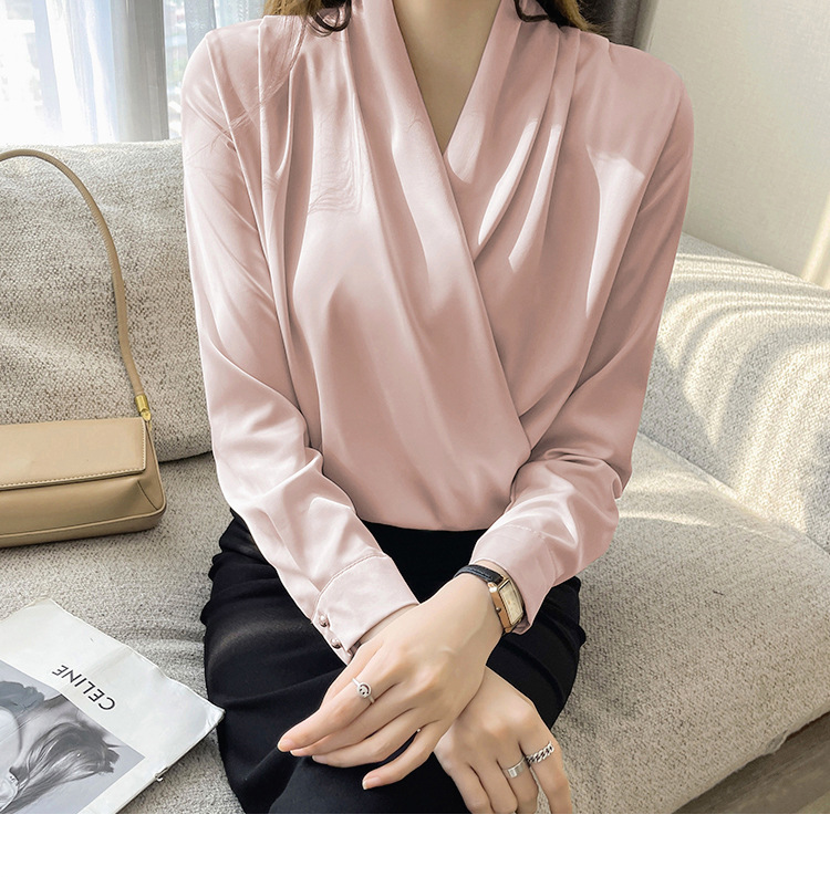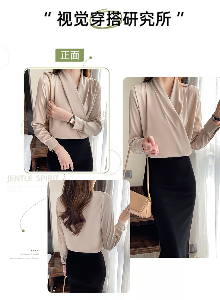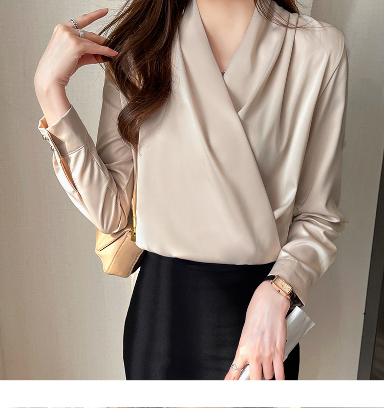 세련된 여성용 셔츠 2025 봄 가을 신상 디자인 감각 있는 크로스 브이넥 긴팔 다용도 새틴 탑스토어 가기