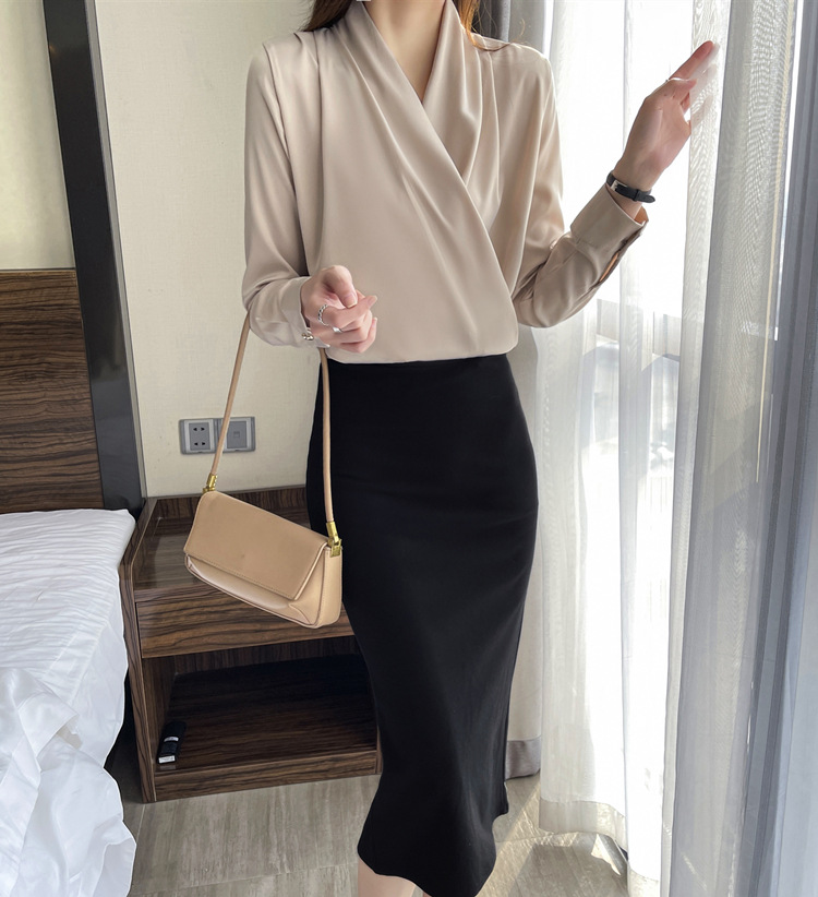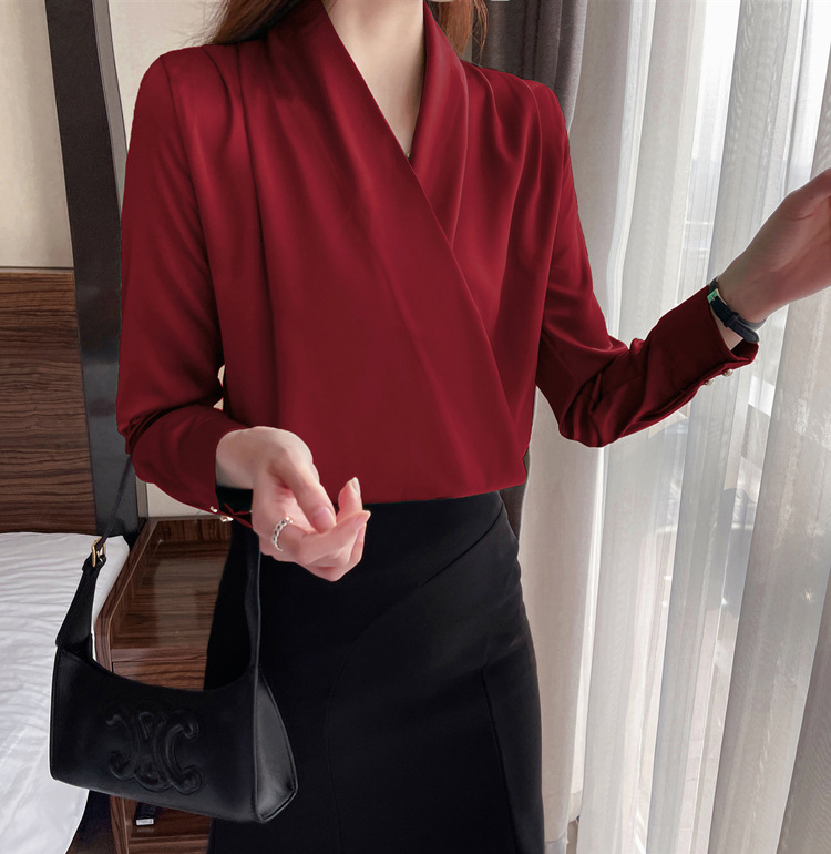 세련된 여성용 셔츠 2025 봄 가을 신상 디자인 감각 있는 크로스 브이넥 긴팔 다용도 새틴 탑