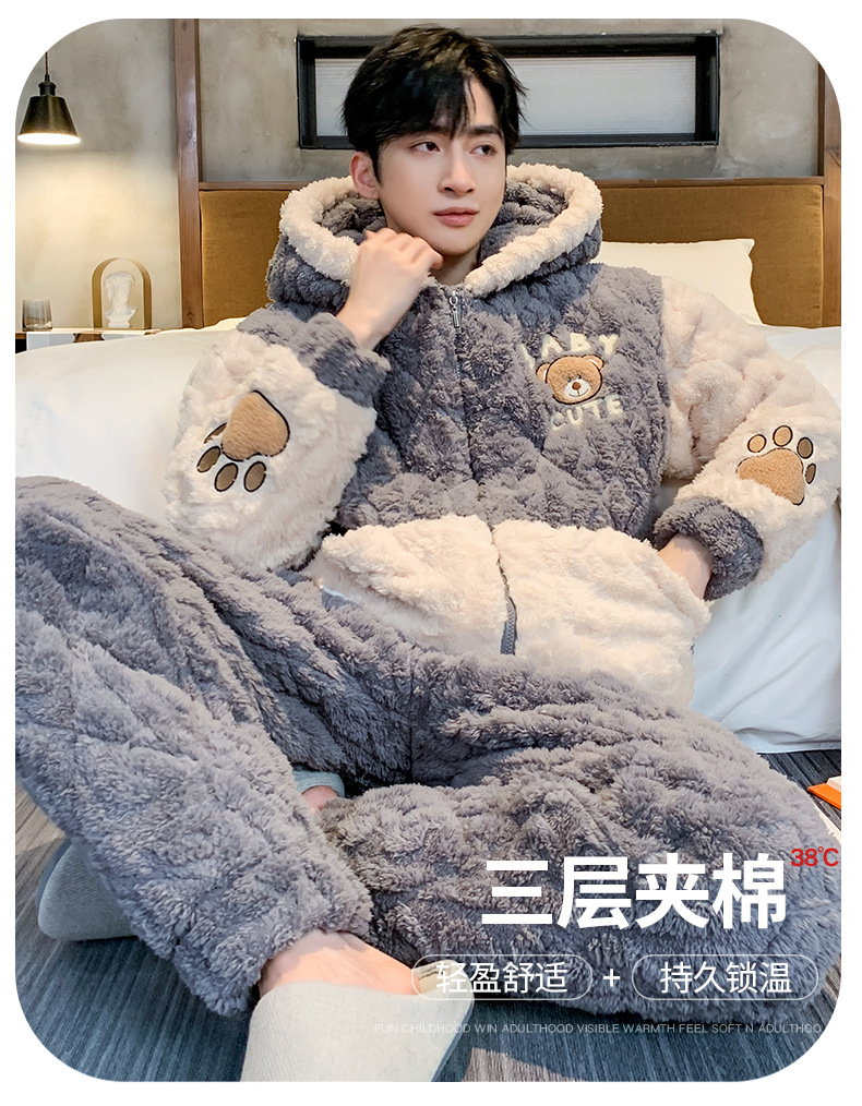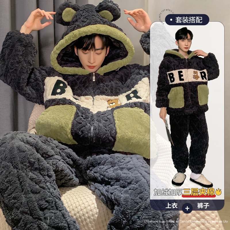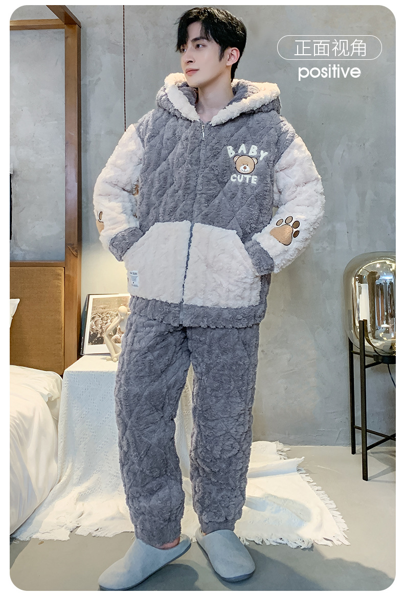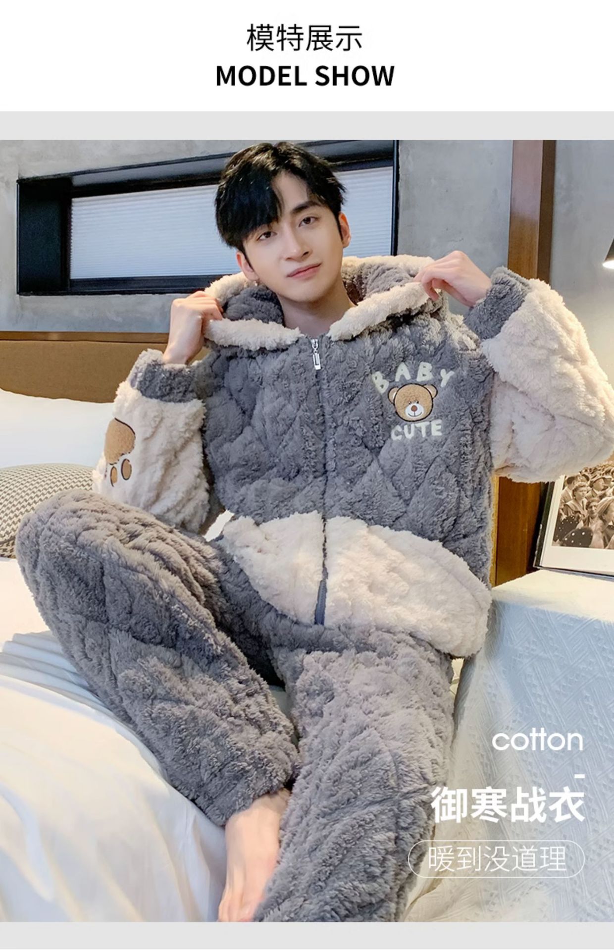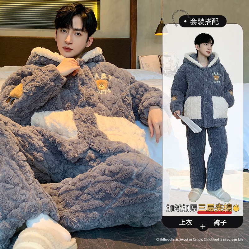 겨울 두꺼운 벨벳 3겹 누비 따뜻한 산호 벨벳 가을 겨울 남성용 잠옷 남성용 지퍼 홈웨어 세트스토어 가기