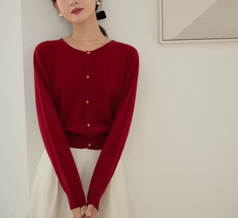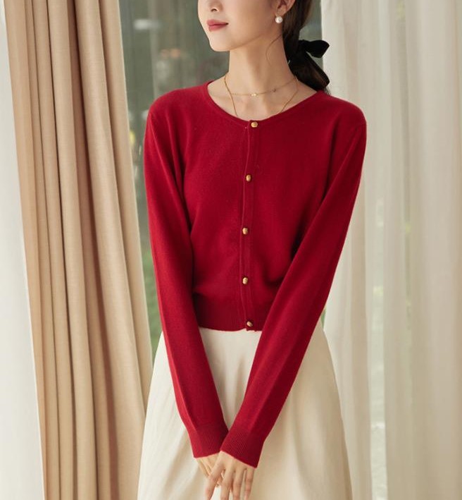10 월 코트 프랑스 로맨틱 레이디 스타일 라운드 넥 골드 메탈 버클 짧은 빈티지 레드 작은 가디건