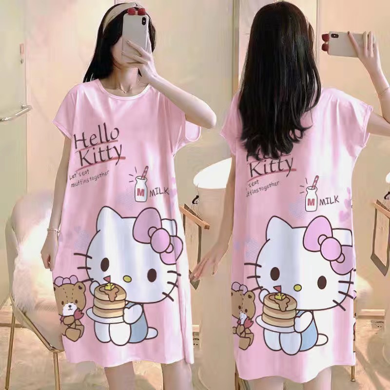 잠옷 여자의 여름 반팔 얇은 잠옷 만화 양면 워터 마크 귀여운 느슨한 잠옷 느슨한 중간 길이 원피스 가정 옷스토어 가기