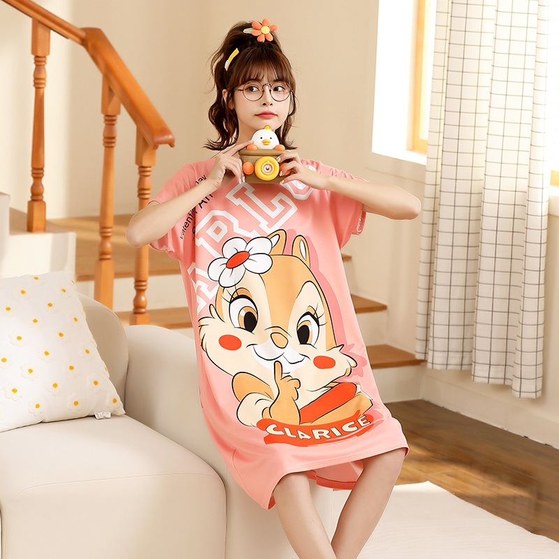 잠옷 여자의 여름 반팔 얇은 잠옷 만화 양면 워터 마크 귀여운 느슨한 잠옷 느슨한 중간 길이 원피스 가정 옷