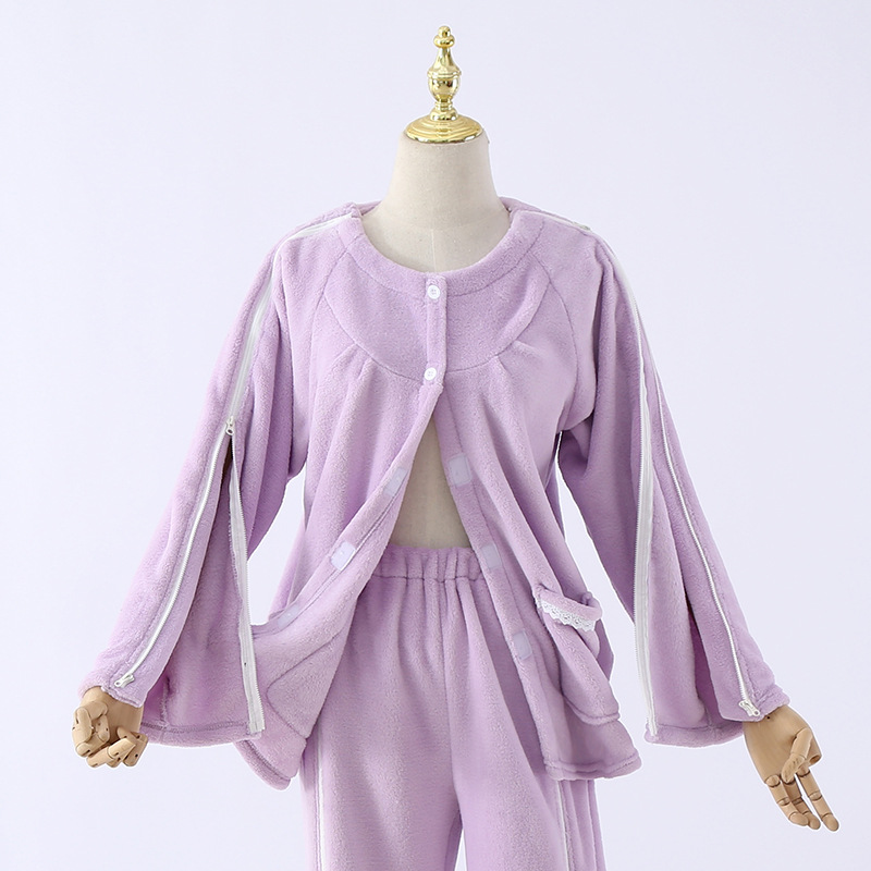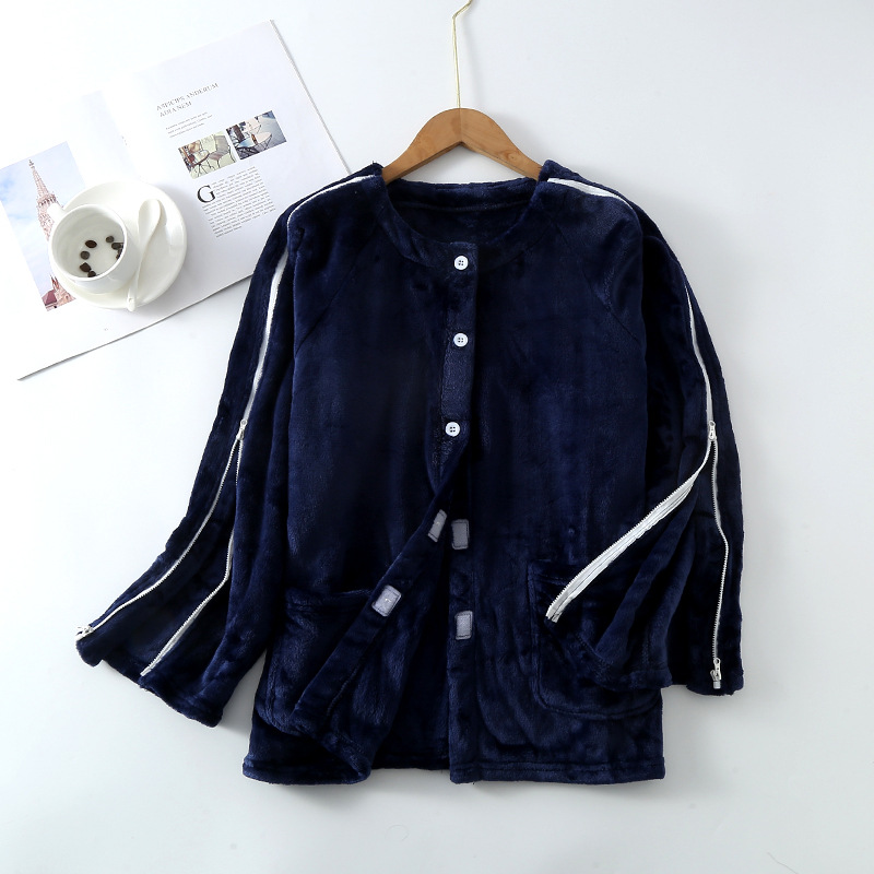 남성 및 여성 성인 착용 및 벗기 쉬운 잠옷 아픈 산호 양털 원피스 홈 의류 카디건 통기성 간호 의류 골절