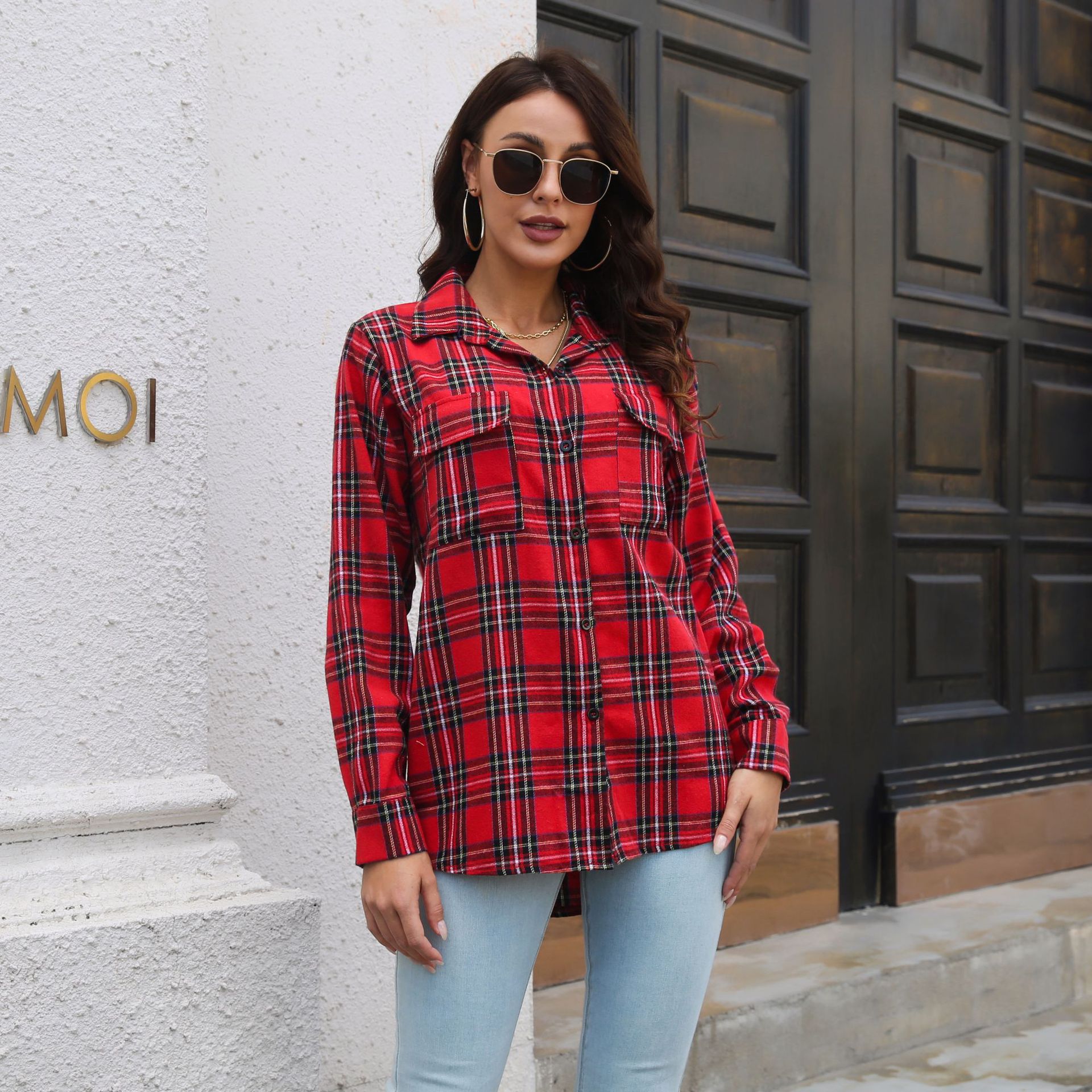 격자 무늬 셔츠 칫솔질 긴 소매 중간 길이의 느슨한 셔츠 여성 최고 신상품 인 아마존 유럽 및 미국 국경 여성 의류