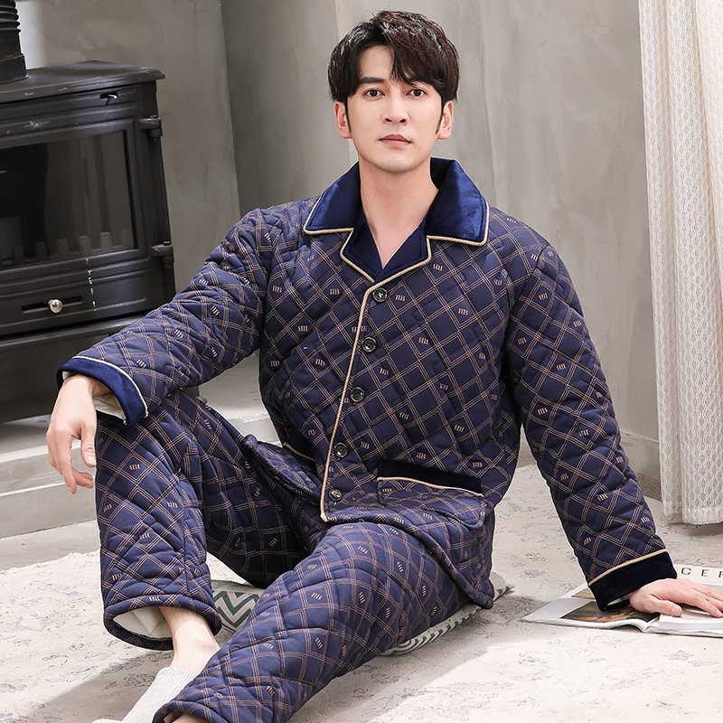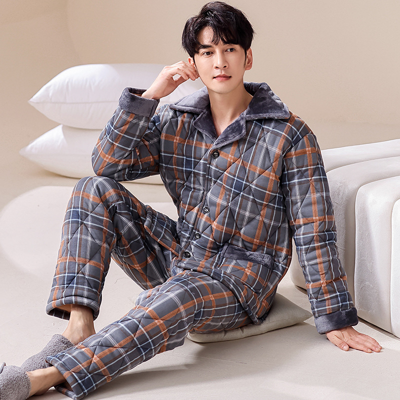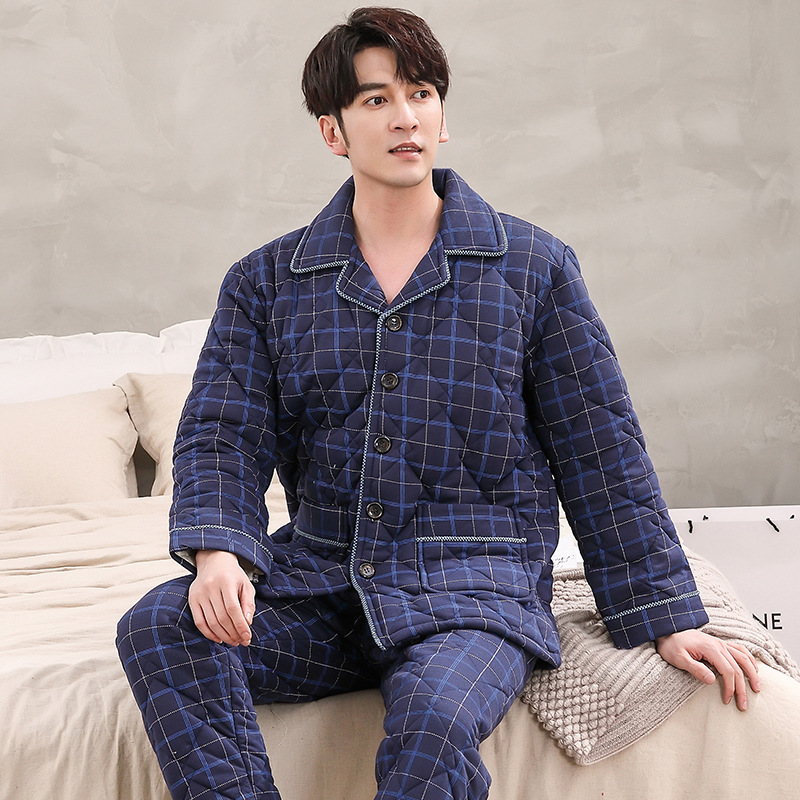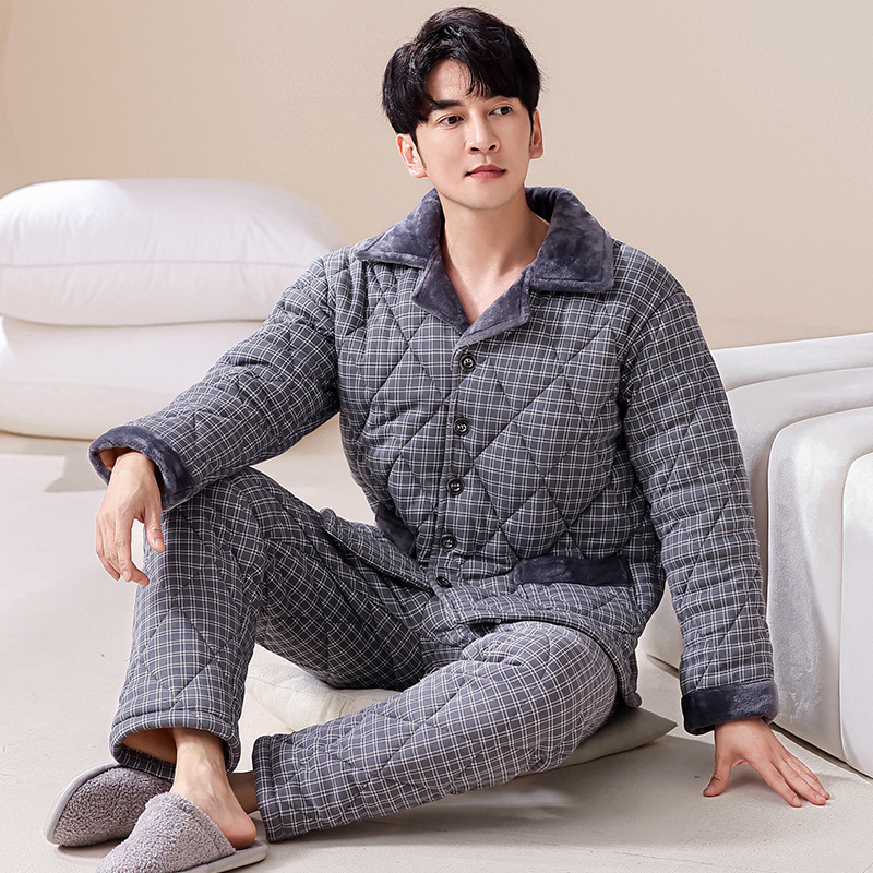 겨울 청소년 남자의 3 층 두꺼운 니트 퀼트 잠옷 가디건 플러스 사이즈 면 패딩 재킷 격자 무늬 가정 옷 세트 남성스토어 가기