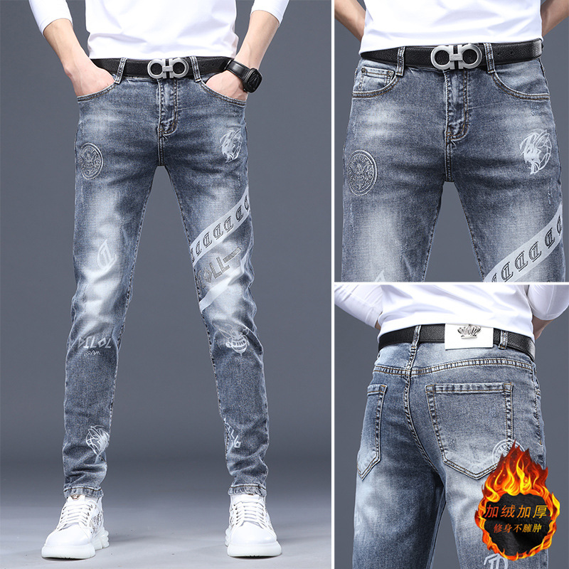 가벼운 고급 남성용 청바지 2024 새로운 가을과 겨울 기모 스트레치 핫 드릴링 인쇄 슬림 핏 작은 스트레이트 캐주얼 바지