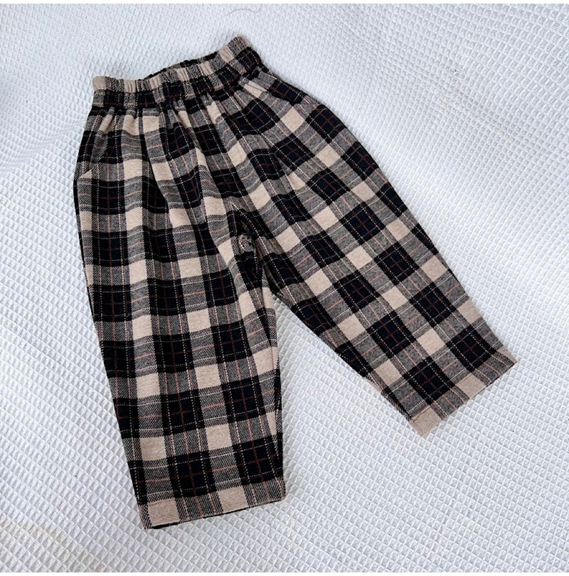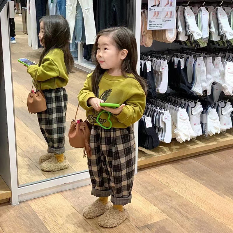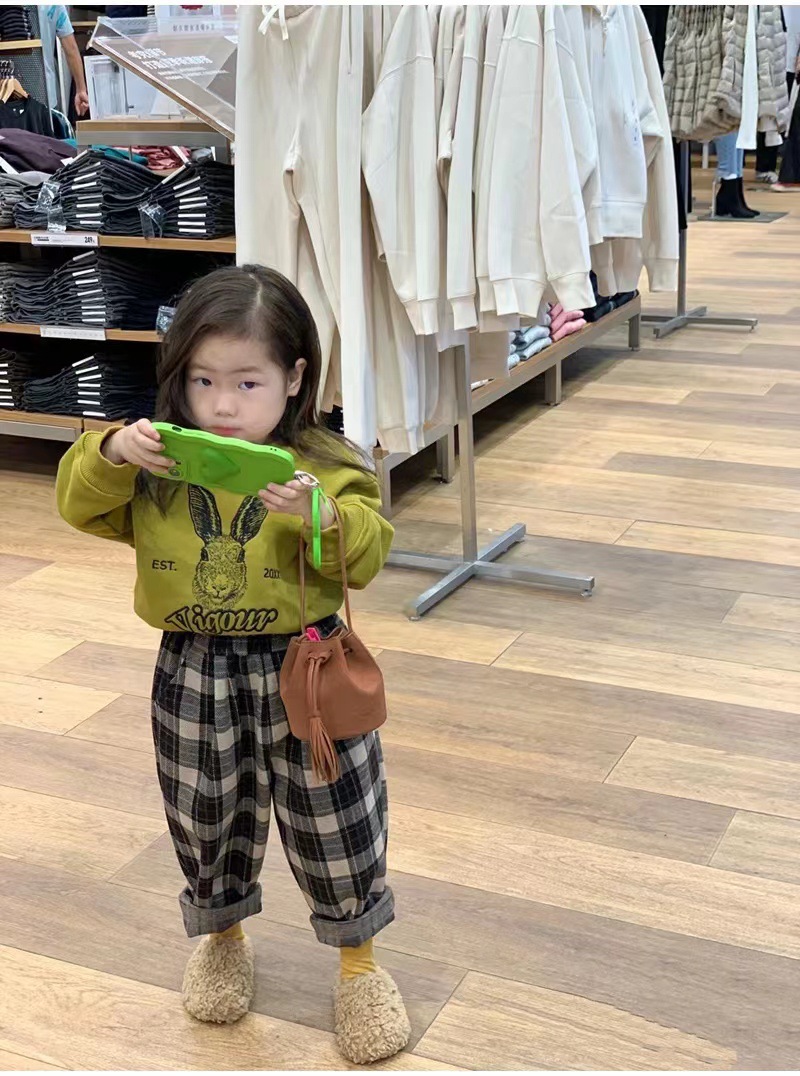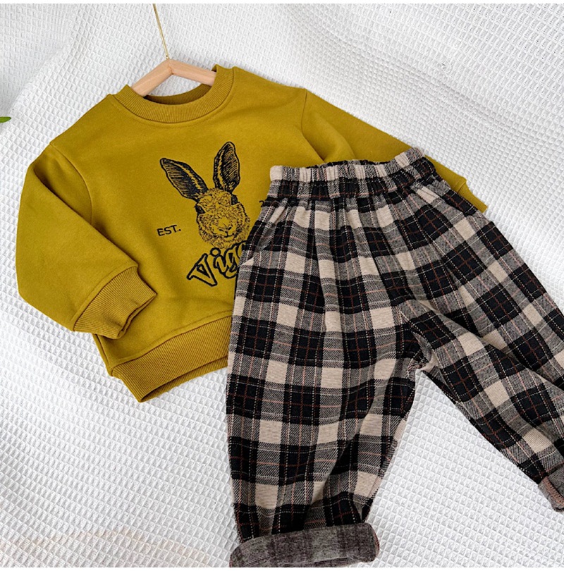 가을과 겨울 세트 여아 토끼 머리 자수 운동복 새로운 두꺼운 울 탑 빈티지 격자 무늬 바지 유행 투피스 세트스토어 가기