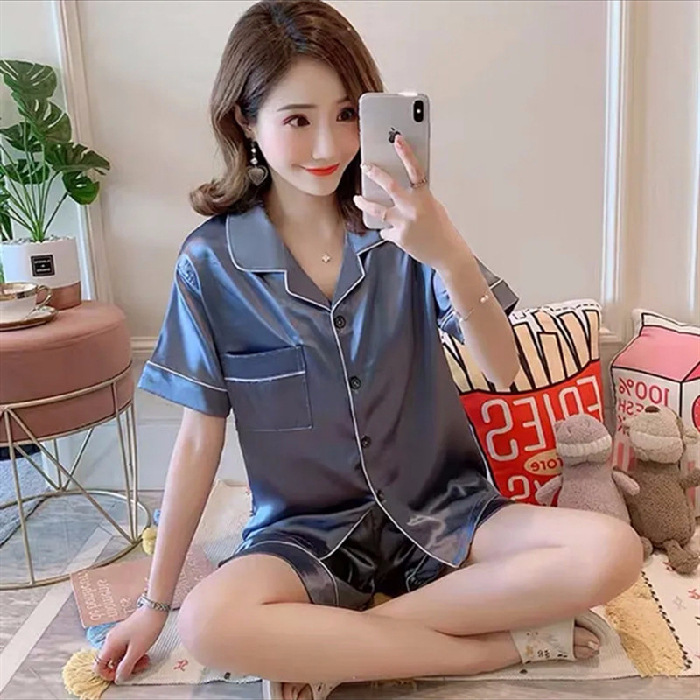 잠옷 여자의 여름 학생 반팔 아이스 실크 모조 실크 가정 옷 여름 달콤한 느슨한 얇은 2 피스 세트스토어 가기