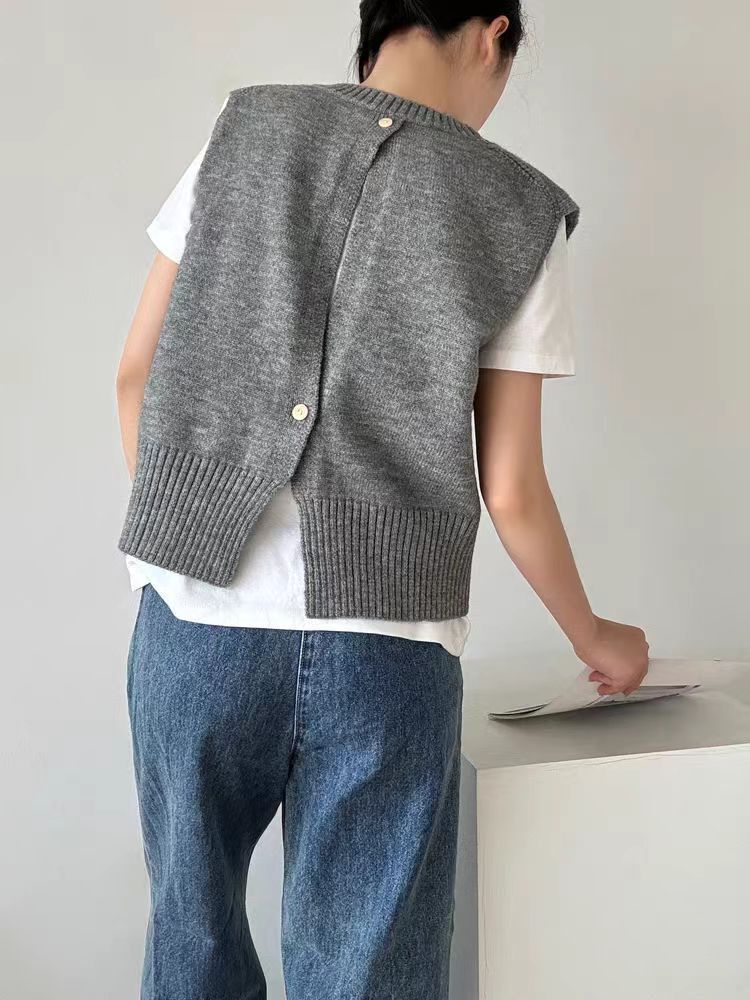 트레이드 스타일의 뒷면 두 개의 버튼 디자인과 라운드 넥 니트 조끼, 민소매 레이어드 디자인의 여성용 조끼스토어 가기