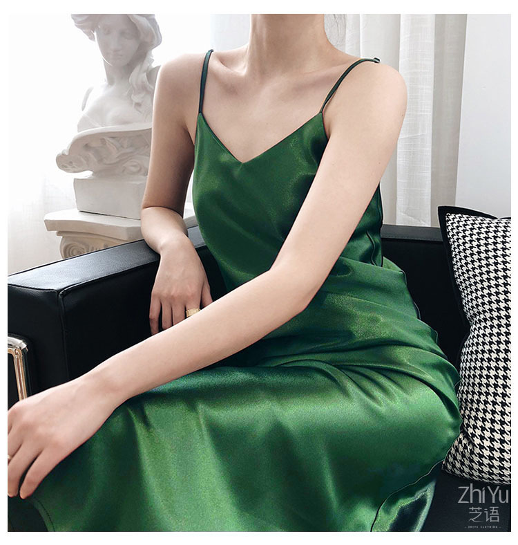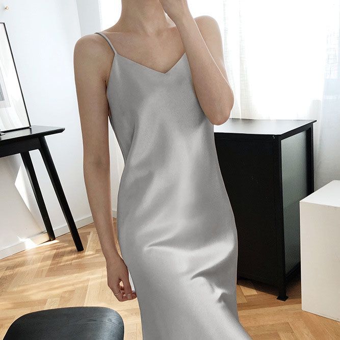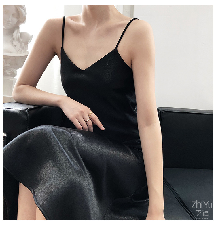 유럽과 미국의 대외 무역 2025 새로운 새틴 서스펜더 드레스 여성 긴 V 넥 기질 슬리밍 내부 바닥 롱 스커트스토어 가기