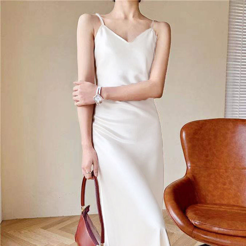 유럽과 미국의 대외 무역 2025 새로운 새틴 서스펜더 드레스 여성 긴 V 넥 기질 슬리밍 내부 바닥 롱 스커트