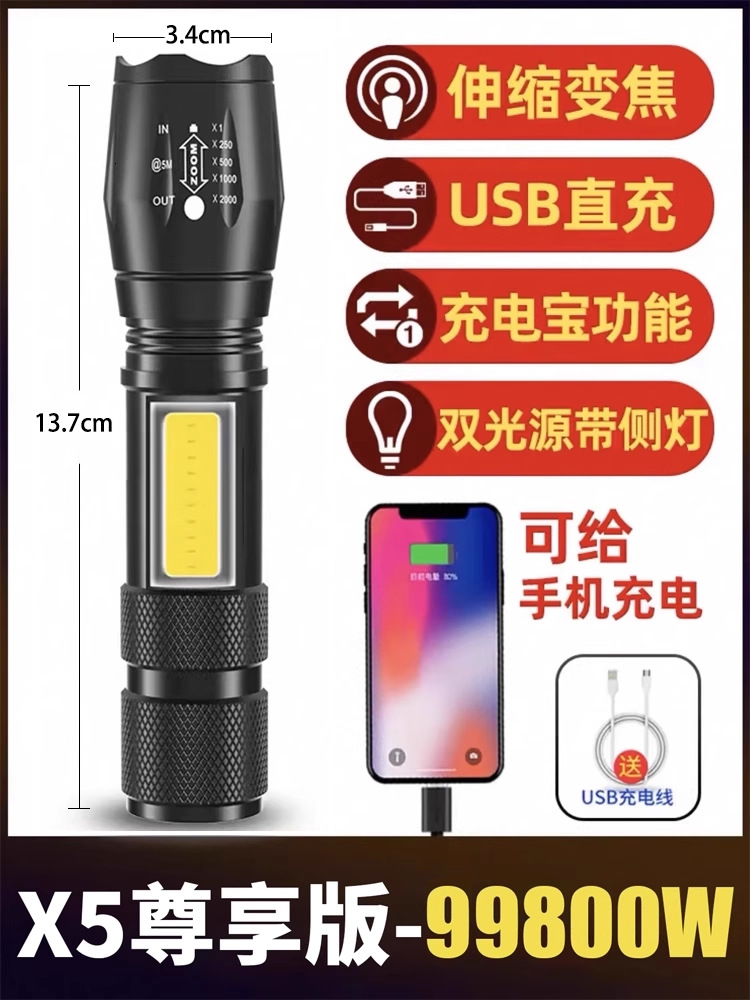 • 측면 조명이 있는 99800w, 휴대폰 충전용 18650 리튬 배터리 내장, 알루미늄 합금 본체