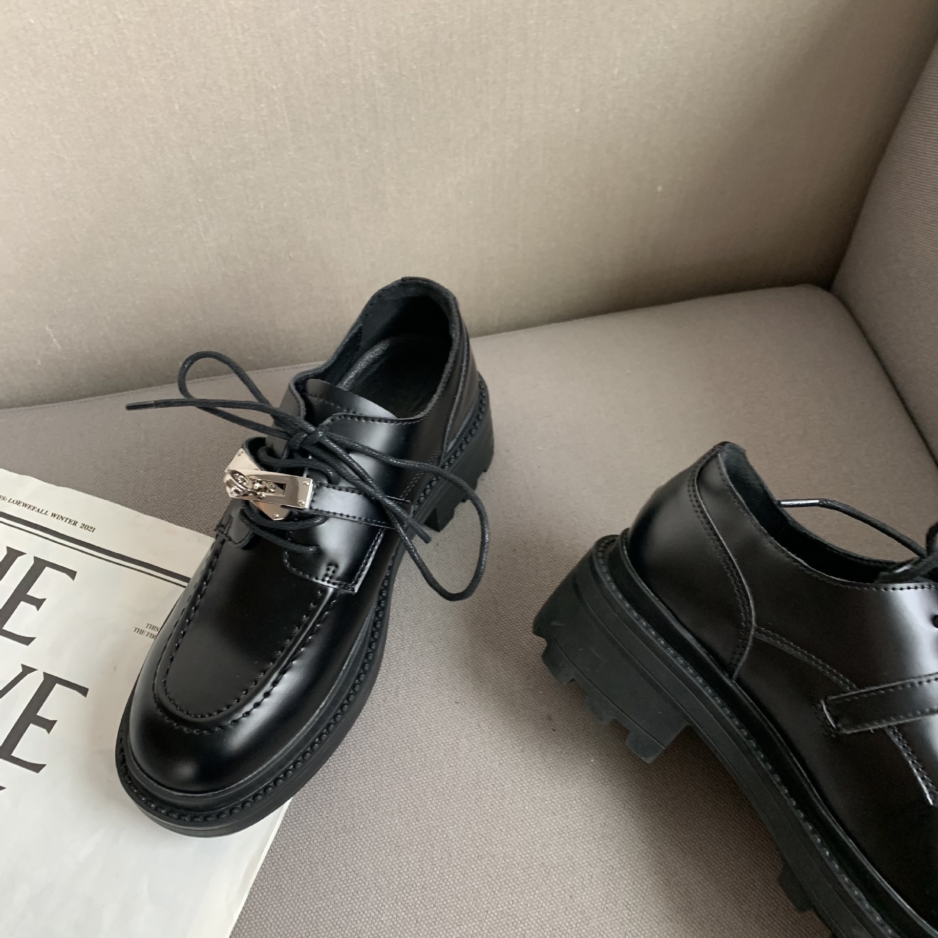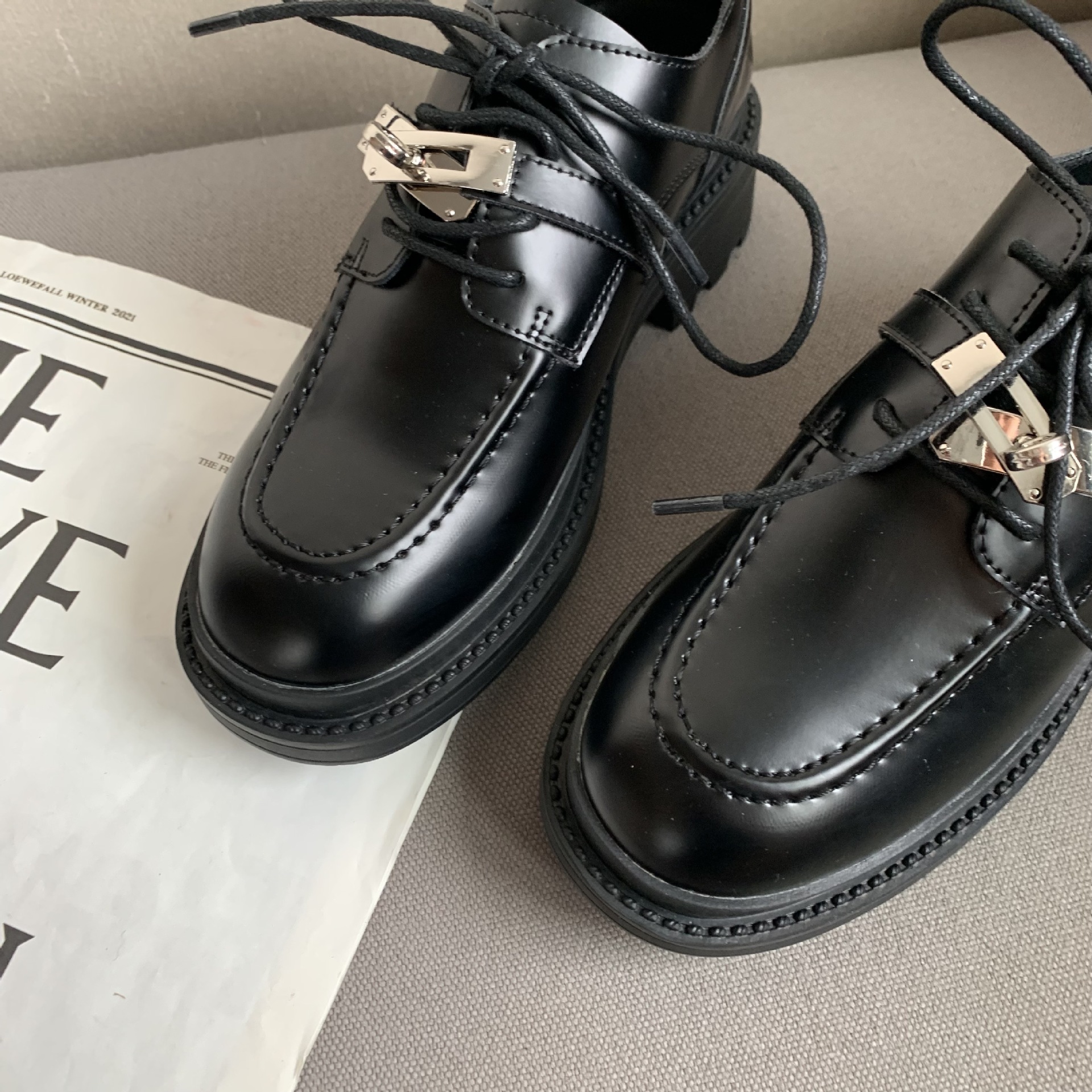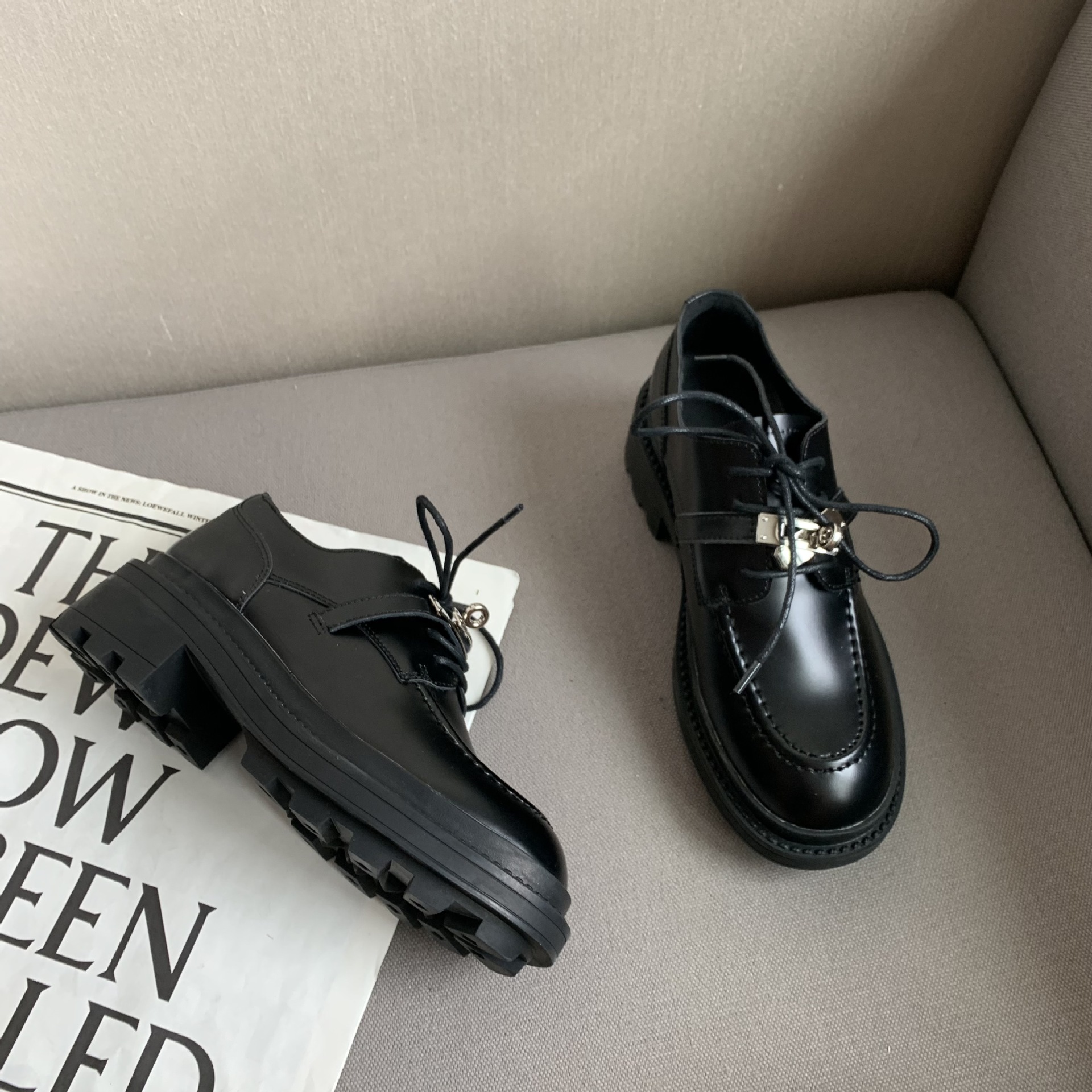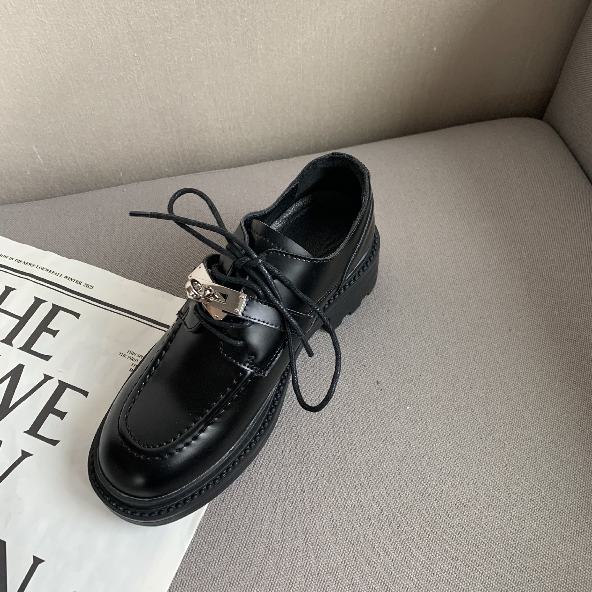 2022 새로운 영국 스타일 잠금 Lefu 싱글 슈즈 여성용 두꺼운 바닥 두꺼운 굽 레이스 옥스포드 가죽 신발스토어 가기