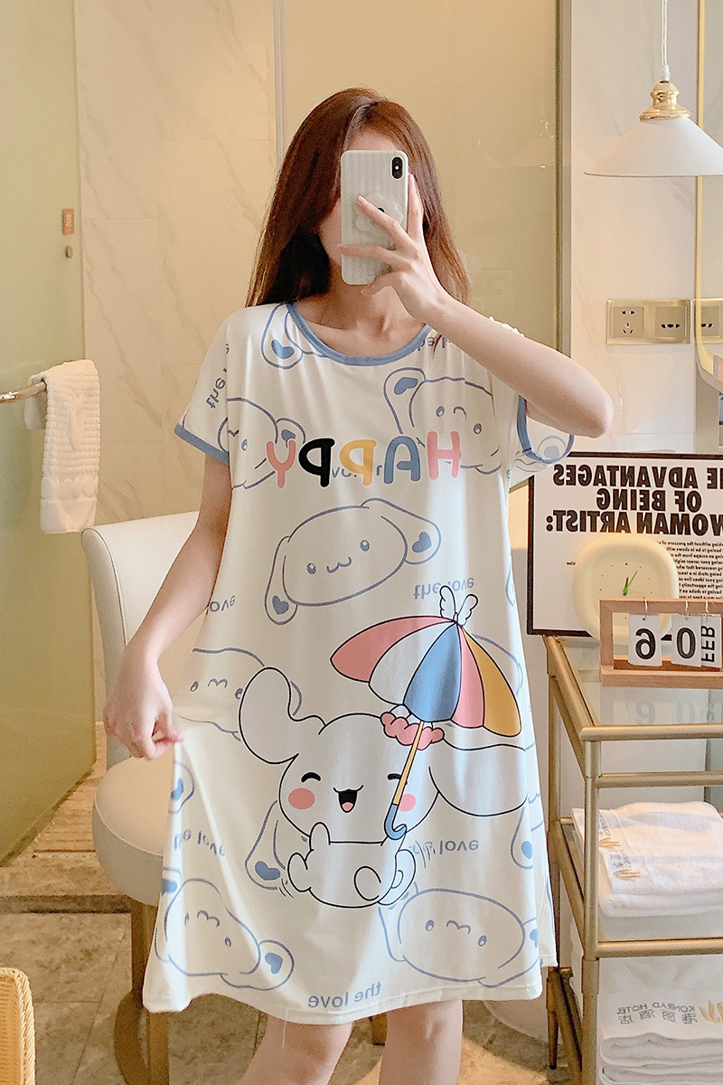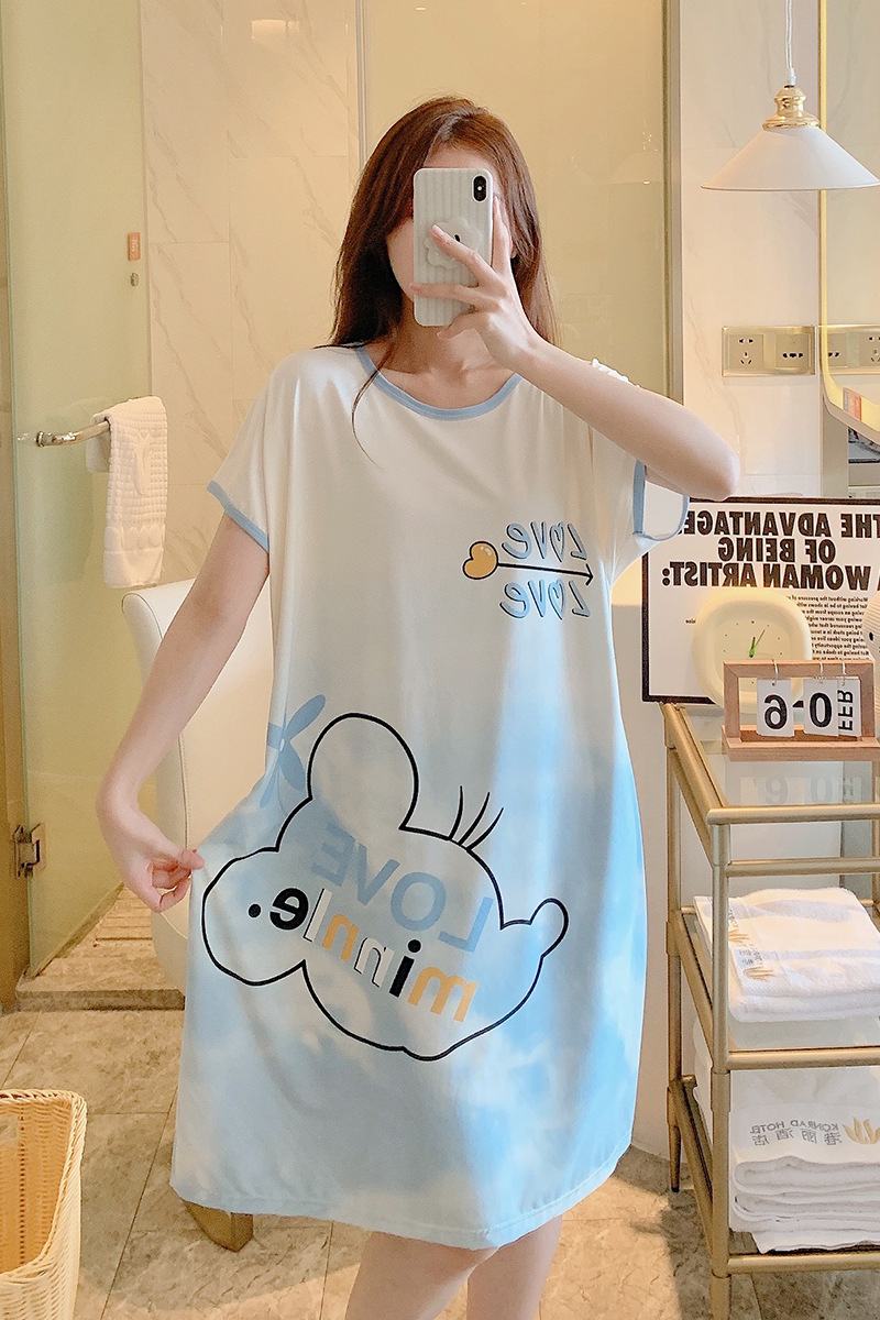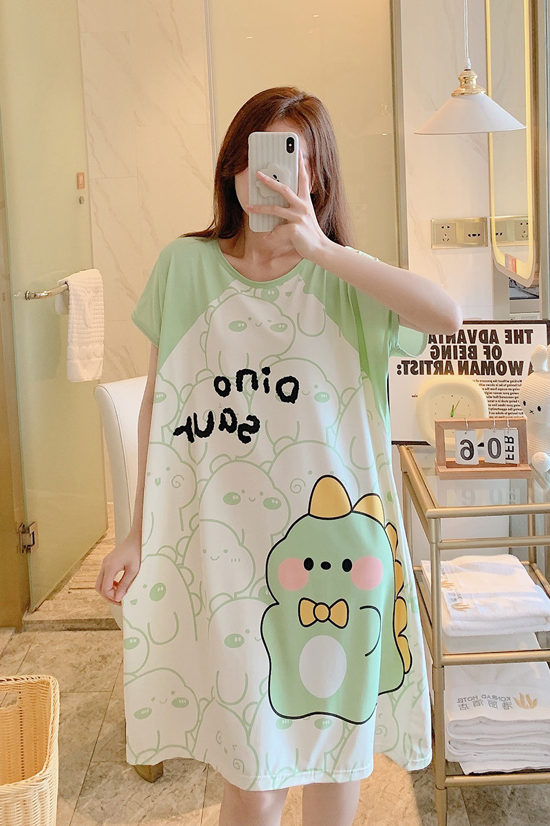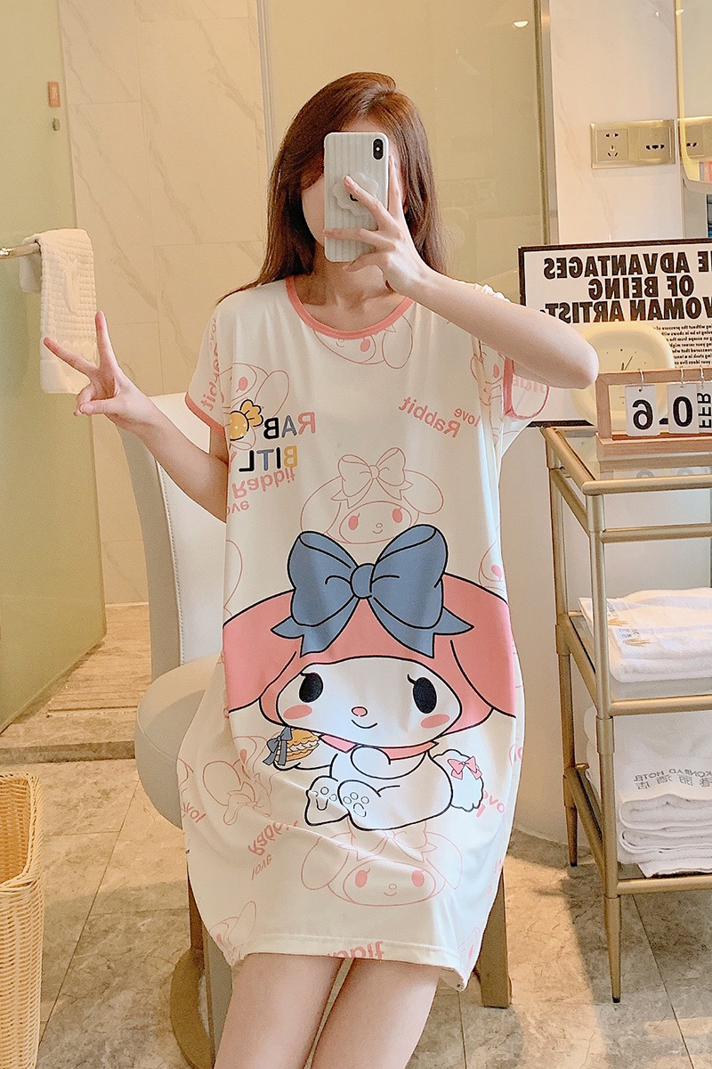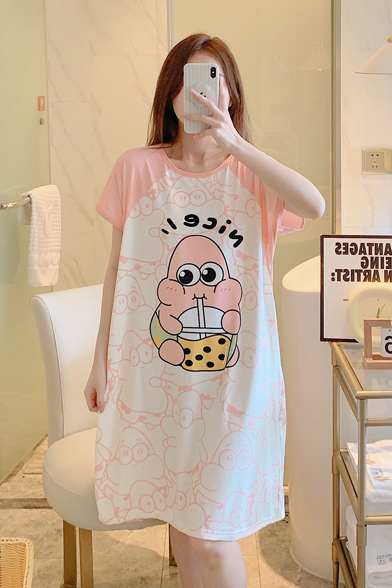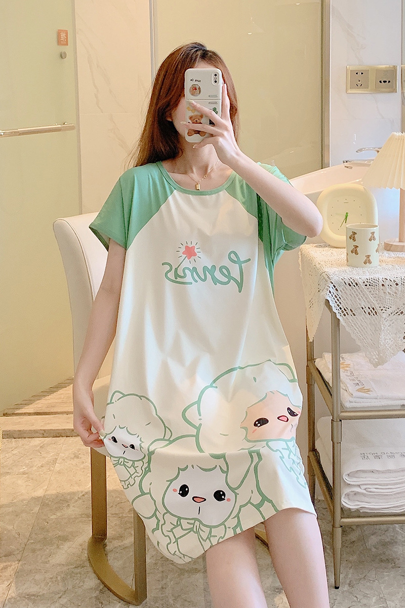 새로운 잠옷 여자의 여름 반팔 얇은 만화 귀여운 느슨한 잠옷 느슨한 중간 길이 원피스 가정 옷 라이브 세대스토어 가기