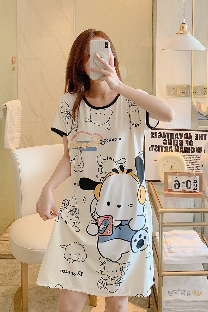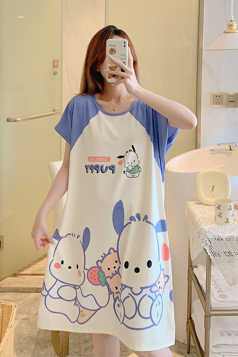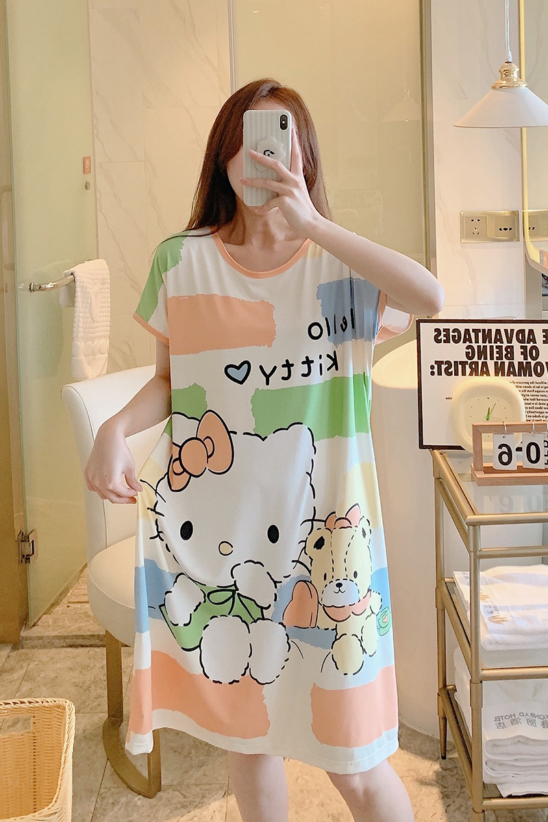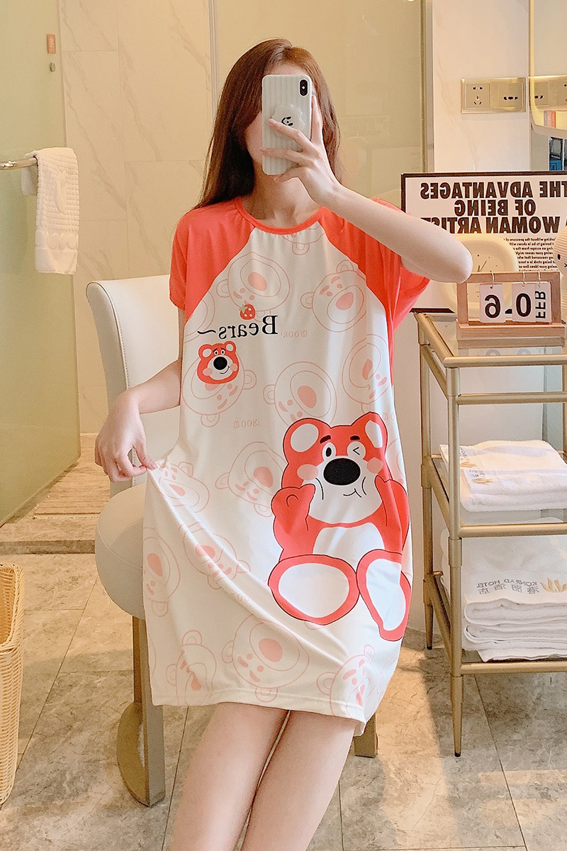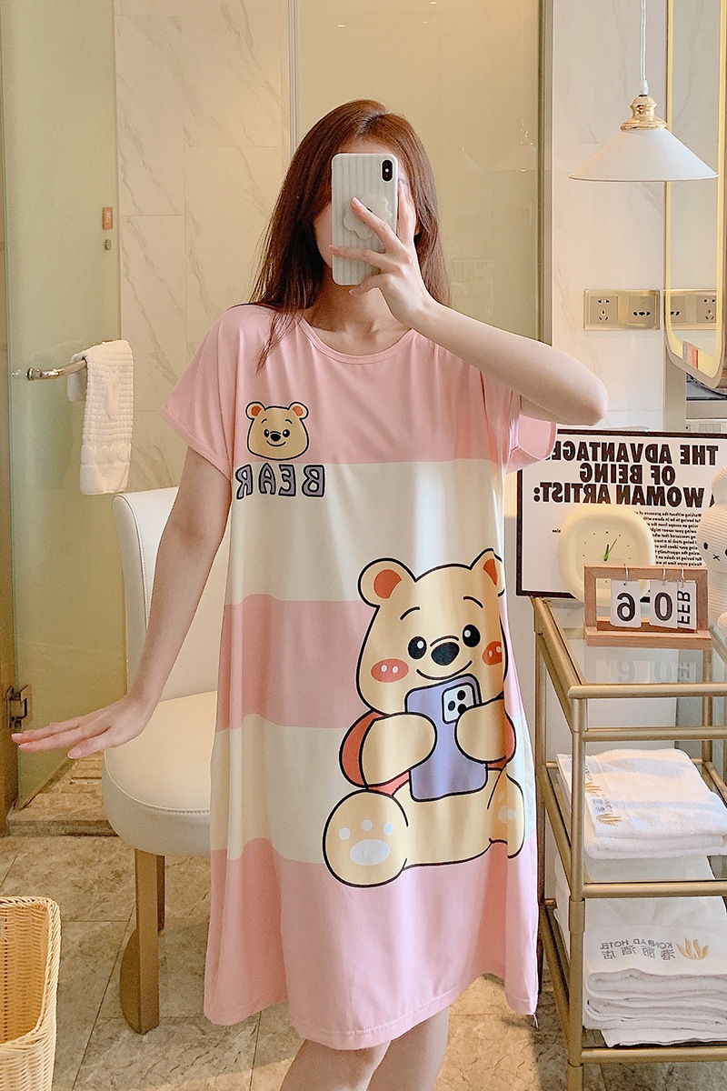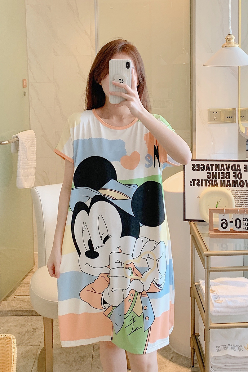 새로운 잠옷 여자의 여름 반팔 얇은 만화 귀여운 느슨한 잠옷 느슨한 중간 길이 원피스 가정 옷 라이브 세대스토어 가기