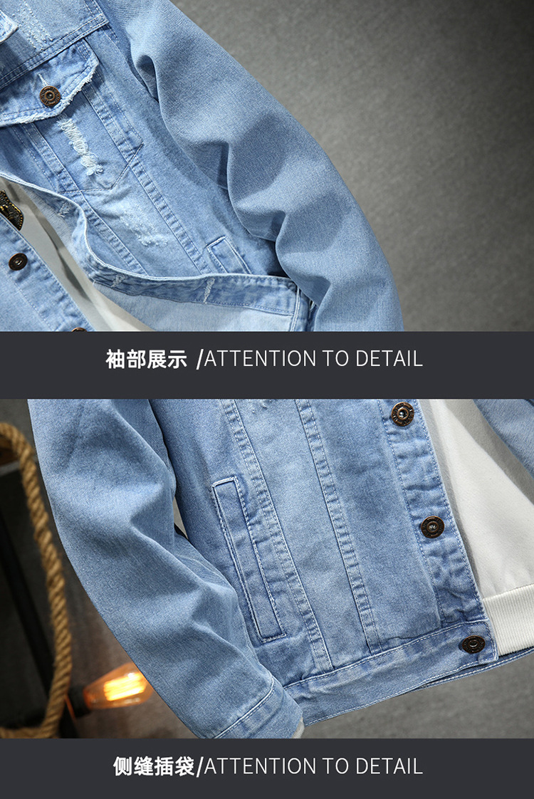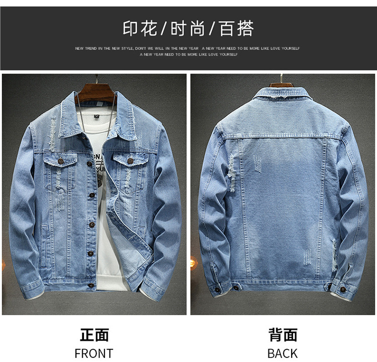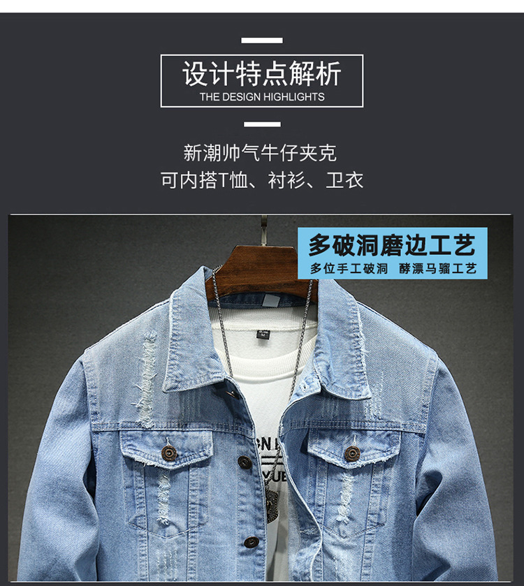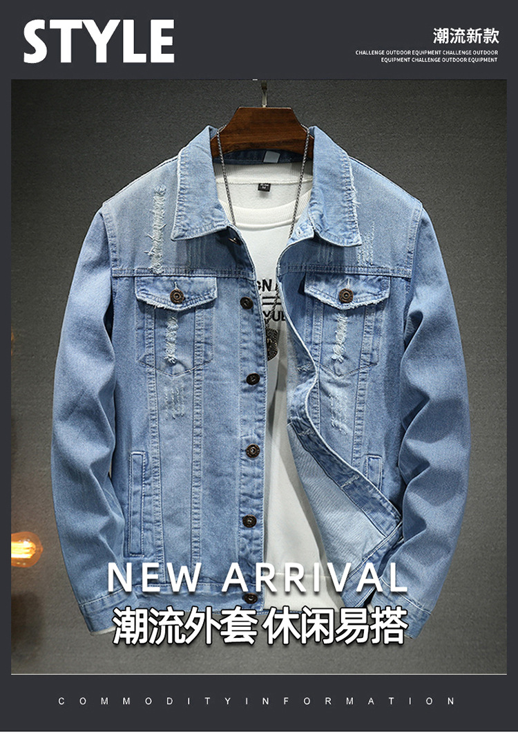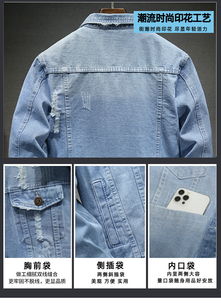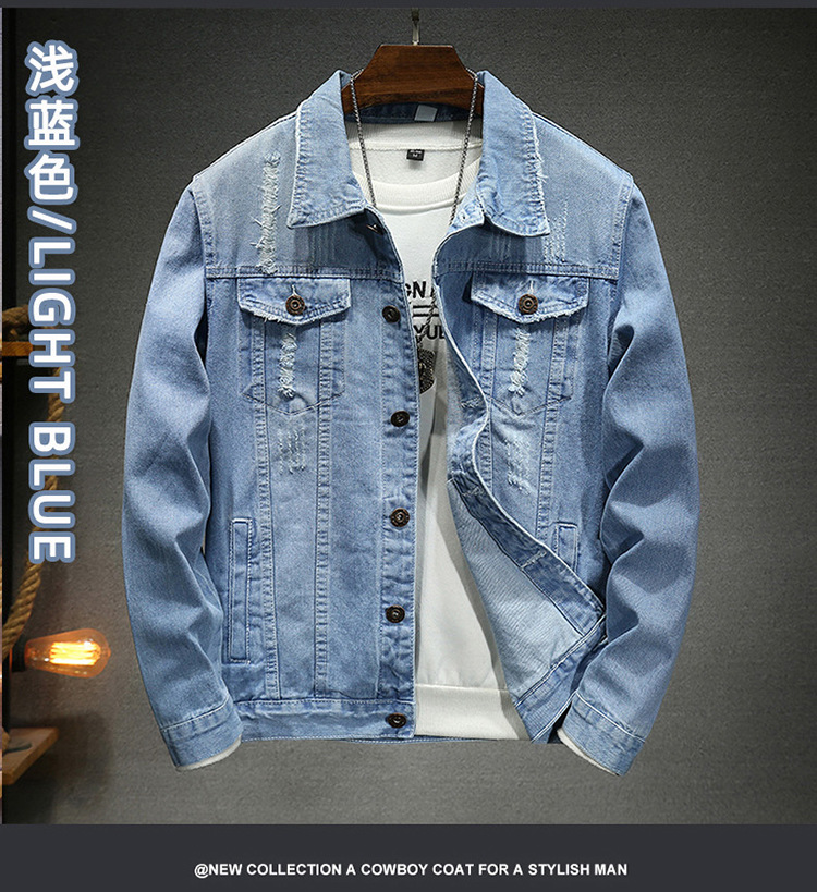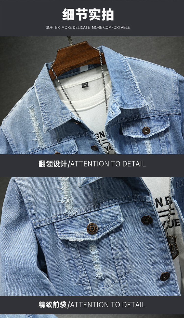 LAZADA 새로운 유행 남성 자켓 탑 봄과 가을 라이트 블루 슬림핏 그라인딩 홀 데님 재킷 남성용스토어 가기