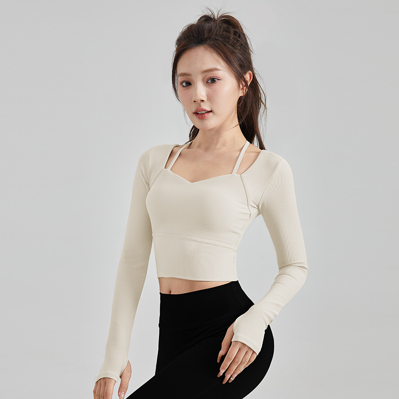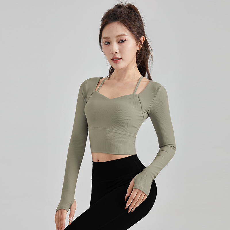 가을과 겨울 섹시한 슬링 요가 의류 가슴 매트가있는 여성용 스포츠 탑 속건 슬리밍 우아한 긴팔 러닝 피트니스 의류스토어 가기