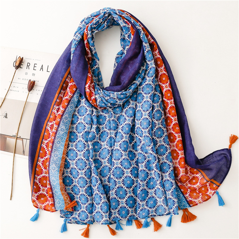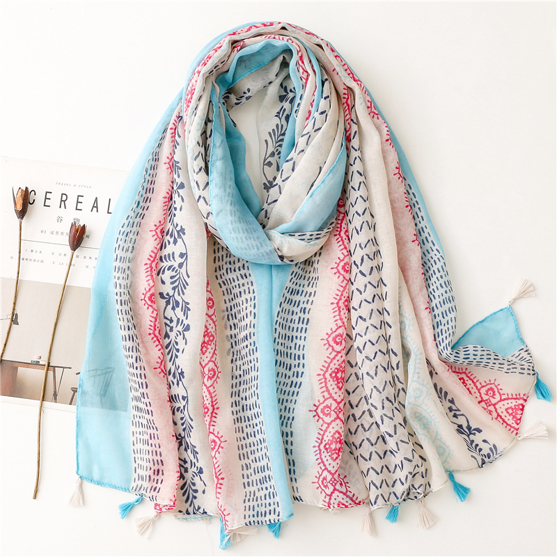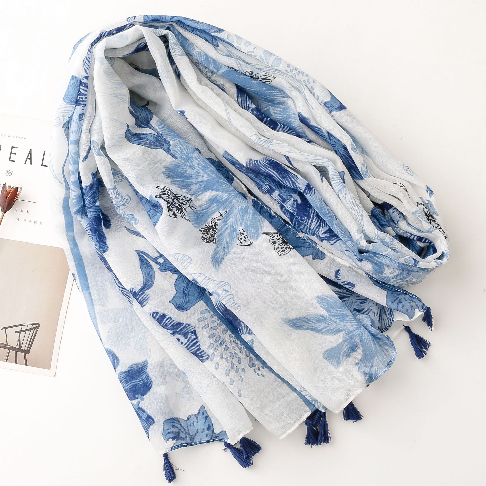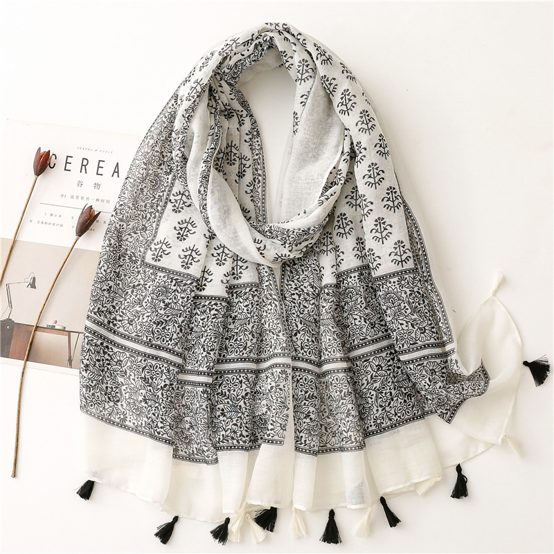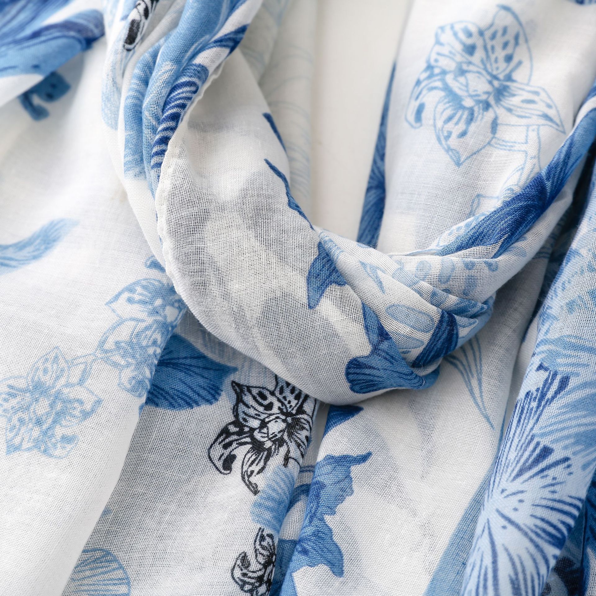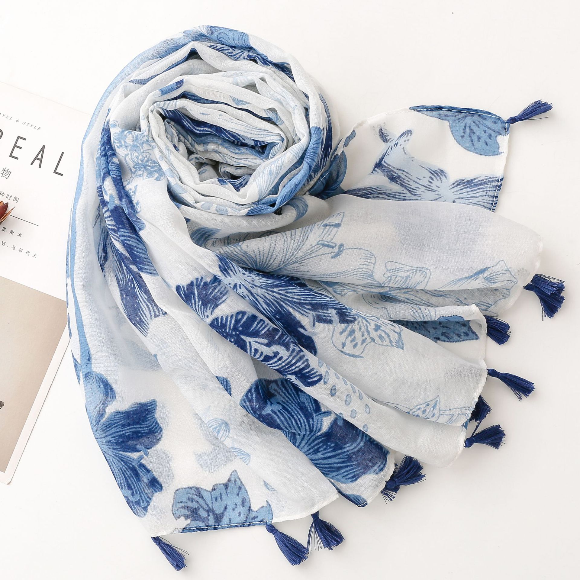 신선한 중국 스타일 빈티지 파란색과 흰색 도자기 면과 린넨 스카프 발리 원사 스카프 블루 잉크 페인팅 꽃 여자스토어 가기