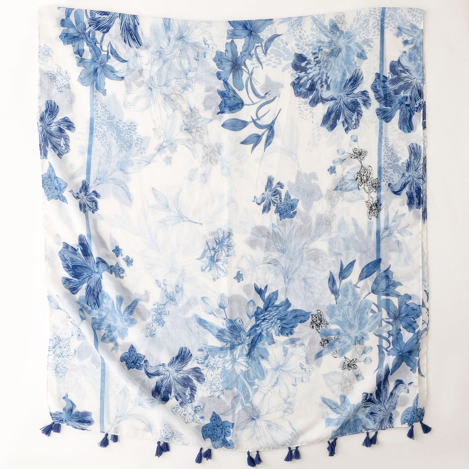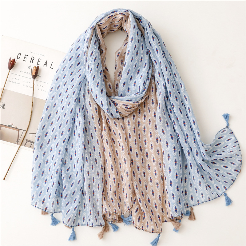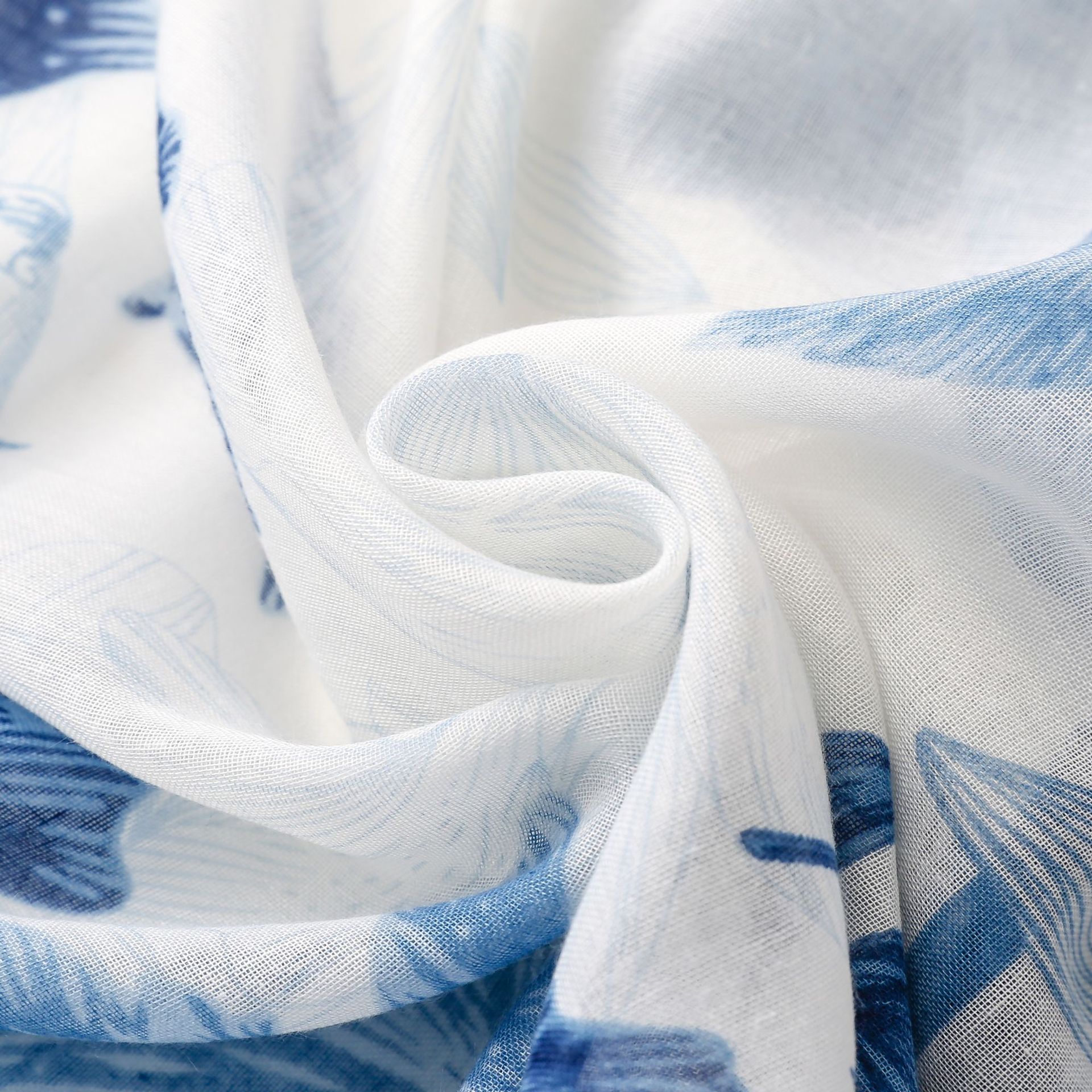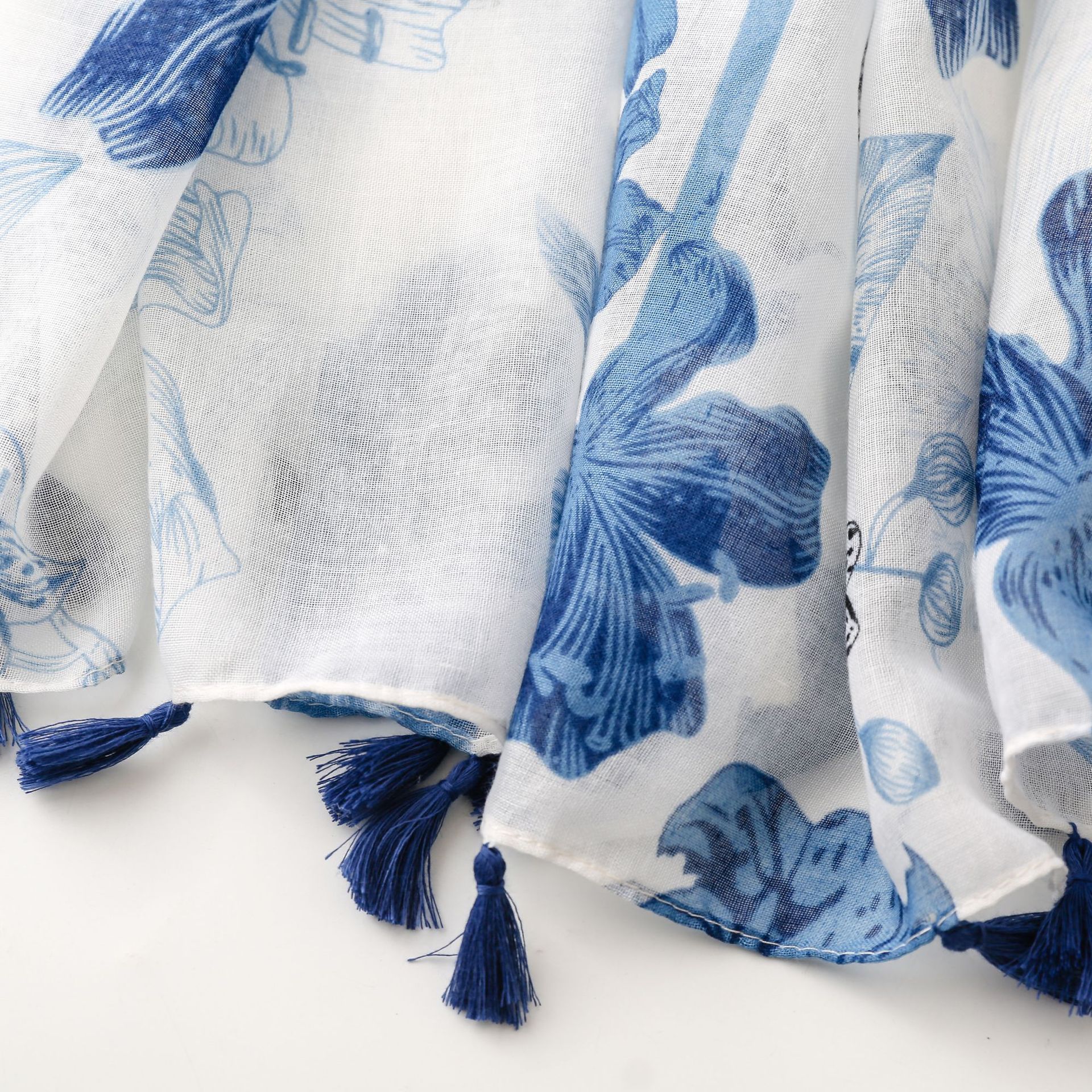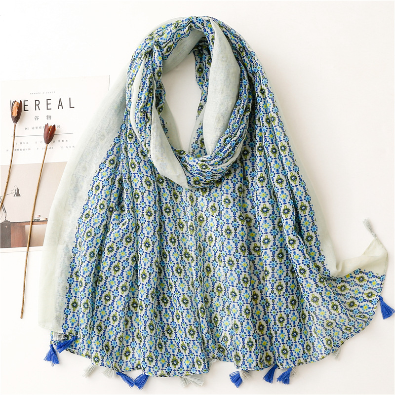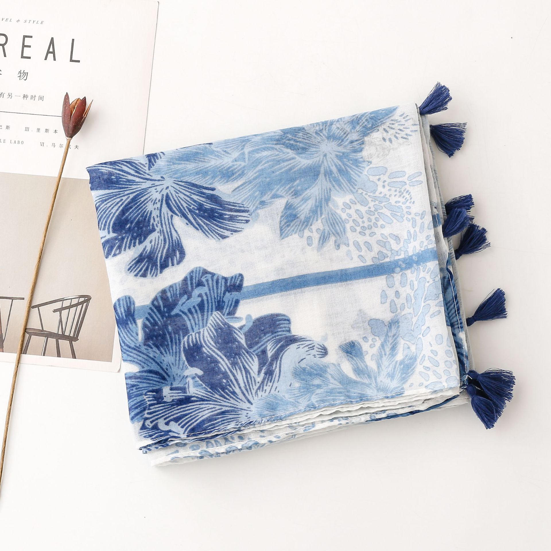 신선한 중국 스타일 빈티지 파란색과 흰색 도자기 면과 린넨 스카프 발리 원사 스카프 블루 잉크 페인팅 꽃 여자스토어 가기