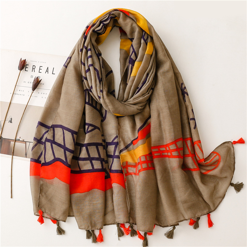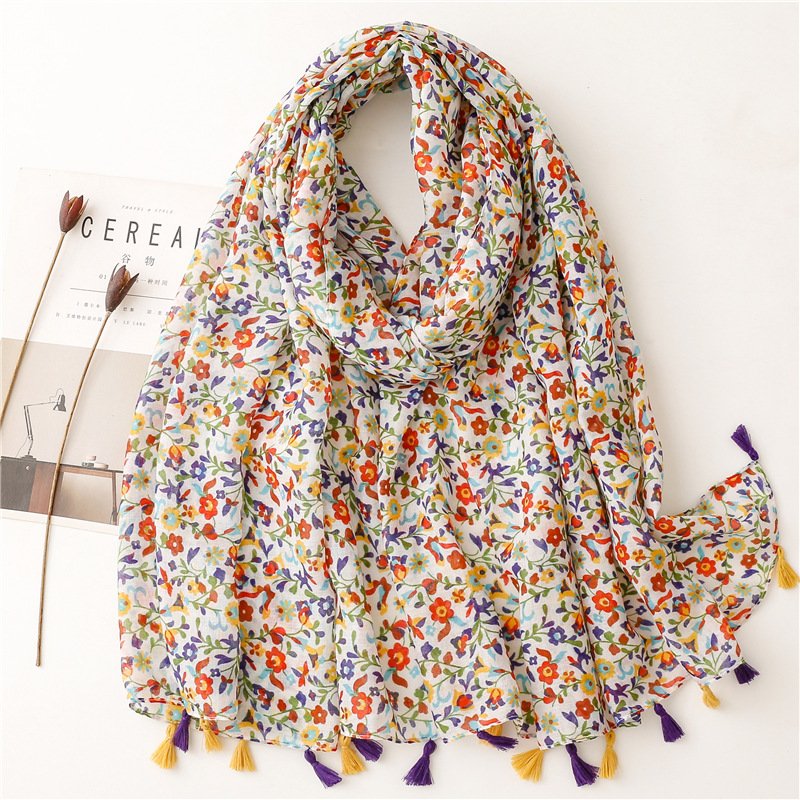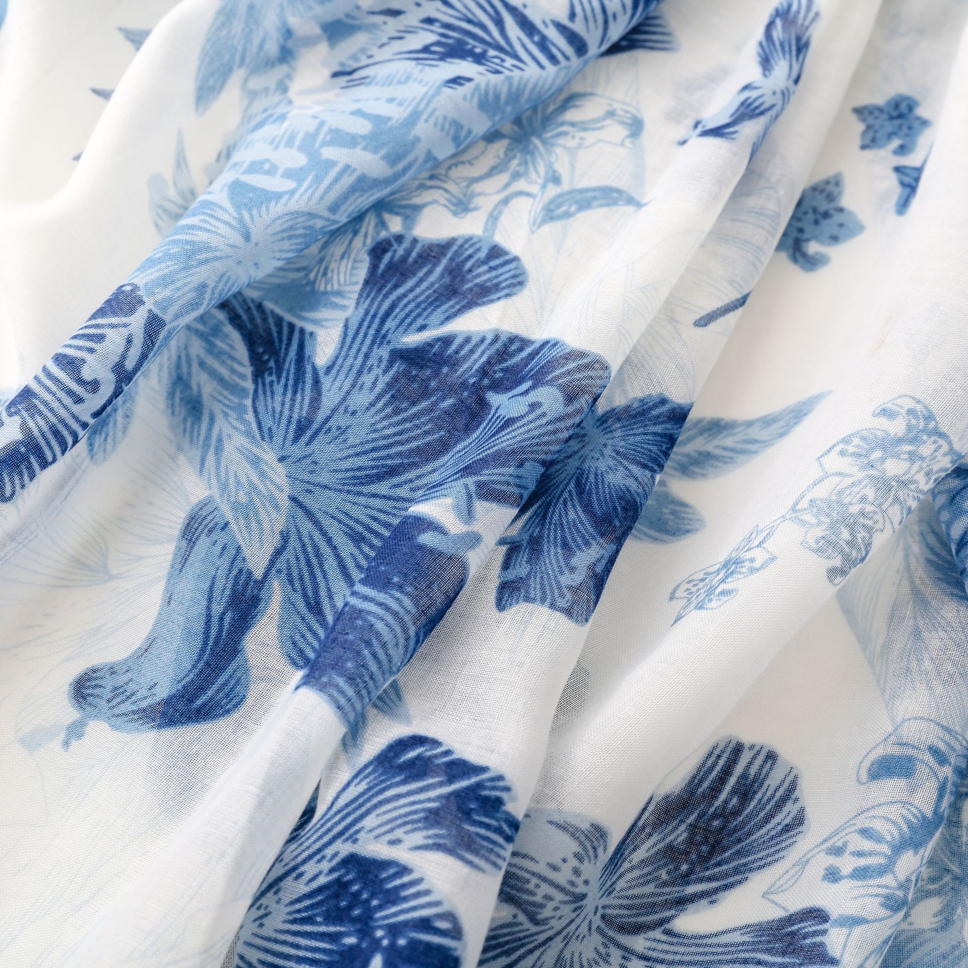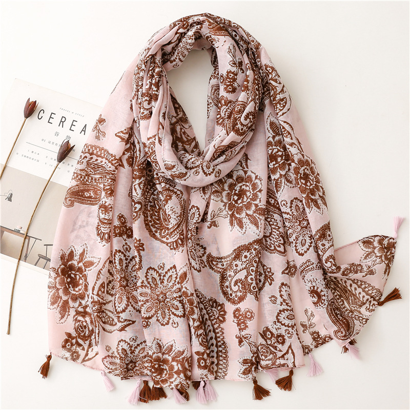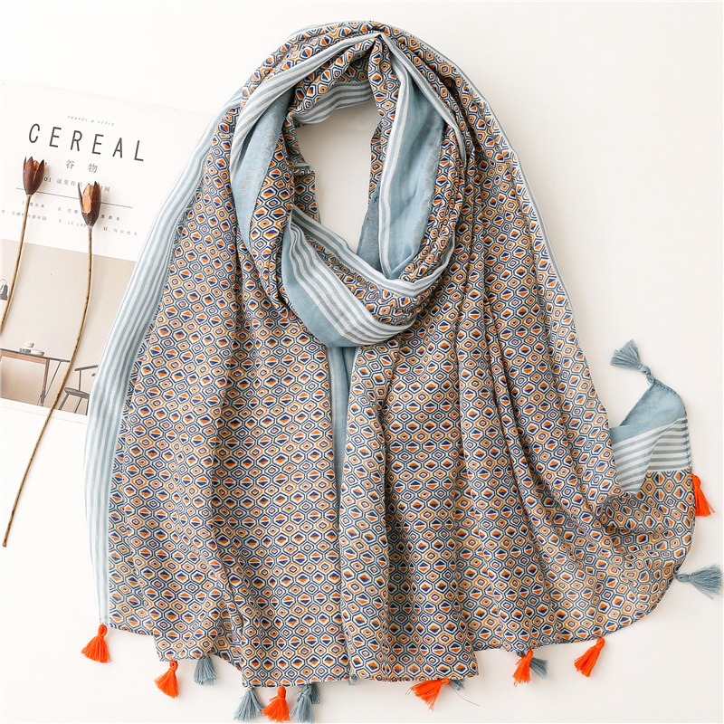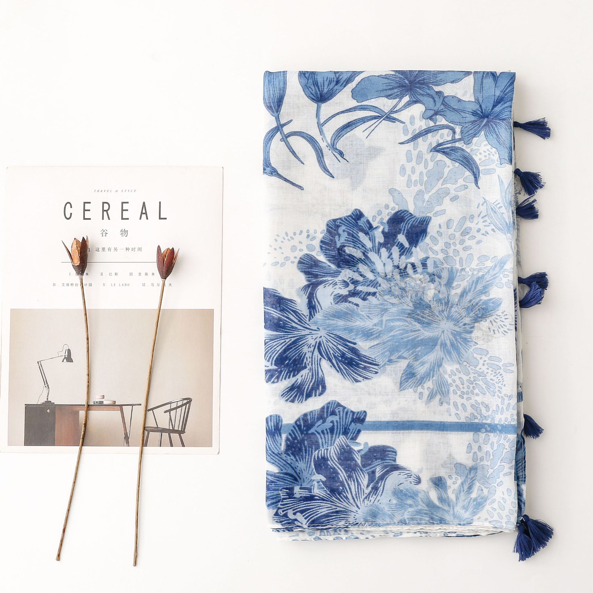 신선한 중국 스타일 빈티지 파란색과 흰색 도자기 면과 린넨 스카프 발리 원사 스카프 블루 잉크 페인팅 꽃 여자스토어 가기