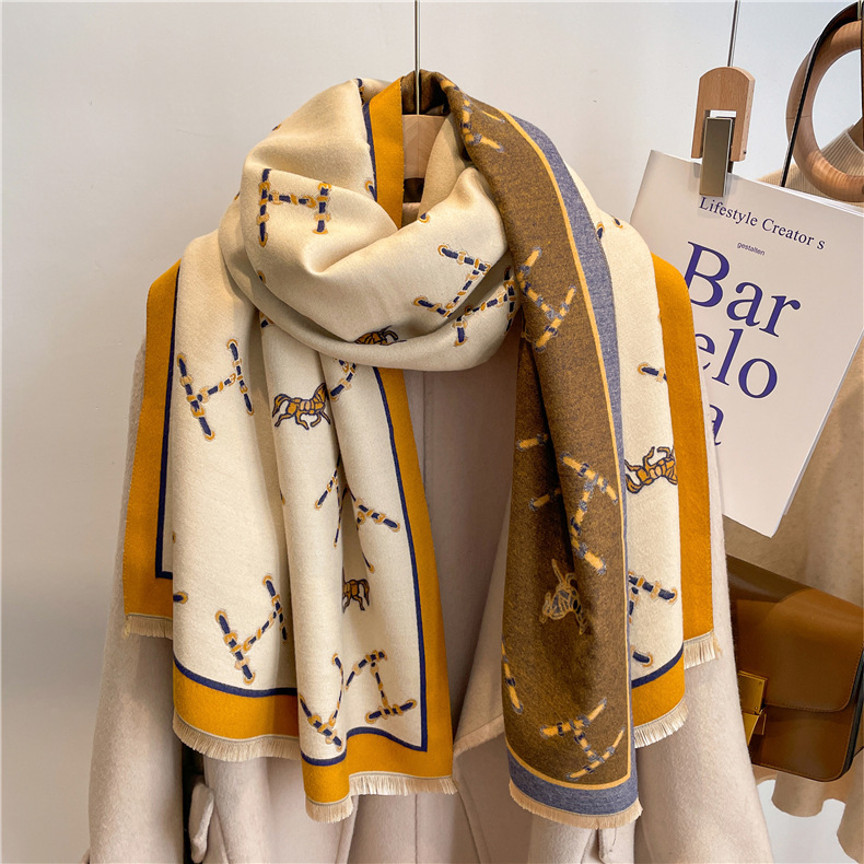 한국 스타일 새로운 두꺼운 스카프 여성용 캐시미어 2022 가을과 겨울 오렌지 숄 다용도 스카프 H 편지 라이브 폭발
