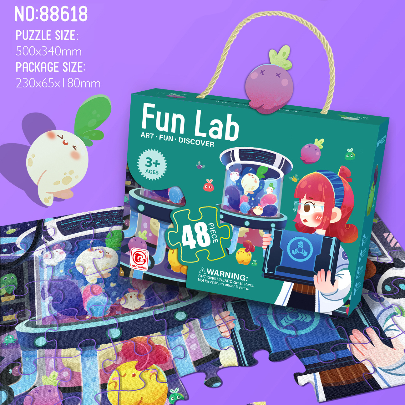 48片系列彩盒尺寸23*6.5*18cm,拼图尺寸50*34cm,单盒净重395g左右。1大箱装84盒