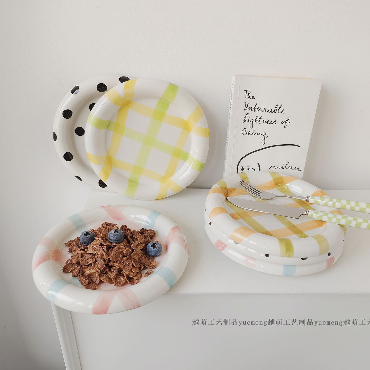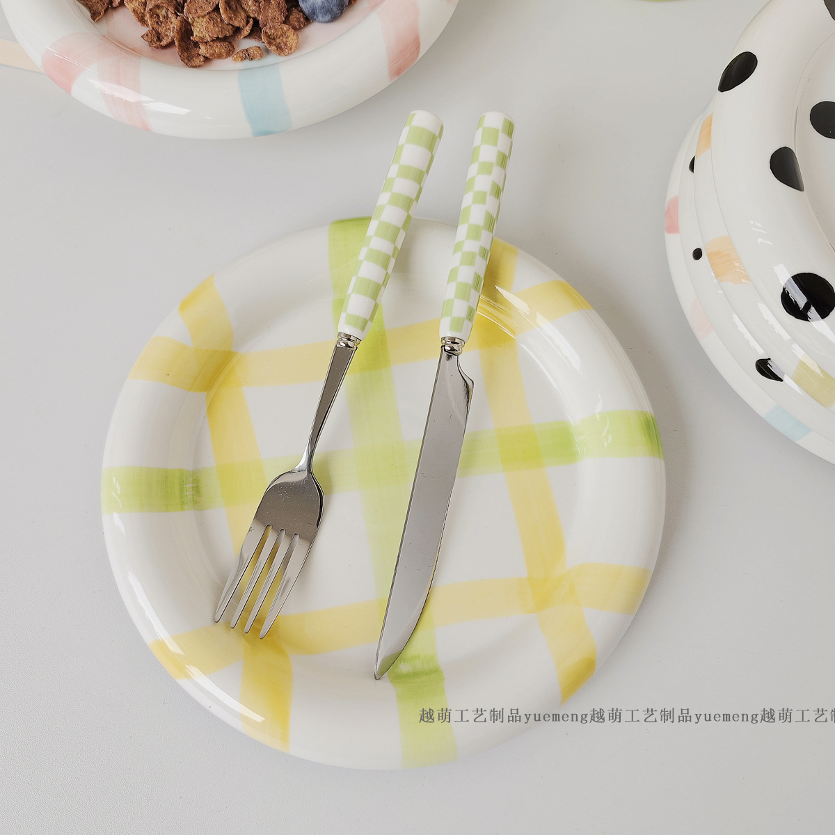 스타일 높은 색상 가치 스트라이프 웨이브 도트 언더 글레이즈 색상 세라믹 접시 낙서 디저트 접시 한국 아침 식사 포즈 VLOG 접시