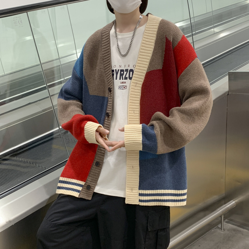 카디건 스웨터 남성용 홍콩 스타일 in Colorblock 느슨한 스웨터 재킷 커플 가을과 겨울 유행 캐주얼 스웨터스토어 가기