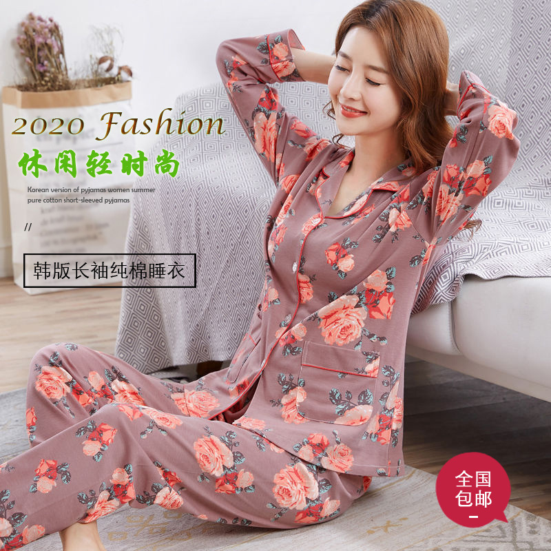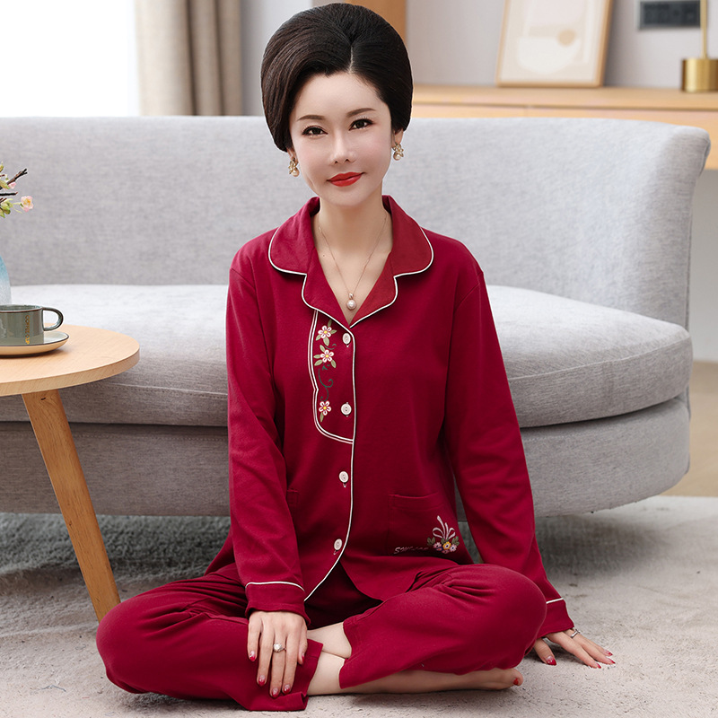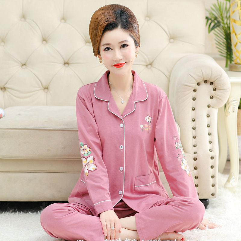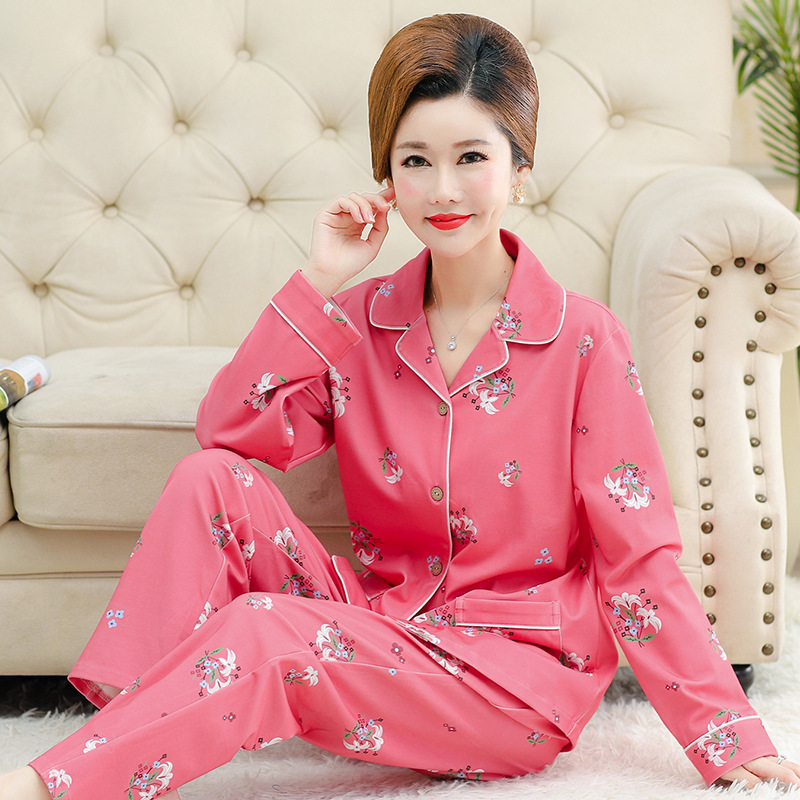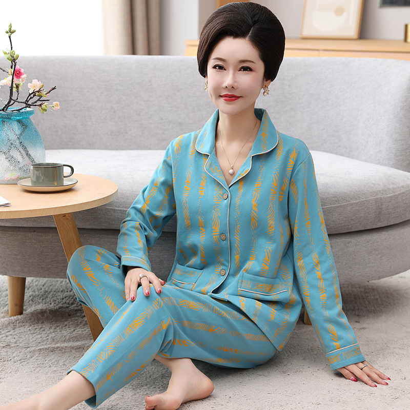 봄과 가을의 세대 중년 및 노인 여성 면 잠옷 카디건 느슨한 플러스 사이즈 긴 소매 가정 옷 세트