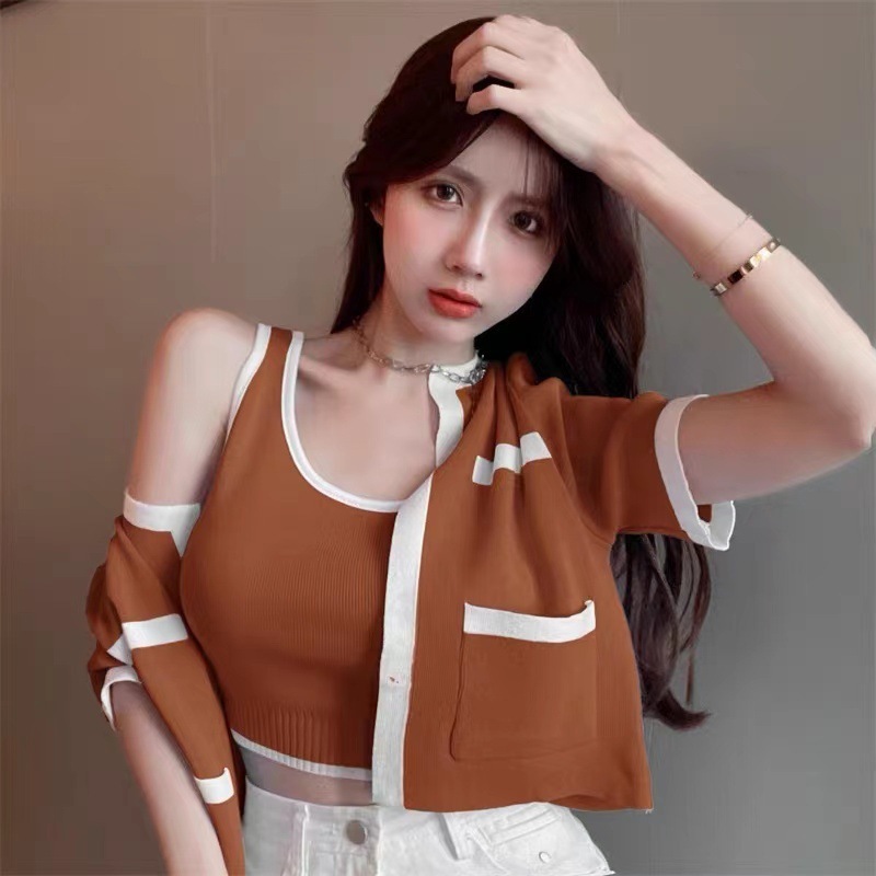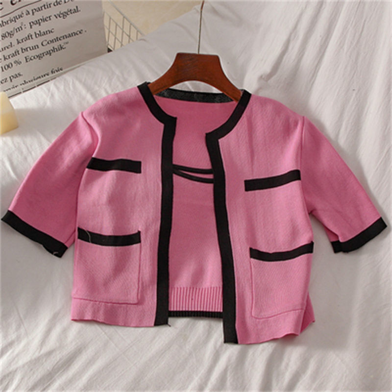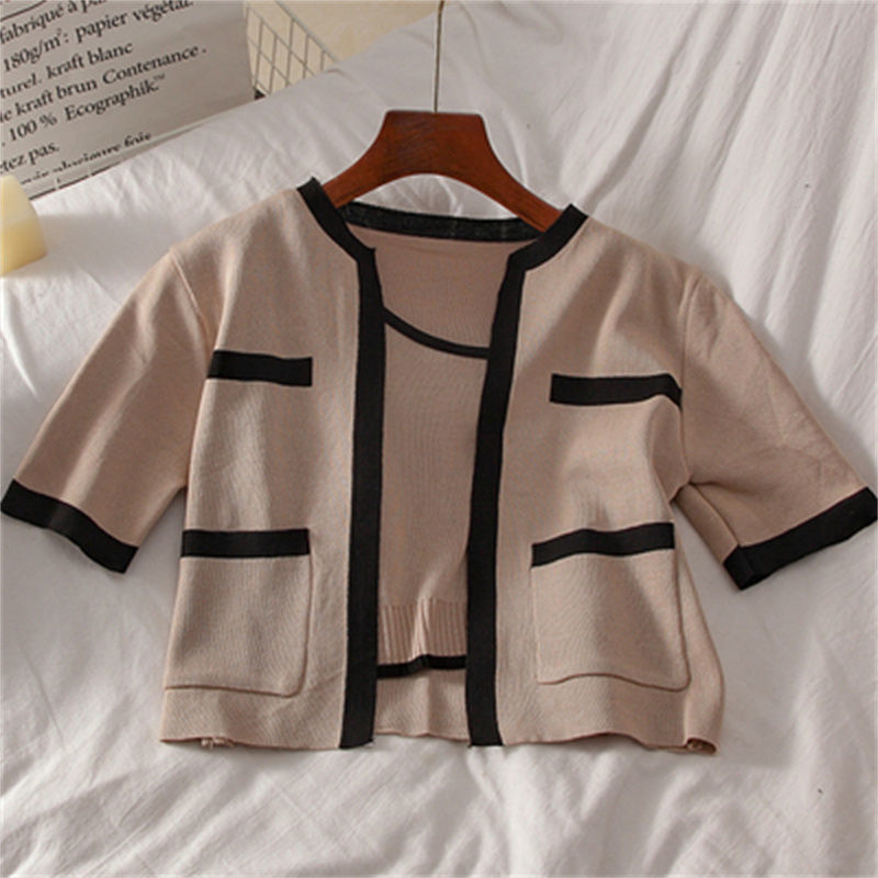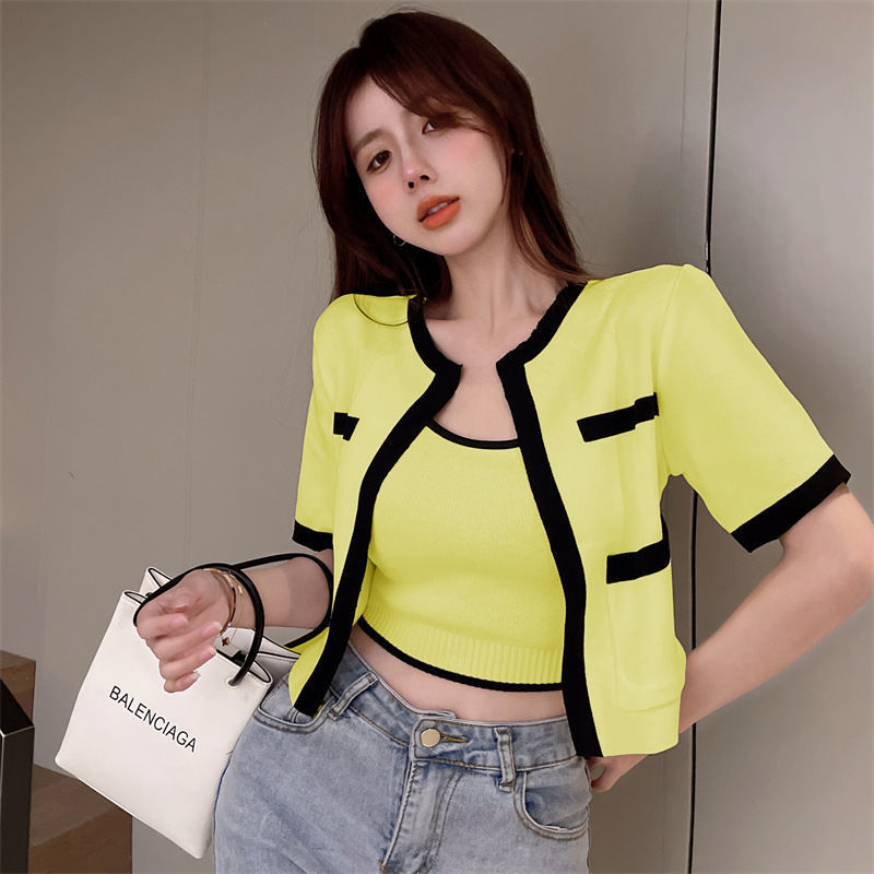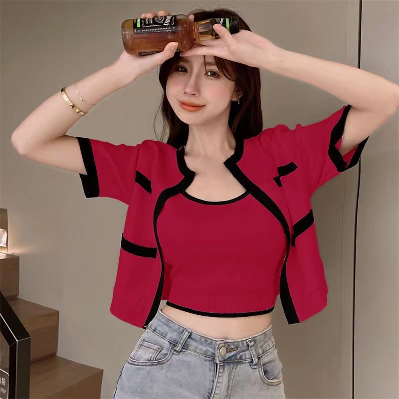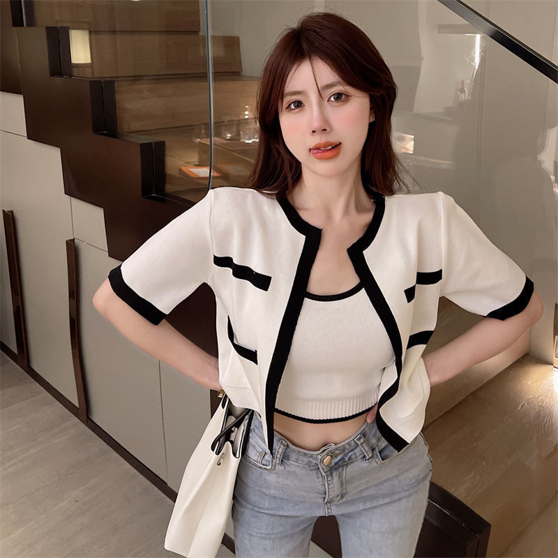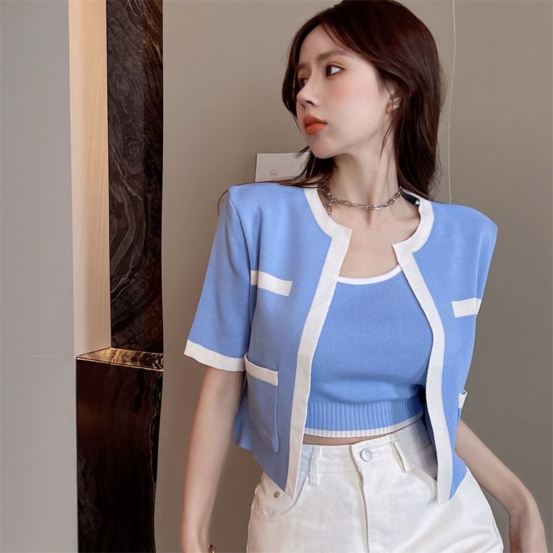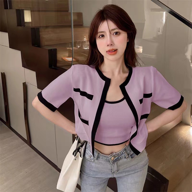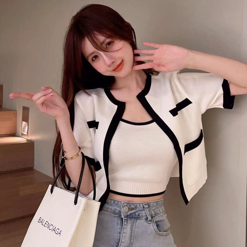 Xiaoxiang 스타일 니트웨어 조끼 투피스 세트 2023 봄과 가을 한국 탑 여성 슬리밍 반팔 조끼 가디건 세트