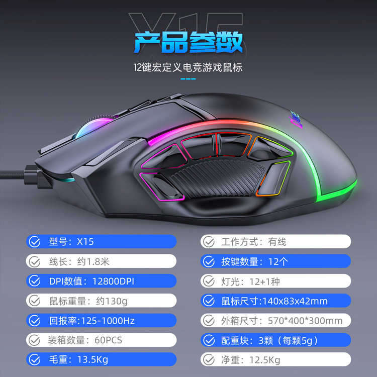 도매 게임 마우스 12800DPI 12 키 매크로 정의 치킨 유선 RGB 게임 마우스 글로우 먹기