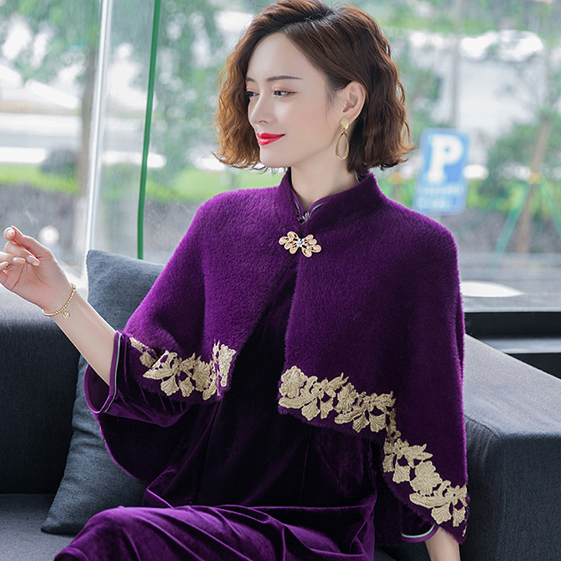 밍크 벨벳 숄 여성의 가을과 겨울 두꺼운 서양 스타일 자수 망토 결혼식 연회를위한 짧은 행복한 시어머니 치파오
