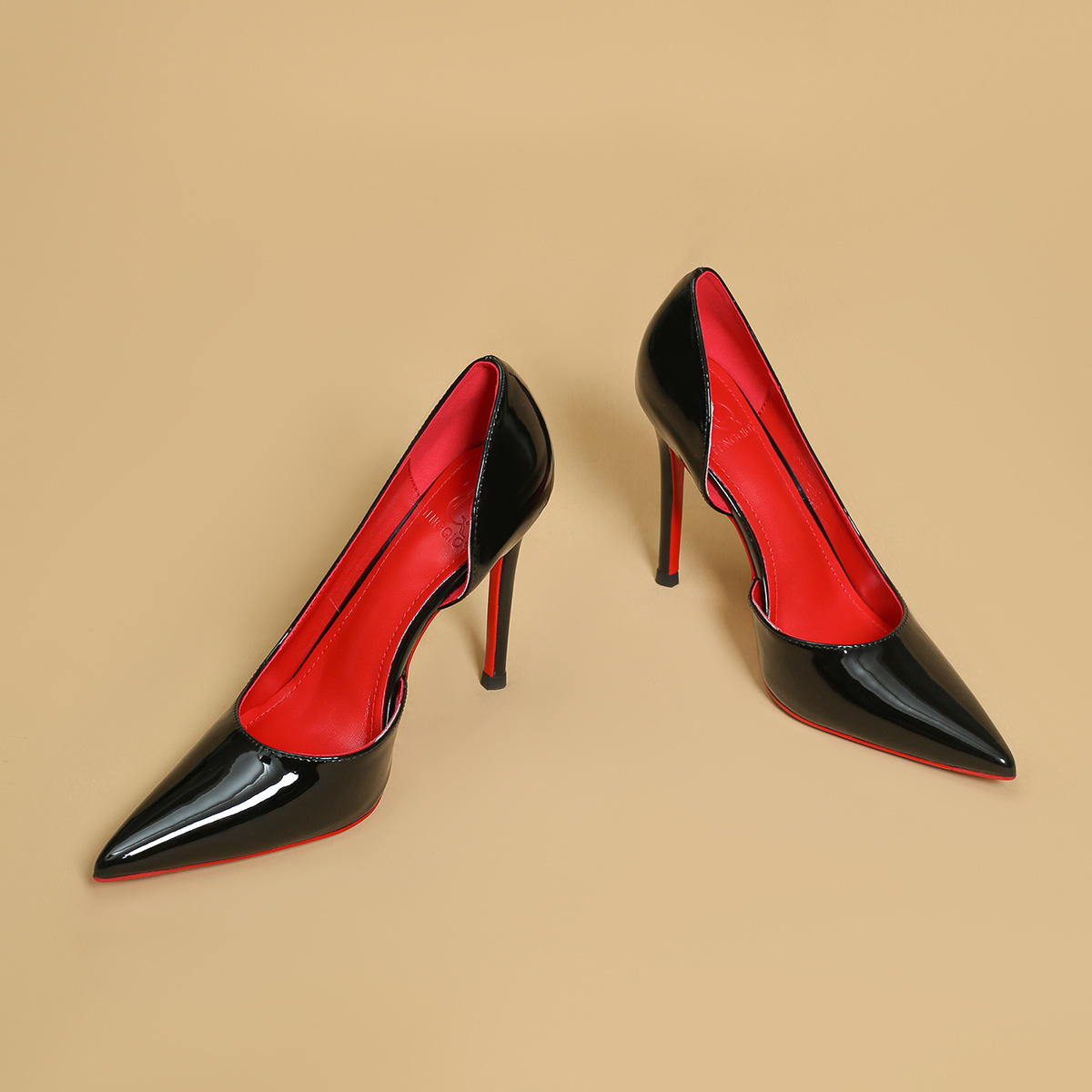여성을위한 측면 빈 빨간색 바닥 검은 하이힐 신발 2025 새로운 섹시한 기질 나이트 클럽 스틸레토 지적 발가락 특허 가죽 얕은 입 단일 신발스토어 가기