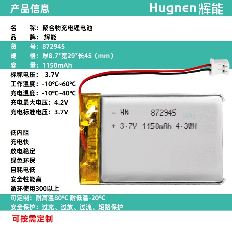 • 标称电压:  3.7V,可定制7.4V、11.1V