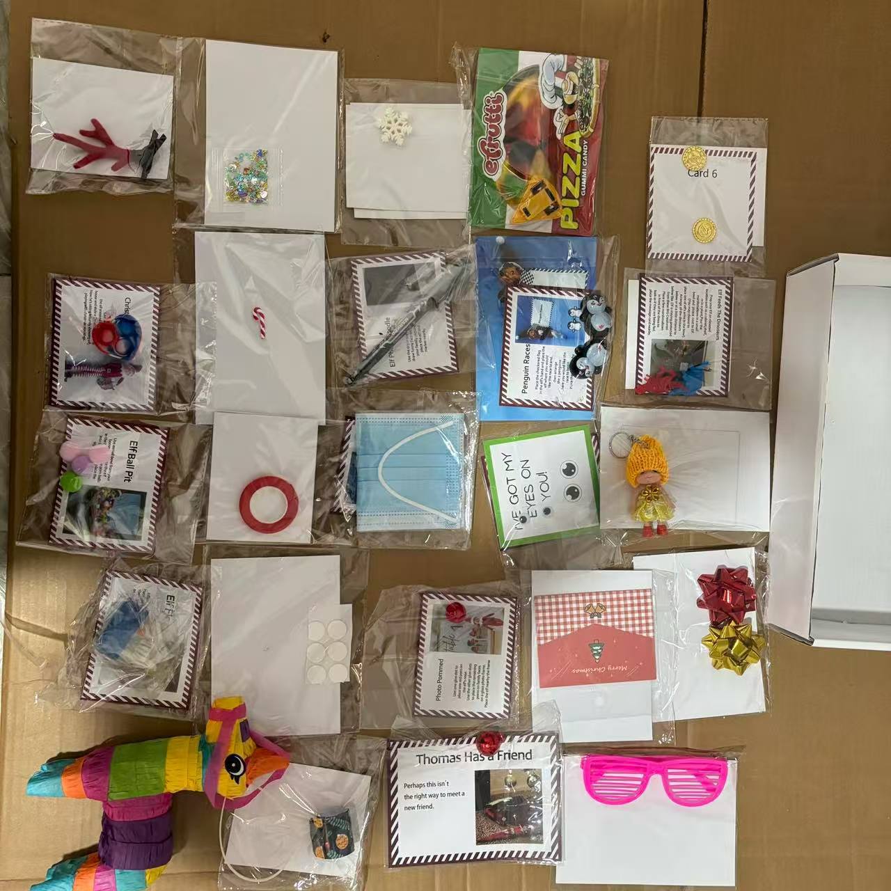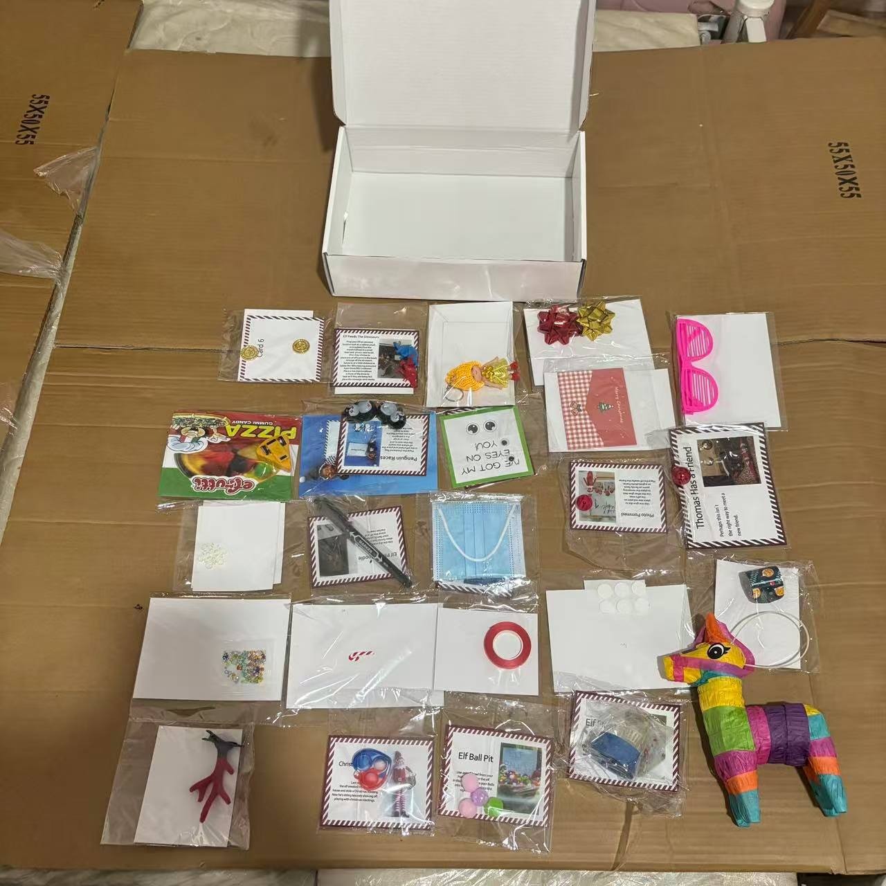 礼物有24个:高配对版出货,保证每套都有24个小礼物,而且我们配了小精灵!(内配仿真PIZZA+皮纳塔+小精灵+贺卡+各种配件道具,其中含有一个彩灯不带纽扣电池)