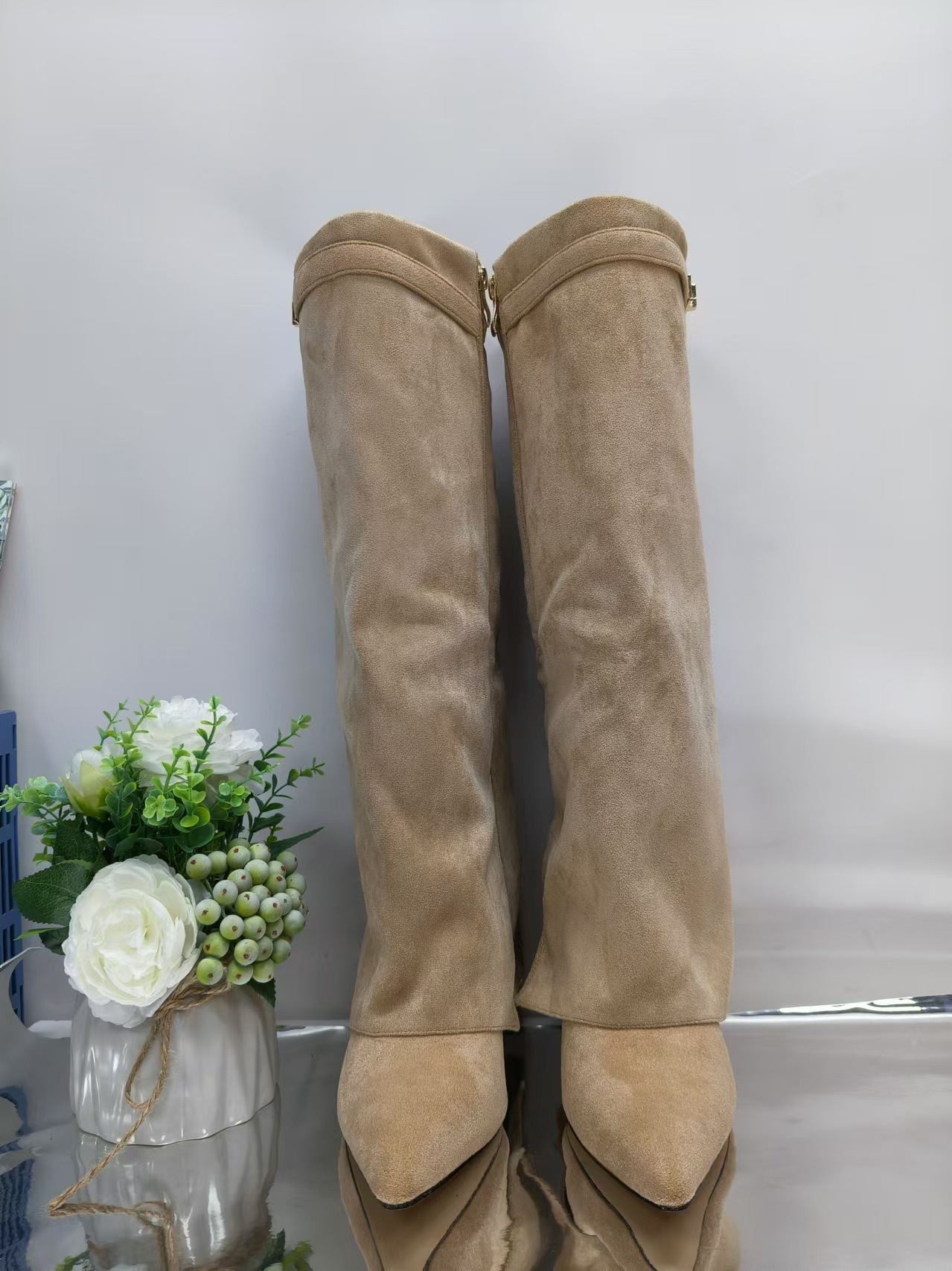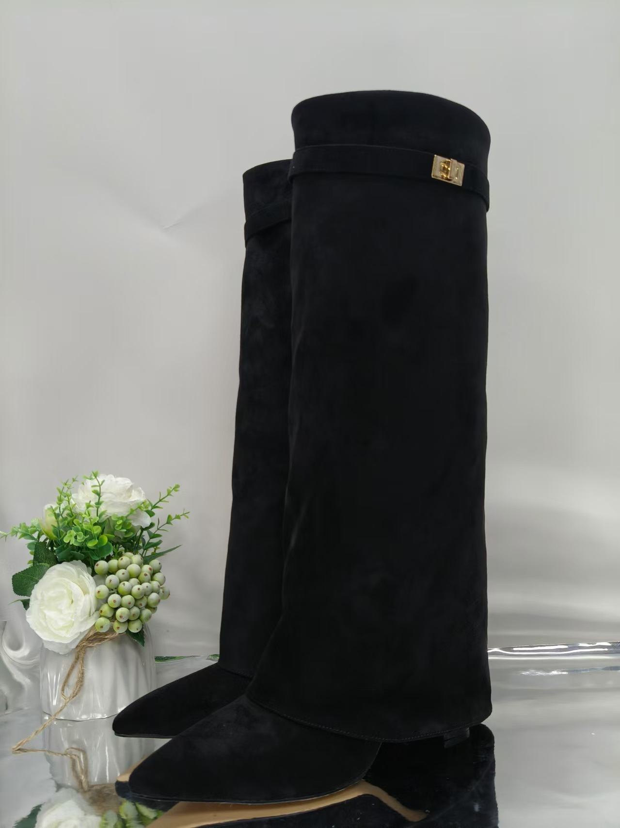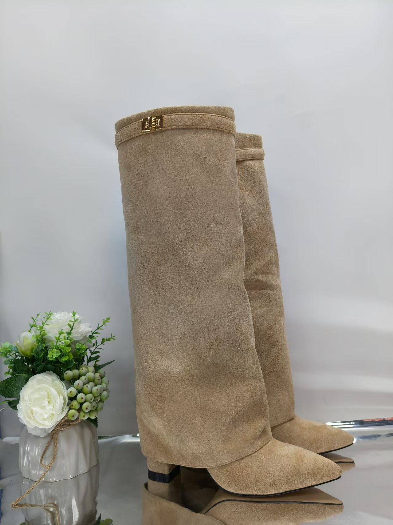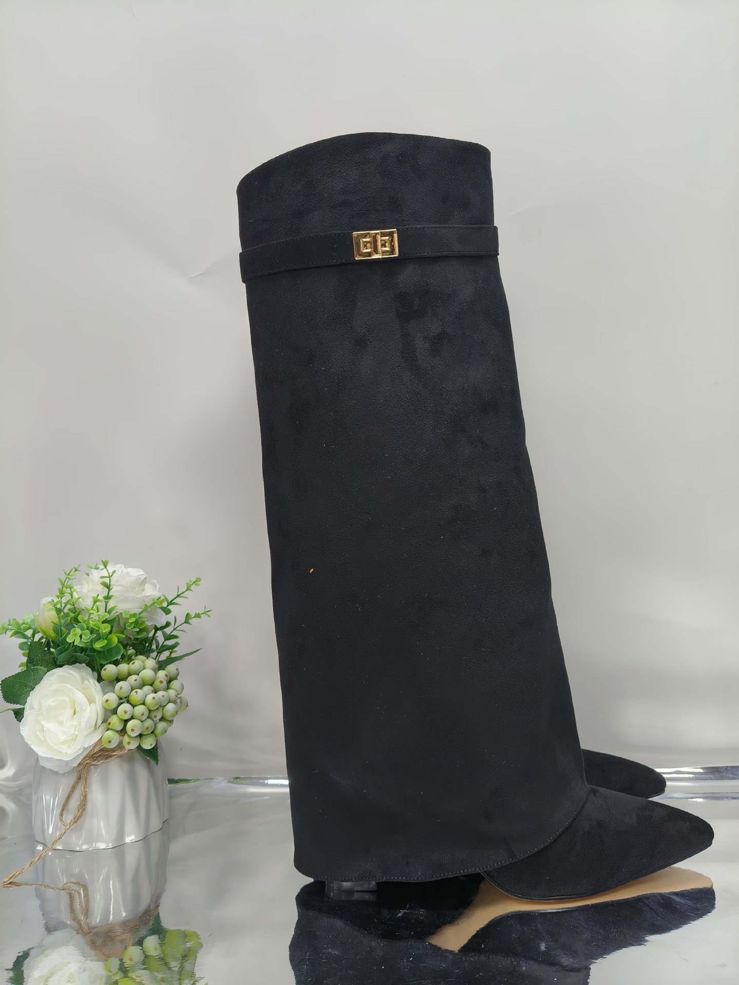 2025년 신상 대외 무역 스타일 포인티드 토 라지 사이즈 스트레이트 메탈 버클 중간 길이 부츠, 여성용 빅사이즈 두꺼운 굽 팬츠 부츠