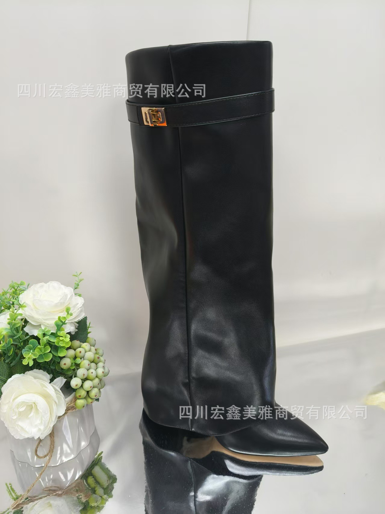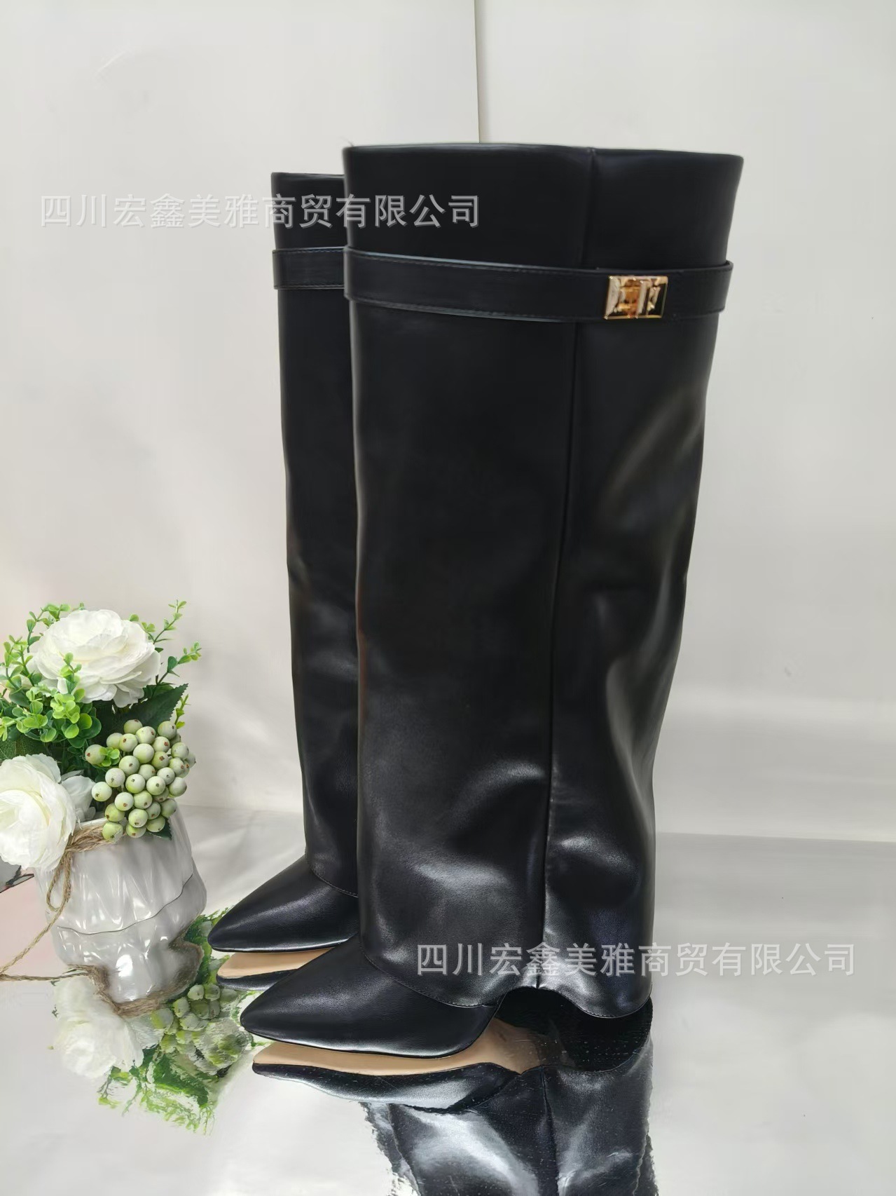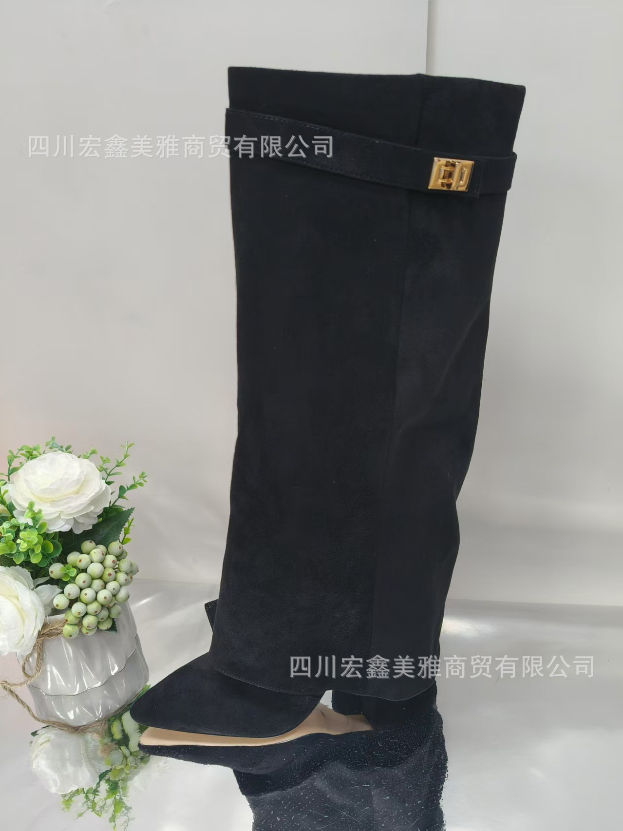 2025년 신상 대외 무역 스타일 포인티드 토 라지 사이즈 스트레이트 메탈 버클 중간 길이 부츠, 여성용 빅사이즈 두꺼운 굽 팬츠 부츠스토어 가기