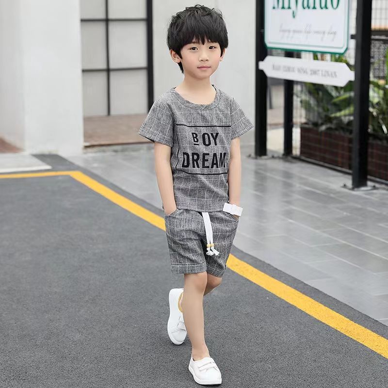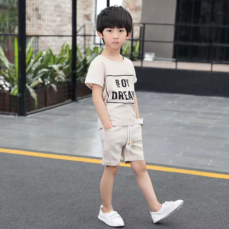 소년 캐주얼 정장 2024 여름 새로운 스타일 중대형 어린이 면화 및 린넨 잘 생긴 편지 반팔 반바지 인터넷 연예인 투피스 세트