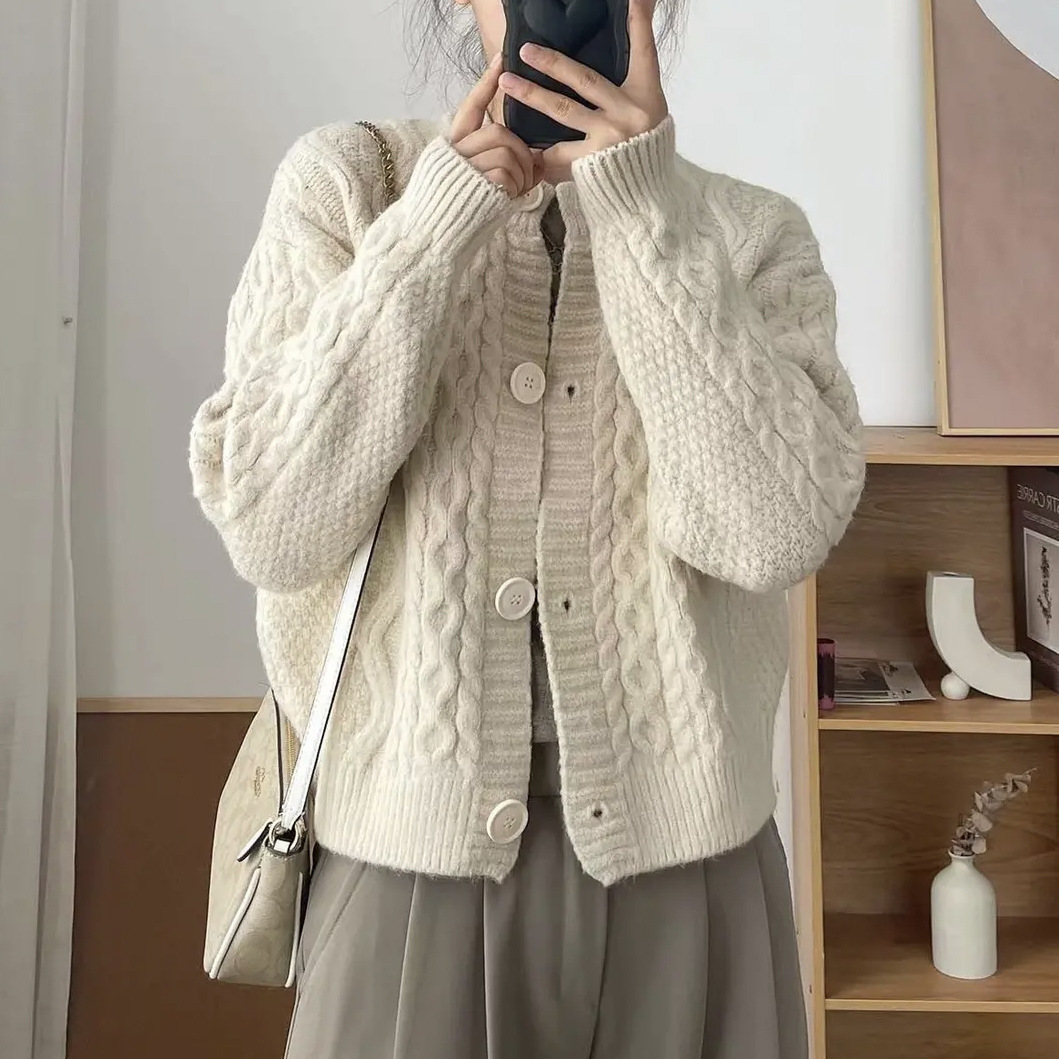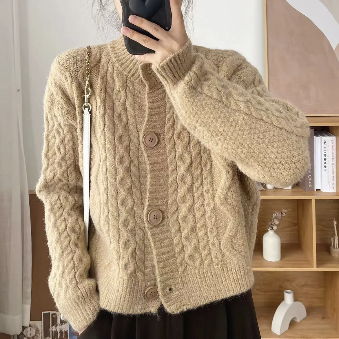 빈티지 트위스트 크루넥 스웨터 코트 여성의 가을과 겨울 새로운 느슨한 게으른 스타일 모든 일치 두꺼운 니트 카디건 탑
