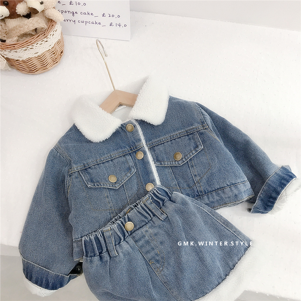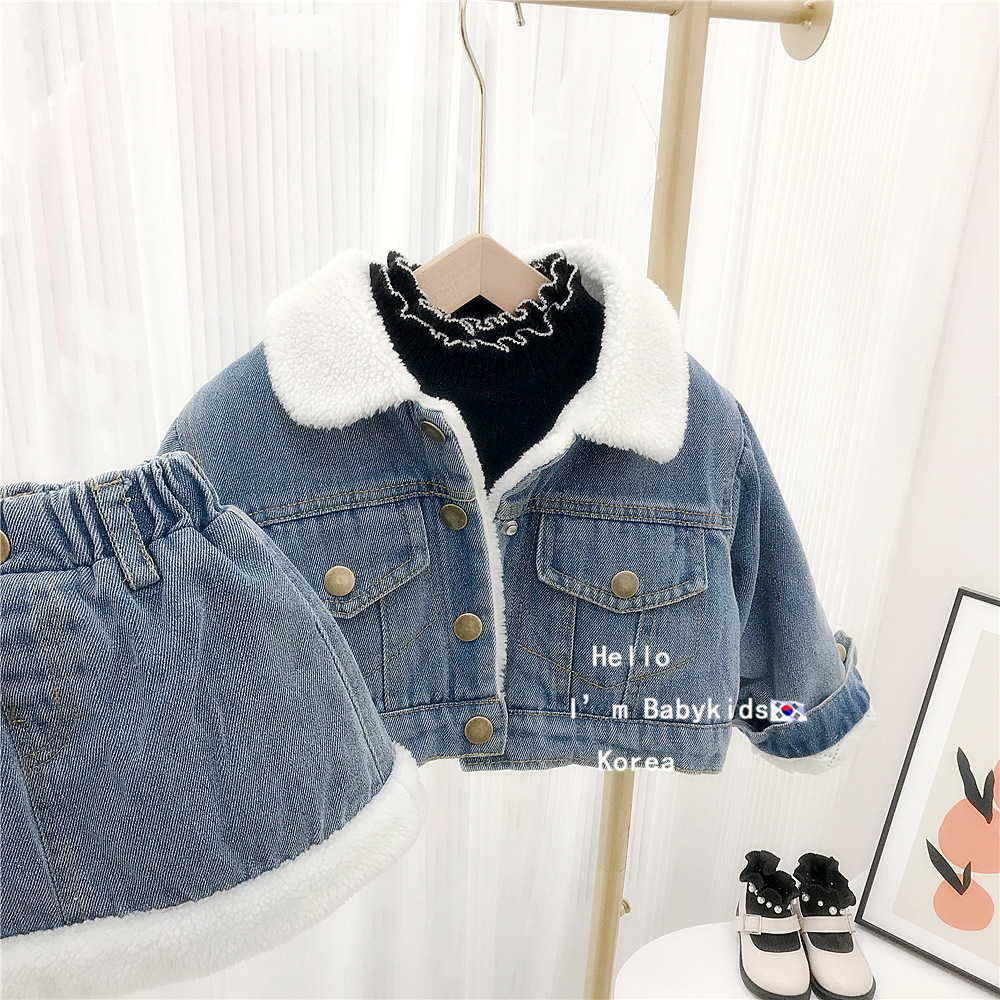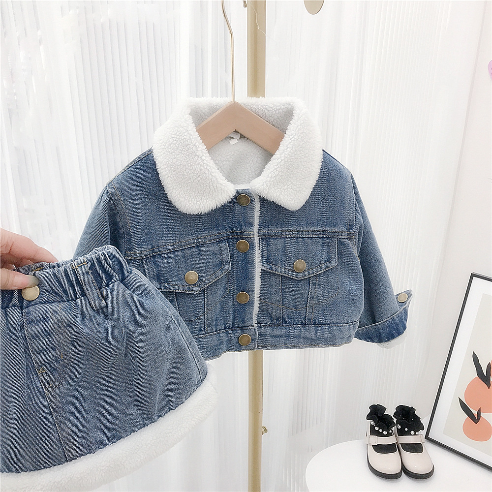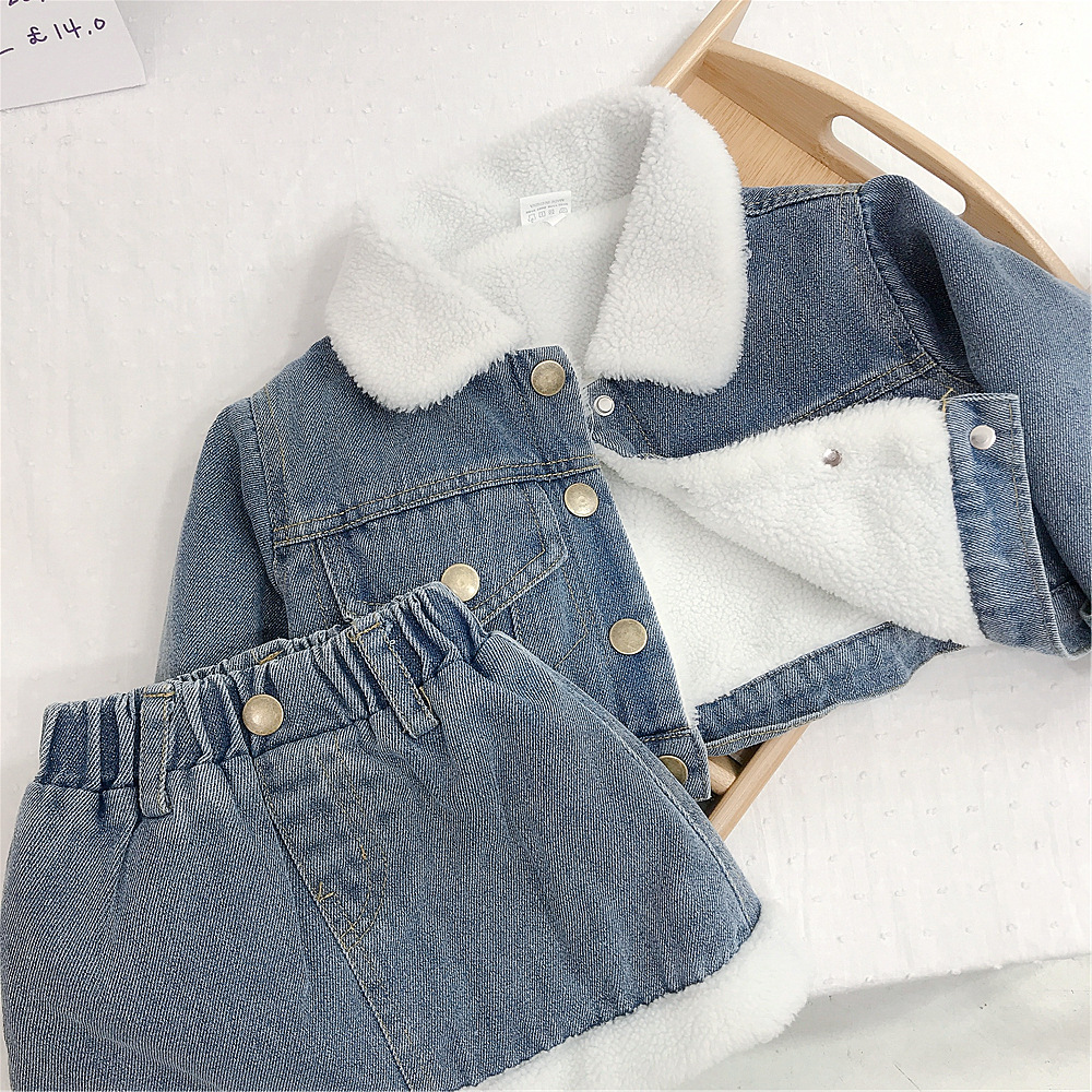 소녀의 데님 캐시미어 세트 서양식 겨울 의류 소녀의 아기 퀼트 오버 스커트 어린이 캐시미어 데님 두꺼운 코트스토어 가기