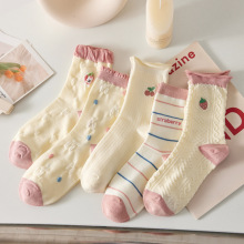 甜美简约中筒袜女卷边可爱樱桃百搭学院风竖条棉袜透气四季通用袜